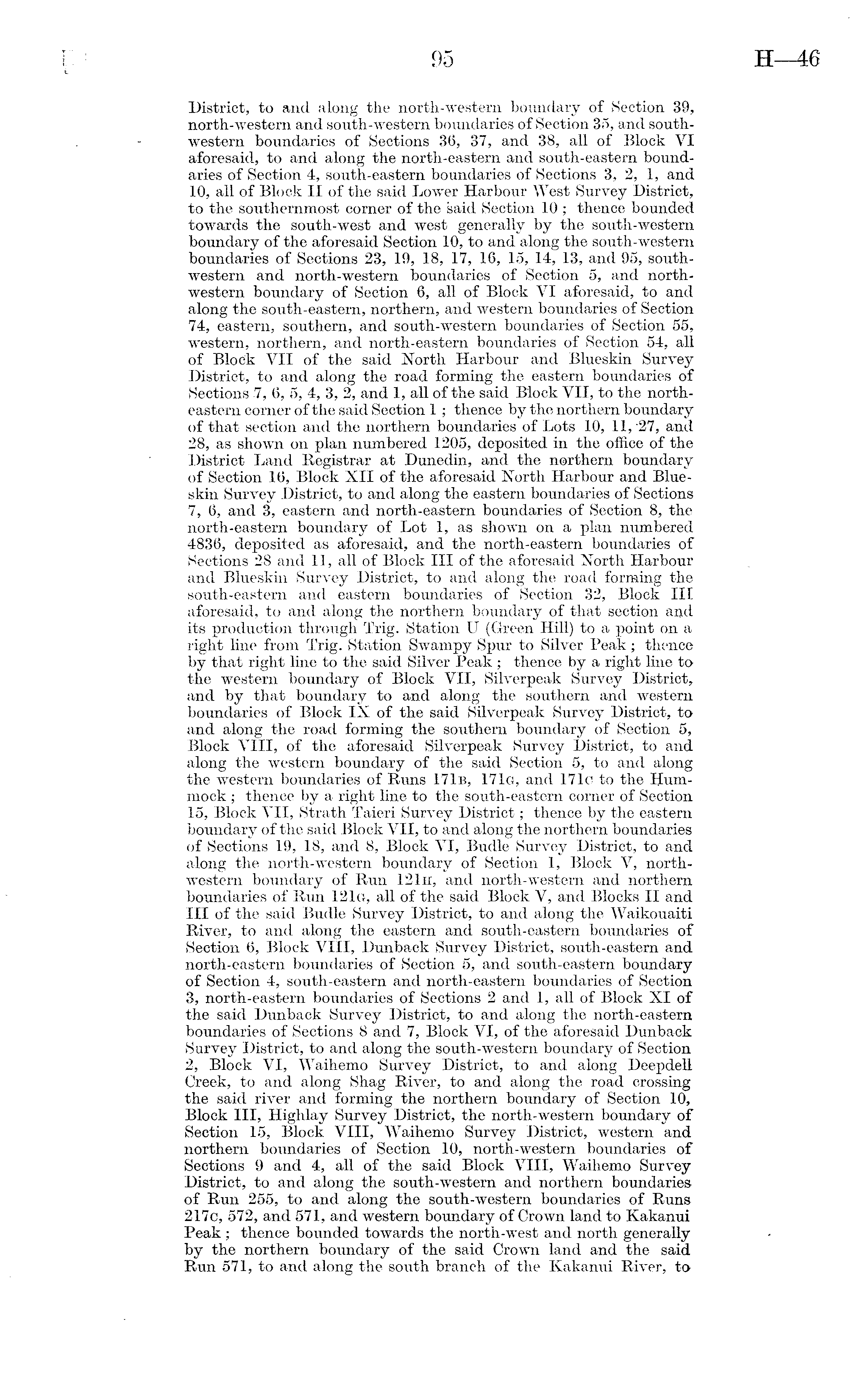 District, to and along the north-western boundary of Section 39, north-western and south-western boundaries of Section 35, and southwestern boundaries of Sections 36, 37, and 38, all of Block VI aforesaid, to and along the north-eastern and south-eastern boundaries of Section 4, south-eastern boundaries of Sections 3, 2, 1, and 10, all of Block II of the said Lower Harbour West Survey District, to the southernmost corner of the said Section 10 ; thence bounded towards the south-west and west generally by the south-western boundary of the aforesaid Section 10, to and along the south-western boundaries of Sections 23, 19, 18, 17, 16, 15, 14, 13, and 95, southwestern and north-western boundaries of Section 5, and northwestern boundary of Section 6, all of Block VI aforesaid, to and along the south-eastern, northern, and western boundaries of Section 74, eastern, southern, and south-western boundaries of Section 55, western, northern, and north-eastern boundaries of Section 54, all of Block VII of the said North Harbour and Blueskin Survey District, to and along the road forming the eastern boundaries of Sections 7, 6, 5, 4, 3, 2, and 1, all of the said Block VII, to the northeastern corner of the said Section 1 ; thence by the northern boundary of that section and the northern boundaries of Lots 10, 11, "27, and 28, as shown on plan numbered 1205, deposited in the office of the District Land Registrar at Dunedin, and the northern boundary of Section 16, Block XII of the aforesaid North Harbour and Blueskin Survey District, to and along the eastern boundaries of Sections 7, 6, and .3, eastern and north-eastern boundaries of Section 8, the north-eastern boundary of Lot 1, as shown on a plan numbered 4836, deposited as aforesaid, and the north-eastern boundaries of Sections 28 and 11, all of Block 111 of the aforesaid North Harbour and Blueskin Survey District, to and along the road forming the south-eastern and eastern boundaries of Section 32, Block 111 aforesaid, to and along the northern boundary of that section and its production through Trig. Station U (Green Hill) to a point on a right line from Trig. Station Swampy Spur to Silver Peak; thence by that right line to the said Silver Peak ; thence by a right line to the western boundary of Block VII, Silverpeak Survey District, and by that boundary to and along the southern and western boundaries of Block IX of the said Silverpeak Survey District, to and along the road forming the southern boundary of Section 5, Block VIII, of the aforesaid Silverpeak Survey District, to and along the western boundary of the said Section 5, to and along the western boundaries of Runs 171b, 171g, and 171 c to the Hummock ; thence by a right line to the south-eastern corner of Section 15, Block VII, Strath Taieri Survey District; thence by the eastern boundary of the said Block VII, to and along the northern boundaries of Sections 19, 18, and 8, Block VI, Budle Survey District, to and along the north-western boundary of Section 1, Block V, northwestern boundary of Run 121 h, and north-western and northern boundaries of Run 121g, all of the said Block V, and Blocks II and 111 of the said Budle Survey District, to and along the Waikouaiti River, to and along the eastern and south-eastern boundaries of Section 6, Block VIII, Dunback Survey District, south-eastern and north-eastern boundaries of Section 5, and south-eastern boundary of Section 4, south-eastern and north-eastern boundaries of Section 3, north-eastern boundaries of Sections 2 and 1, all of Block XI of the said Dunback Survey District, to and along the north-eastern boundaries of Sections 8 and 7, Block VI, of the aforesaid Dunback Survey District, to and along the south-western boundary of Section 2, Block VI, Waihemo Survey District, to and along Deepdell Creek, to and along Shag River, to and along the road crossing the said river and forming the northern boundary of Section 10, Block 111, Highlay Survey District, the north-western boundary of Section 15, Block VIII, Waihemo Survey District, western and northern boundaries of Section 10, north-western boundaries of Sections 9 and 4, all of the said Block VIII, Waihemo Survey District, to and along the south-western and northern boundaries of Run 255, to and along the south-western boundaries of Runs 217 c, 572, and 571, and western boundary of Crown land to Kakanui Peak ; thence bounded towards the north-west and north generally by the northern boundary of the said Crown land and the said Run 571, to and along the south branch of the Kakanui River, to