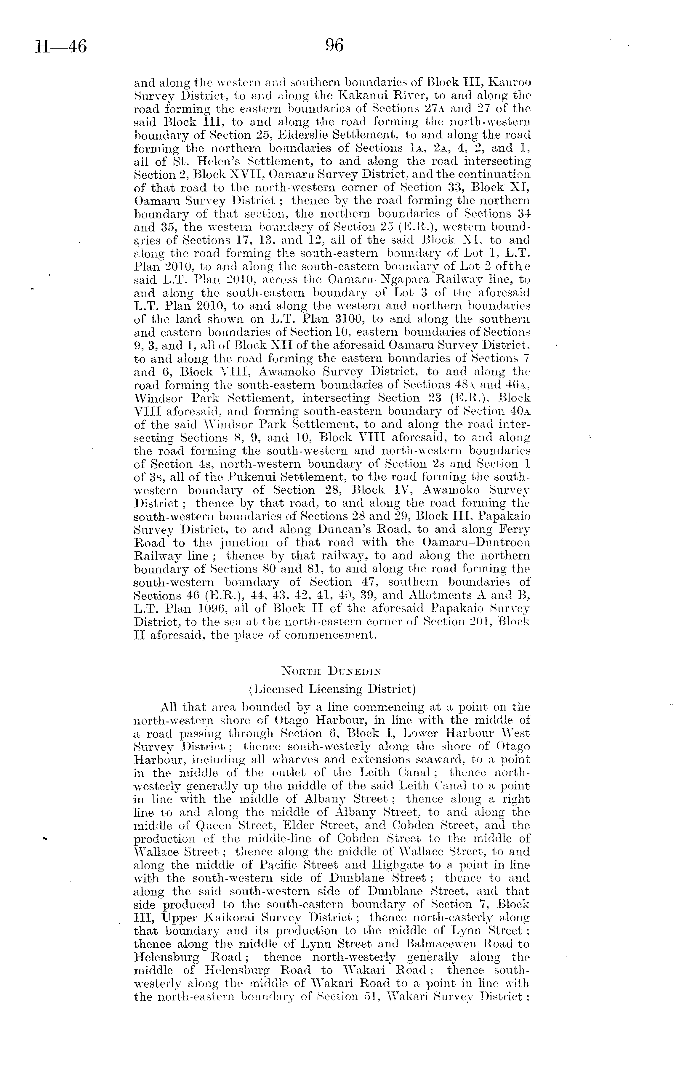 All that area bounded by a line commencing at a point on the north-western shore of Otago Harbour, in line with the middle of a road passing through Section 6, Block I, Lower Harbour West Survey District; thence south-westerly along the shore of Otago Harbour, including all wharves and extensions seaward, to a point in the middle of the outlet of the Leith Canal; thence northwesterly generally up the middle of the said Leith Canal to a point in line with the middle of Albany Street; thence along a right line to and along the middle of Albany Street, to and along the middle of Queen Street, Elder Street, and Cobden Street, and the production of the middle-line of Cobden Street to the middle of Wallace Street; thence along the middle of Wallace Street, to and along the middle of Pacific Street and Highgate to a point in line with the south-western side of Dunblane Street; thence to and along the said south-western side of Dunblane Street, and that side produced to the south-eastern boundary of Section 7, Block 111, Upper Kaikorai Survey District; thence north-easterly along that boundary and its production to the middle of Lynn Street; thence along the middle of Lynn Street and Balmacewen Road to Helensburg Road; thence north-westerly generally along the middle of Helensburg Road to Wakari Road; thence southwesterly along the middle of Wakari Road to a point in line with the north-eastern boundary of Section 51, Wakari Survey District;