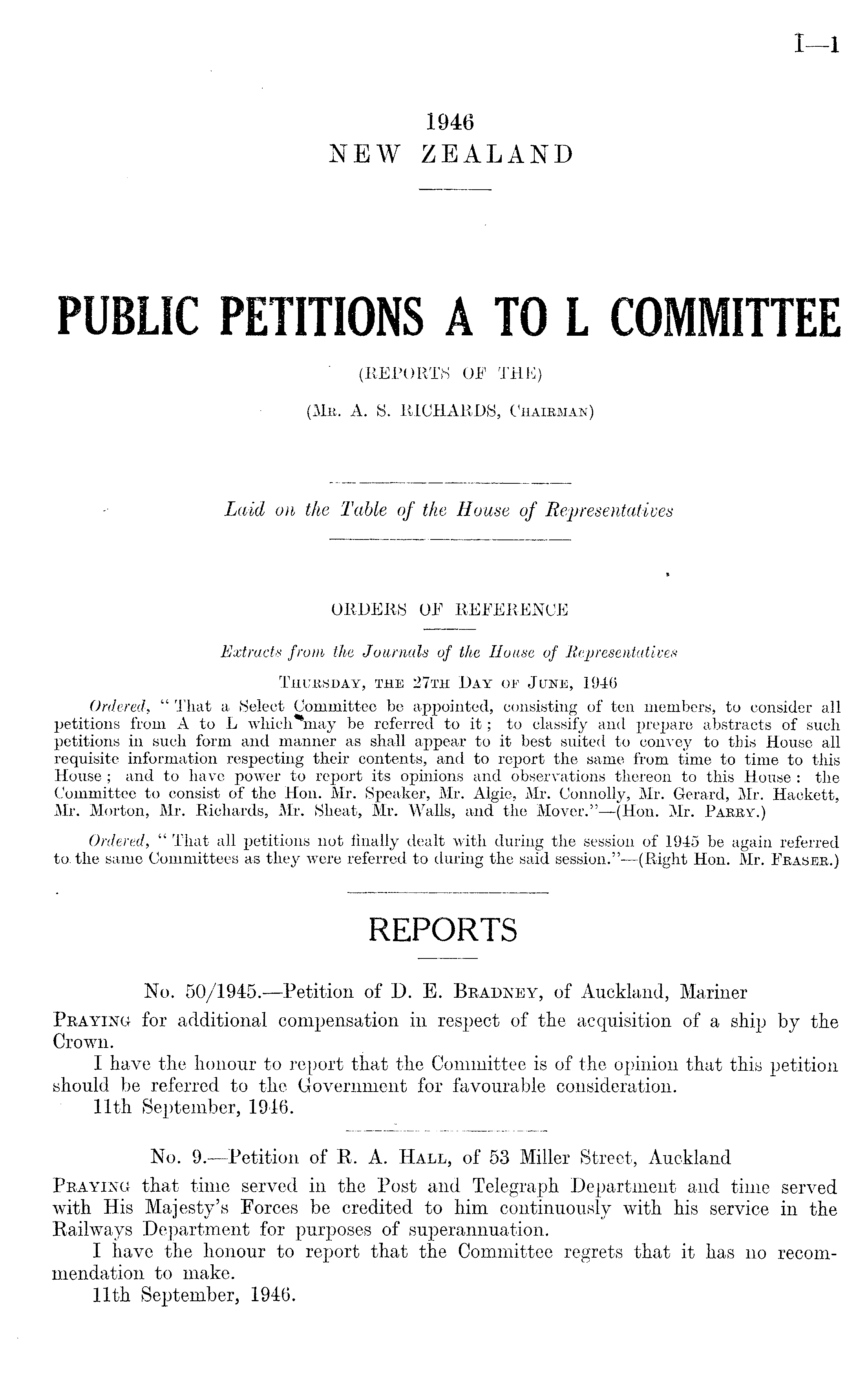 No. 50/1945.—Petition of D. E. Beadney, of Auckland, Mariner Peaying for additional compensation in respect of the acquisition of a ship by the Crown. I have the honour to report that the Committee is of the opinion that this petition should be referred to the Government for favourable consideration. ■ 11th September, 1946.