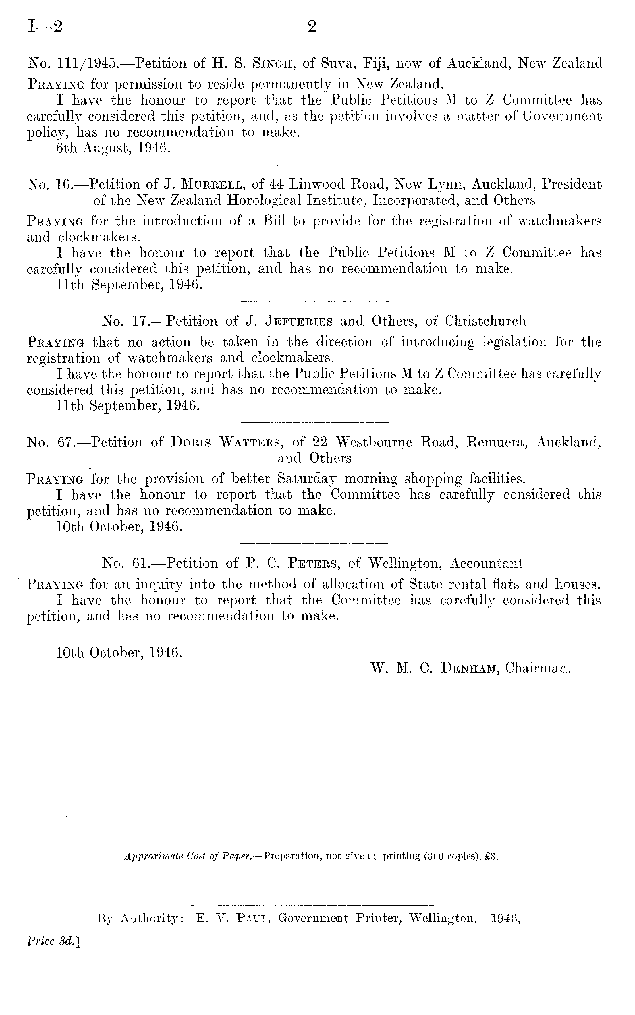 No. 17.—Petition of J. Jefferies and Others, of Christchurch Praying that no action be taken in the direction of introducing legislation for the registration of watchmakers and clockmakers. I have the honour to report that the Public Petitions M to Z Committee has carefully considered this petition, and has no recommendation to make. 11th September, 1946.