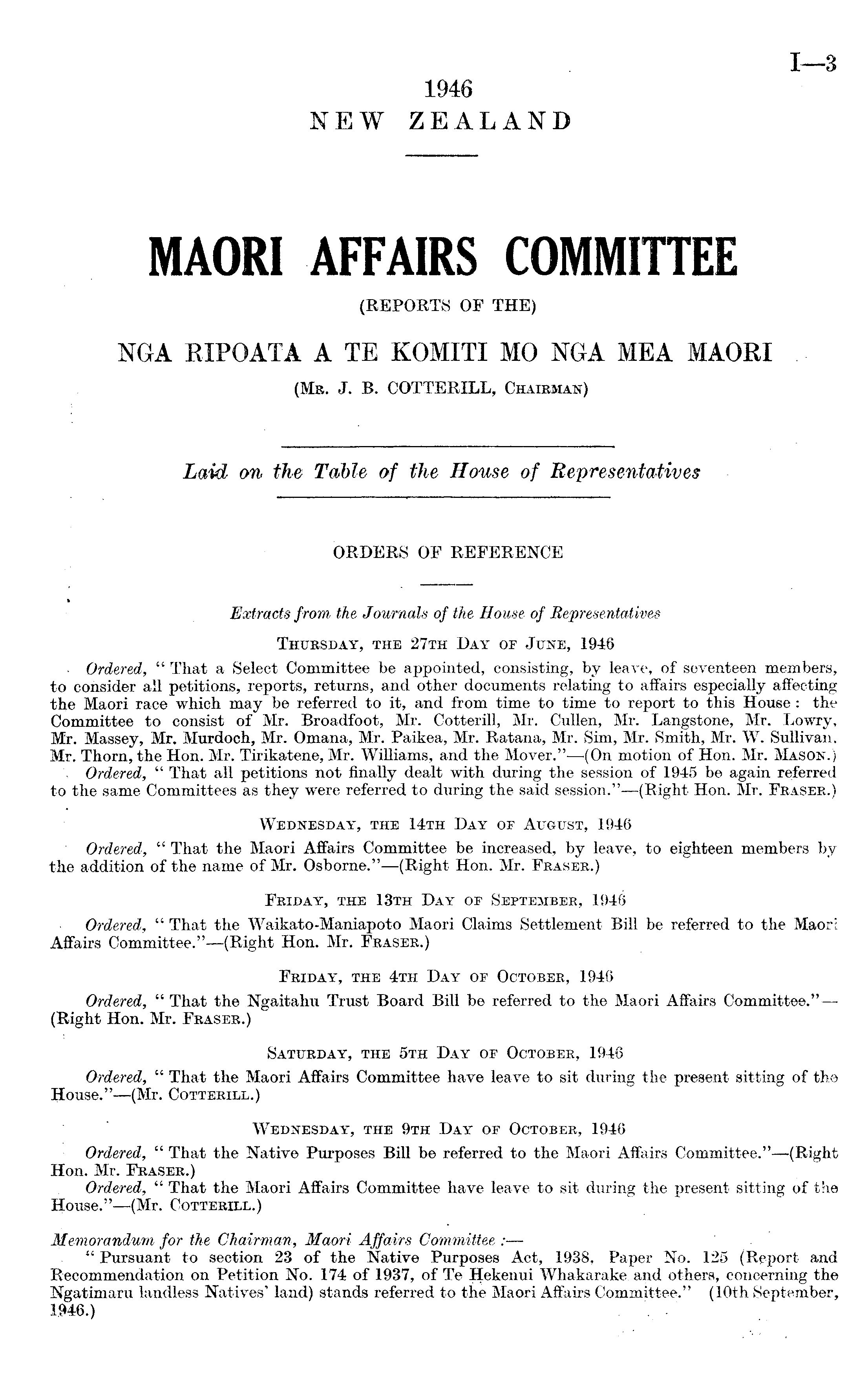 Extracts from the Journals of the House of Representatives Thursday, the 27th Day op June, 1946 Ordered, " That a Select Committee be appointed, consisting, by leave, of seventeen members, to consider all petitions, reports, returns, and other documents relating to affairs especially affecting the Maori race which may be referred to it, and from time to time to report to this House : the Committee to consist of Mr. Broadfoot, Mr. Cotterill, Mr. Cullen, Mr. Langstone, Mr. Lowry, Mr. Massey, Mr. Murdoch, Mr. Omana, Mr. Paikea, Mr. Ratana, Mr. Sim, Mr. Smith, Mr. W. Sullivan, Mr, Thom, the Hon. Mr. Tirikatene, Mr. Williams, and the Mover."—(On motion of Hon. Mr. Mason.) Ordered, " That all petitions not finally dealt with during the session of 1945 be again referred to the same Committees as they were referred to during the said session."—(Right Hon. Mr. Fraser.) Wednesday, the 14th Day of August, 1946 Ordered, " That the Maori Affairs Committee be increased, by leave, to eighteen members by the addition of the name of Mr. Osborne."—(Right Hon. Mr. Fraser.) Friday, the 13th Day of September, 1946 Ordered, " That the Waikato-Maniapoto Maori Claims Settlement Bill be referred to the Maori Affairs Committee."—(Right Hon. Mr. Fraser.) Friday, the 4th Day of October, 1946 Ordered, " That the Ngaitahu Trust Board Bill be referred to the Maori Affairs Committee."— (Right Hon. Mr. Fraser.) Saturday, the sth Day of October, 1946 Ordered, " That the Maori Affairs Committee have leave to sit during the present sitting of the House."—(Mr. Cotterill.) Wednesday, the 9th Day of October, 1946 Ordered, " That the Native Purposes Bill be referred to the Maori Affairs Committee."—(Right Hon. Mr. Fraser.) Ordered, " That the Maori Affairs Committee have leave to sit during the present sitting of the House." —(Mr. Cotterill.) Memorandum for the Chairman, Maori Affairs Committee : " Pursuant to section 23 of the Native Purposes Act, 1938, Paper No. 125 (Report and Recommendation on Petition No. 174 of 1937, of Te Hekenui Whakarake and others, concerning the Ngatimaru landless Natives' land) stands referred to the Maori Affairs Committee." (10th September, 1946.)