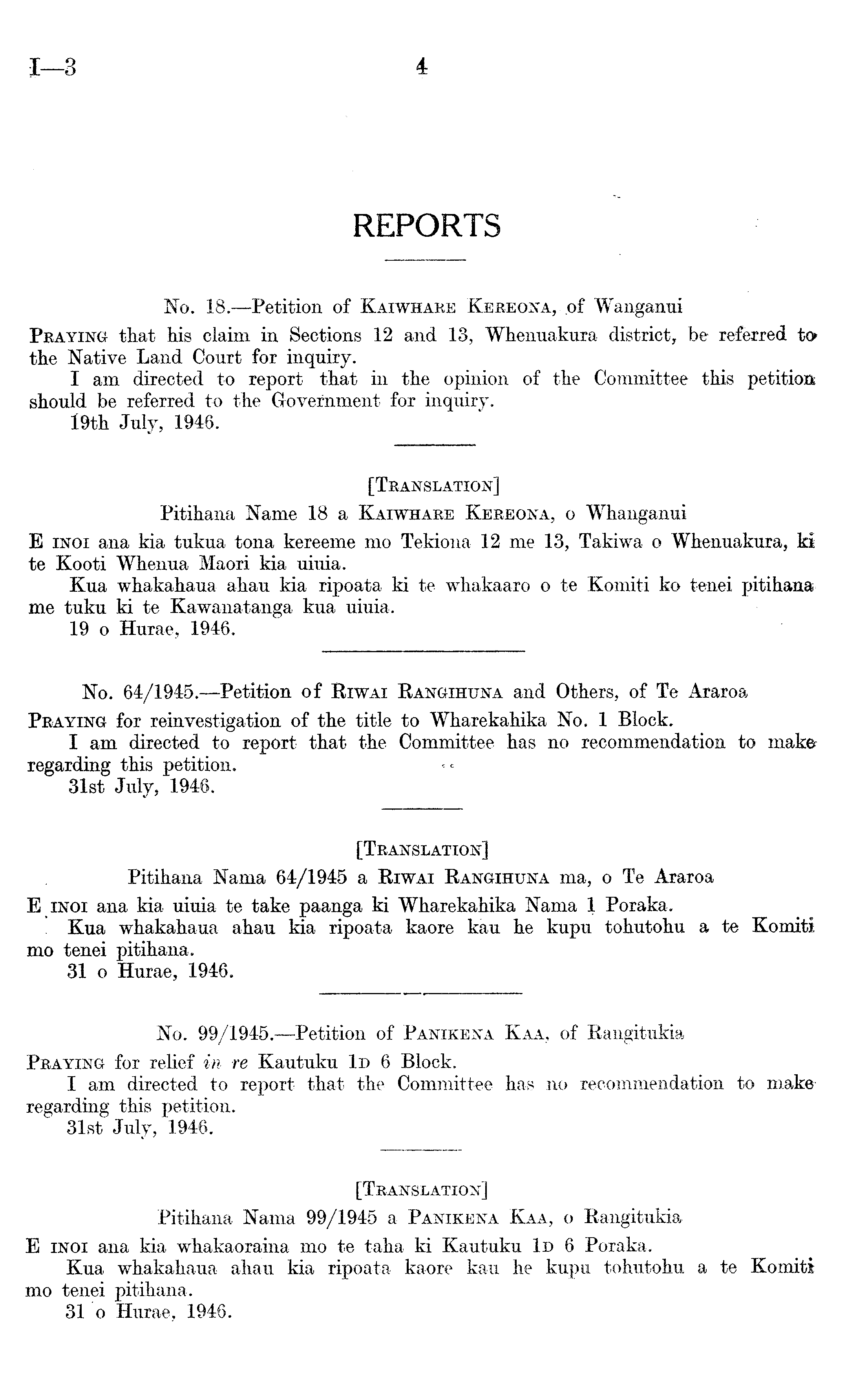 [Translation] Pitihana Name 18 a Kaiwhare Kereona, o Whanganui E inoi ana kia tukua tona kereeme mo Tekiona 12 me 13, Takiwa o Whenuakura, ki te Kooti Whenua Maori kia uiuia. Kua whakahaua ahau kia ripoata kite whakaaro o te Komiti ko tenei pitihana me tuku kite Kawanatanga kua uiuia. 19 o Hurae, 1946.