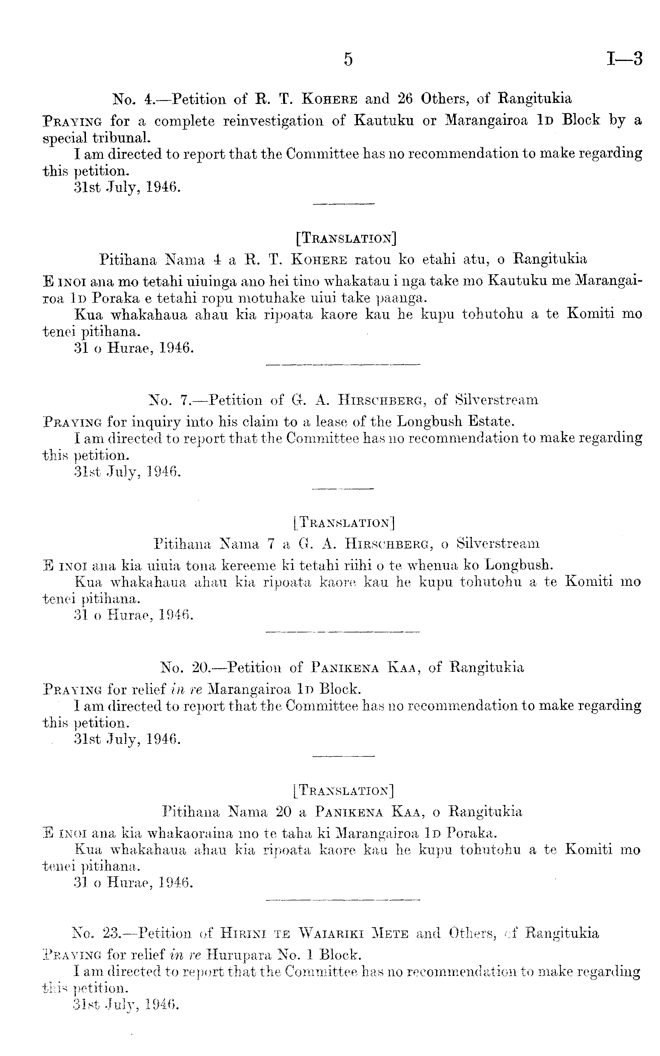 [Translation] Pitihana Nama 20 a Panikena Kaa, o Rangitukia E Inoi ana kia whakaoraina mo te taha ki Marangairoa Id Poraka. Kua whakahaua ahau kia ripoata kaore kau he kupu tohutohu a te Komiti mo tenei pitihana. 31 o Hurae, 1946.