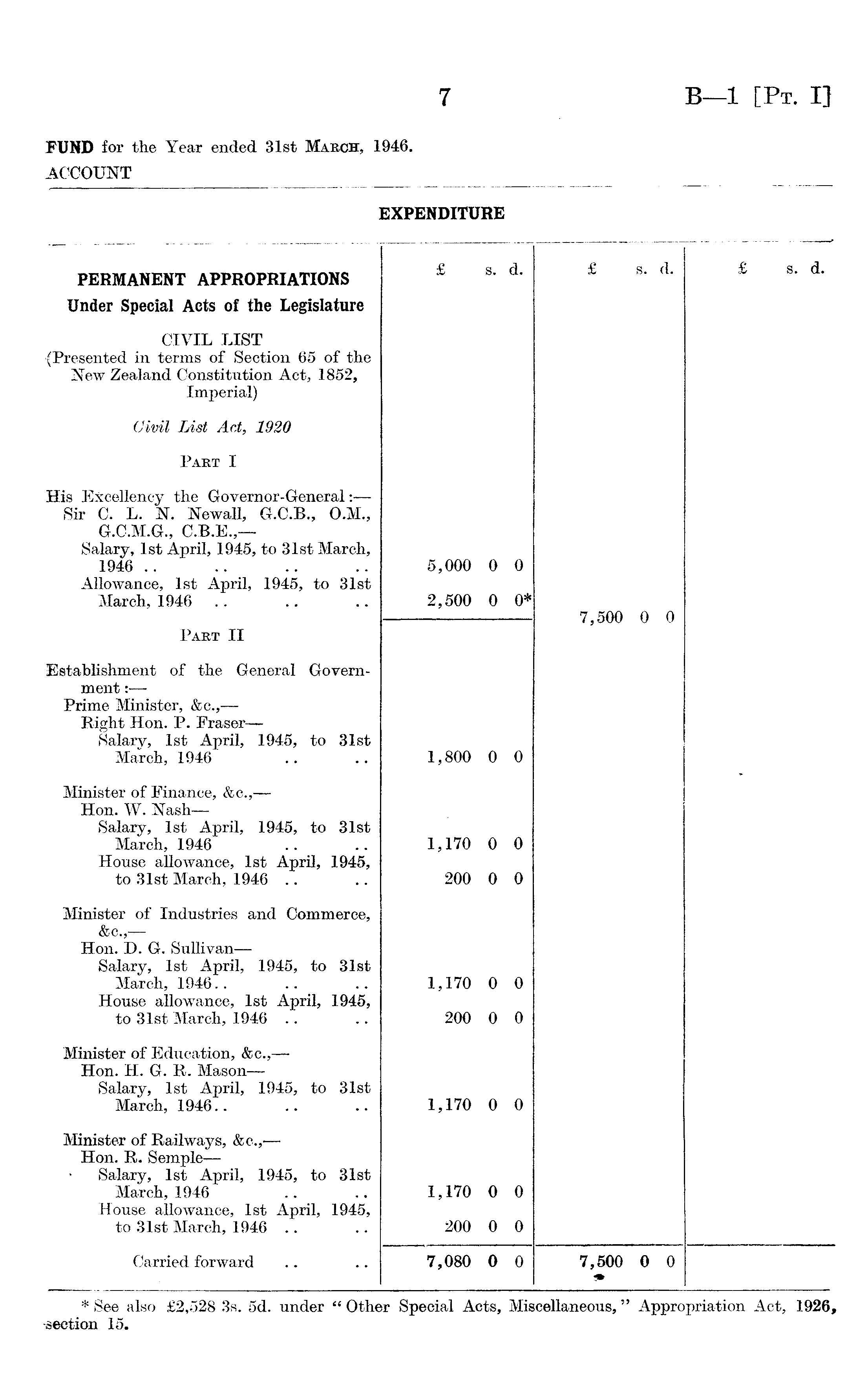 EXPENDITURE PERMANENT APPROPRIATIONS Under Special Acts of the Legislature £ s. d. £ s. d. £ s. d. CIVIL LIST {Presented in terms of Section 65 of the New Zealand Constitution Act, 1852, Imperial) Civil List Act, 1920 Part I His Excellency the Governor-General:— Sir C. L. N. Newall, G.C.B., O.M., G.C.M.G., C.B.E., — Salary, 1st April, 1945, to 31st March, 1946 .. Allowance, 1st April, 1945, to 31st March, 1946 .. 5,000 2,500 0 0 0 0* 7,500 0 0 Pabt II Establishment of the General Government : — Prime Minister, &c., — Right Hon. P. Fraser — Salary, 1st April, 1945, to 31st March, 1946 1,800 0 0 Minister of Finance, &c., — Hon. W. Nash— Salary, 1st April, 1945, to 31st March, i946 House allowance, 1st April, 1945, to 31st March, 1946 1,170 200 0 0 0 0 Minister of Industries and Commerce, &c., — Hon. D. G. Sullivan— Salary, 1st April, 1945, to 31st March, 1946.. House allowance, 1st April, 1945, to 31st March, 1946 1,170 200 0 0 0 0 Minister of Education, &c., — Hon. H. G. R. Mason — Salary, 1st April, 1945, to 31st March, 1946.. 1,170 0 0 Minister of Railways, &c., — Hon. R. Semple— Salary, 1st April, 1945, to 31st March, 1946 House allowance, 1st April, 1945, to 31st March, 1946 1,170 200 0 0 0 0 Carried forward 7,080 0 0 7,500 «» 0 0