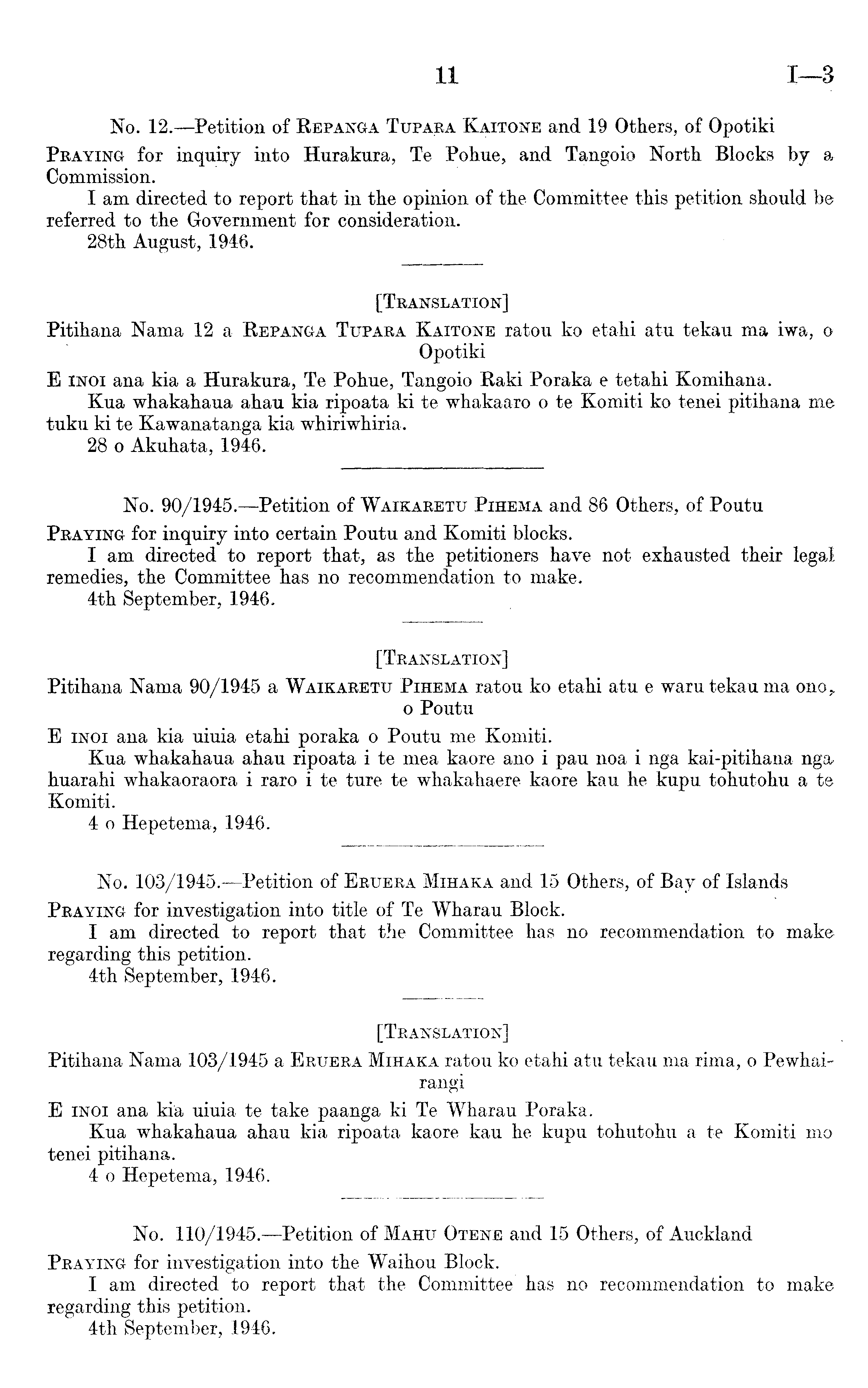 [Translation] Pitihana Nama 103/1945 a Eruera Mihaka ratou ko etahi atu tekau ma rima, o Pewhairangi E inoi ana kia uiuia te take paanga ki Te Wharau Poraka. Kua whakahaua ahau kia ripoata kaore kau he kupu tohutohu a te Komiti mo tenei pitihana. 4 o Hepetema, 1946.