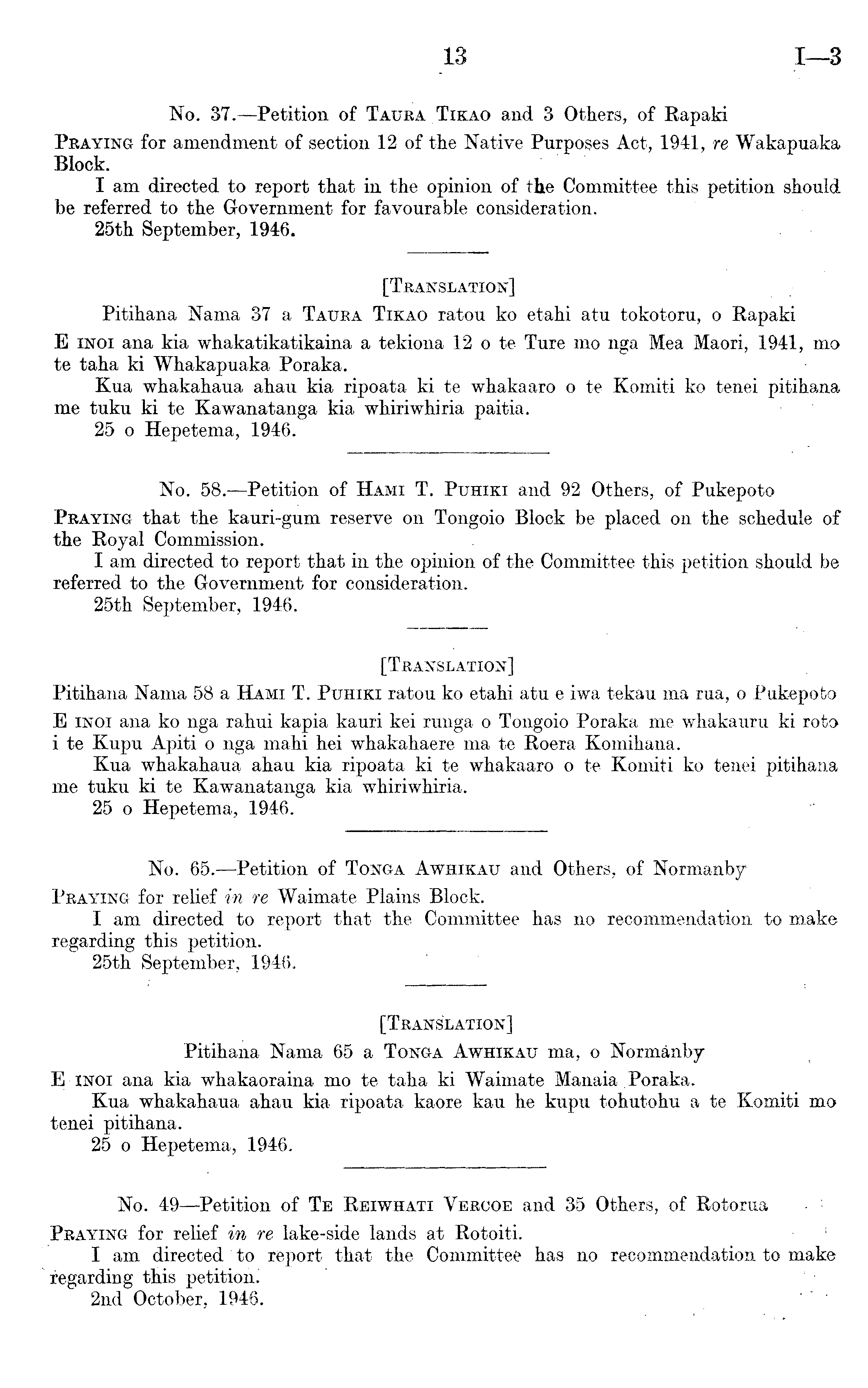 [Translation] Pitihana Nama 37 a Taura Tikao ratou ko etahi atu tokotoru, o Rapaki E inoi ana kia whakatikatikaina a tekiona 12 o te Ture mo nga Mea Maori, 1941, mo te taha ki Whakapuaka Poraka. Kua whakahaua ahau kia ripoata kite whakaaro o te Komiti ko tenei pitihana me tuku kite Kawanatanga kia whiriwhiria paitia. 25 o Hepetema, 1946.