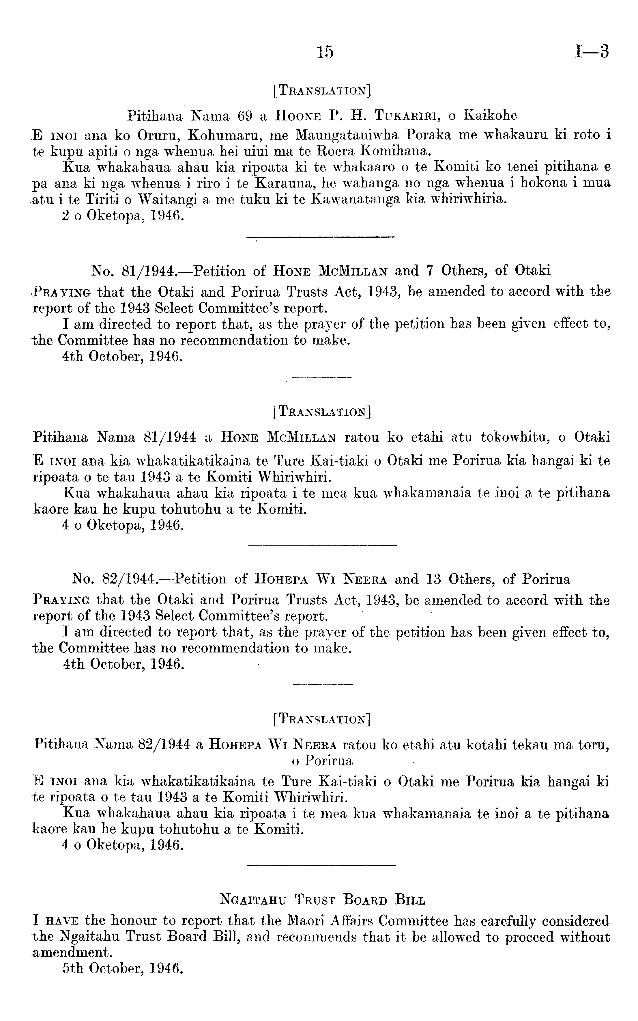 No. 81/1944. —Petition of Hone McMillan and 7 Others, of Otaki Praying that the Otaki and Porirua Trusts Act, 1943, be amended to accord with the report of the 1943 Select Committee's report. I am directed to report that, as the prayer of the petition has been given effect to, the Committee has no recommendation to make. 4th October, 1946.