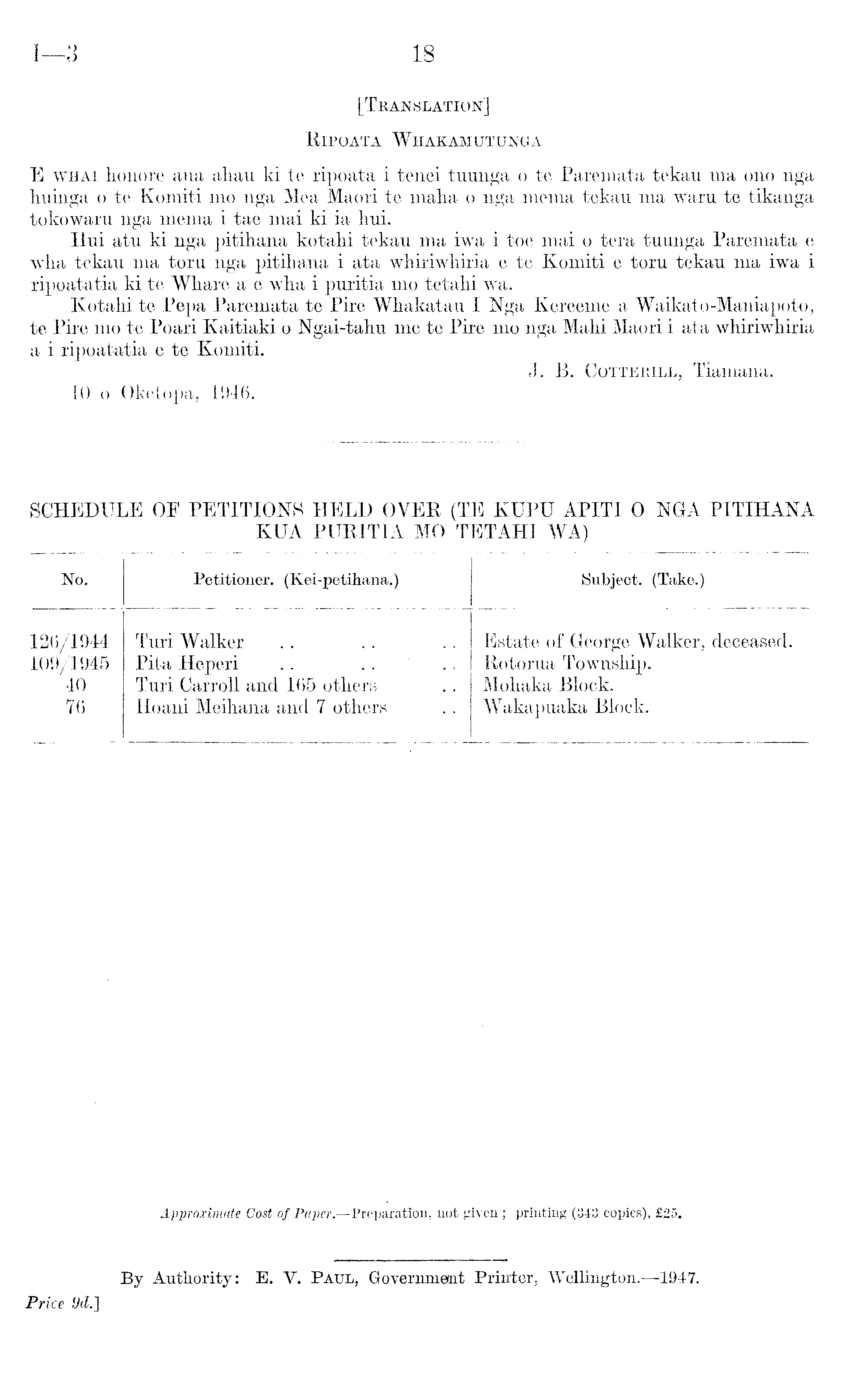 [Translation] Ripoata Whakamutunga E whai honore ana ahau kite ripoata i tenei tuunga o te Paremata tekau ma ono nga huinga o te Komiti mo nga Mea Maori te malia o nga mema tekan ma warn te tikanga tokowaru nga mema i tae mai ki ia hui. Hui atu ki nga pitihana kotahi tekan ma iwa i toe mai o tera tuunga Paremata e wlia tekau ma toru nga pitihana i ata whiriwhiria e te Komiti e toru tekau ma iwa i ripoatatia kite Whare a e wha i puritia mo tetahi wa. Kotahi te Pepa Paremata te Pire Whakatau I Nga Kereeme a Waikato-Maniapoto, te Pire mo te Poari Kaitiaki o Ngai-tahu mete Pire mo nga Mahi Maori i ata whiriwhiria a i ripoatatia e te Komiti. J. B. Cotterill, Tiamana. 10 o Oketopa, 1946.