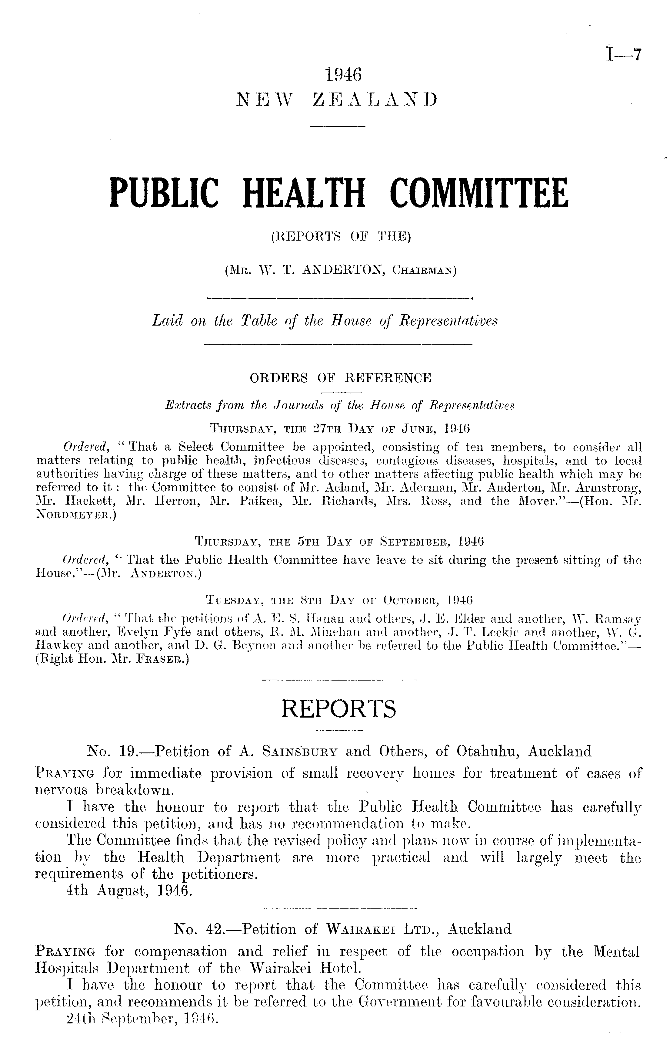 Extracts from the Journals of the House of Representatives Thursday, the 27th Day of June, 1946 Ordered, " That a Select Committee be appointed, consisting of ten members, to consider all matters relating to public health, infectious diseases, contagious diseases, hospitals, and to local authorities having charge of these matters, and to other matters affecting public health which may be referred to it: the Committee to consist of Mr. Acland, Mr. Aderman, Mr. Anderton, Mr. Armstrong, Mr. Hackett, Mr. Herron, Mr. Paikea, Mr. Richards, Mrs. Ross, and the Mover."—(Hon. Mr. Nordmeyer.) Thursday, the sth Day op September, 1946 Ordered, " That the Public Health Committee have leave to sit during the present sitting of the House."—(Mr. Anderton.) Tuesday, the Bth Day op October, 1946 Ordered, " That the petitions of A. E. S. Hanan and others, J. E. Elder and another, W. Ramsay and another, Evelyn Fyfe and others, R. M. Minehan and another, J. T. Leckie and another, W. G. Hawkey and another, and D. G. Beynon and another be referred to the Public Health Committee."—■ (Right Hon. Mr. Fraser.)