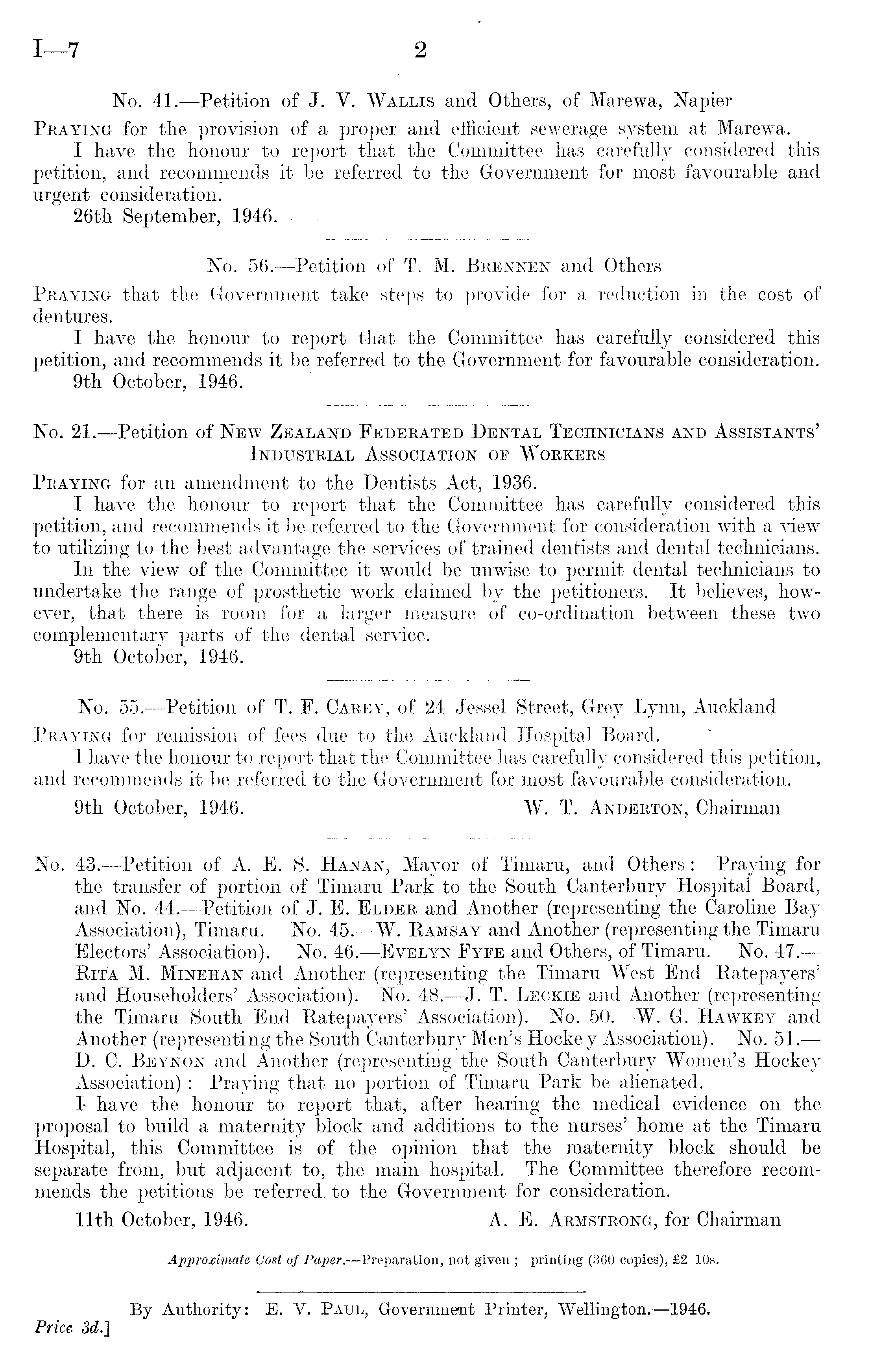 No. 55.—Petition of T. F. Carey, of 24 Jessel Street, Grey Lynn, Auckland Praying for remission of fees due to the Auckland Hospital Board. I have the honour to report that the Committee has carefully considered this petition, and recommends it be referred to the Government for most favourable consideration. 9th October, 1946. W. T. Anderton, Chairman