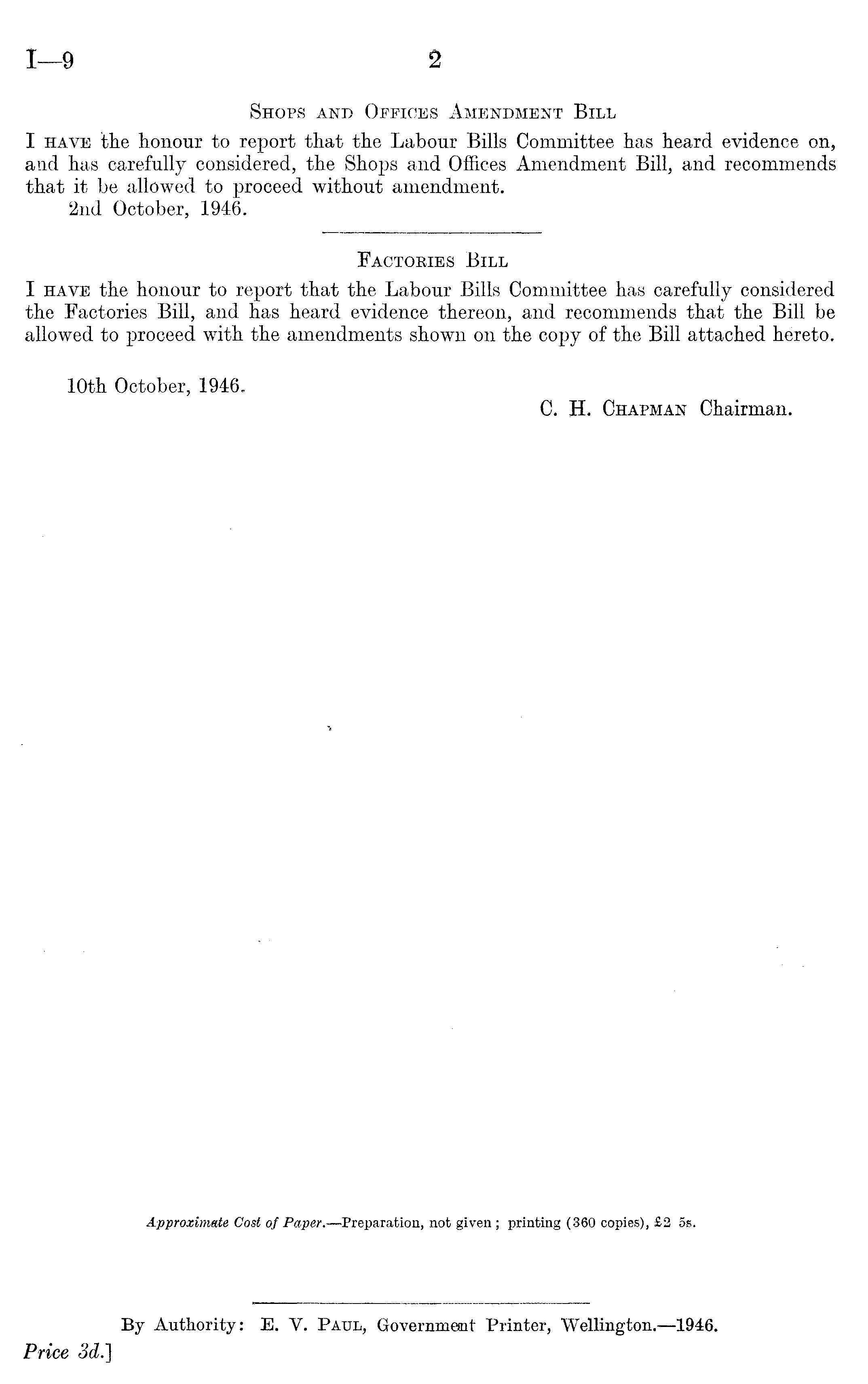Shops and Offices Amendment Bill I have the honour to report that the Labour Bills Committee has heard evidence on, and has carefully considered, the Shops and Offices Amendment Bill, and recommends that it be allowed to proceed without amendment. 2nd October, 1946.