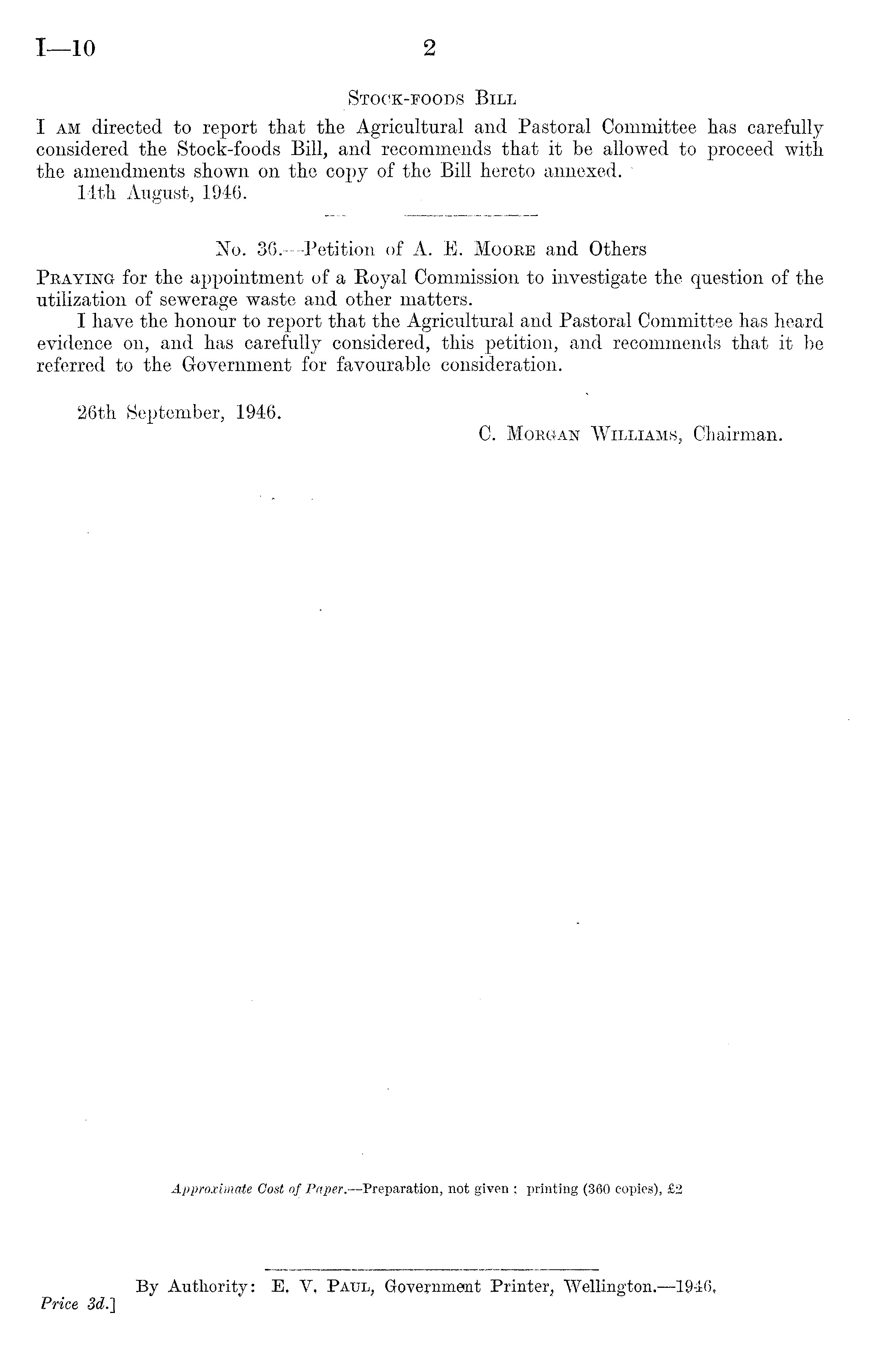 No. 36.—Petition of A. E. Mooee and Others Praying for the appointment of a Royal Commission to investigate the question of the utilization of sewerage waste and other matters. I have the honour to report that the Agricultural and Pastoral Committee has heard evidence on, and has carefully considered, this petition, and recommends that it be referred to the Government for favourable consideration. 26th September, 1946. C. Morgan Williams, Chairman.