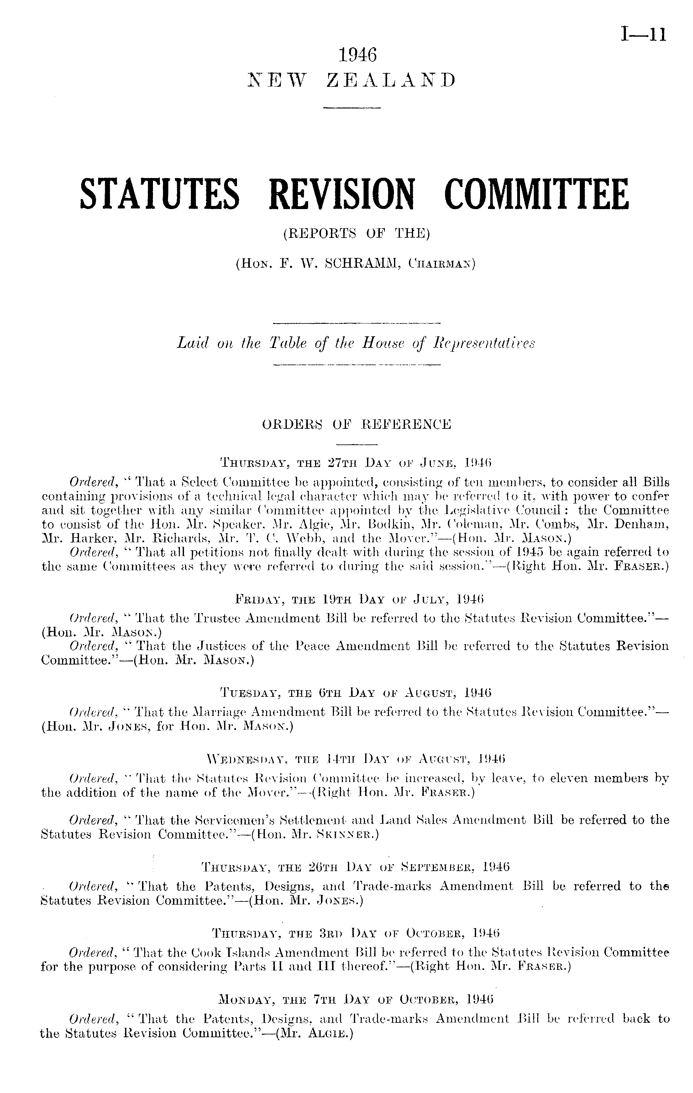 Thursday, the 27th Day of June, 1946 Ordered, " That a Select Committee be appointed, consisting often members, to consider all Bills containing provisions of a technical legal character which may be referred to it, with power to confer and sit together with any similar Committee appointed by the Legislative Council: the Committee to consist of the Hon. Mr. Speaker, Mr. Algie, Mr. Bodkin, Mr. Coleman, Mr. Combs, Mr. Deuham, Mr. Harker, Mr. Richards, Mr. T. C. Webb, and the Mover."—(Hon. Mr. Mason.) Ordered, " That all petitions not finally dealt with daring the session of 1945 be again referred to the same Committees as they were referred to during the said session." —(Right Hon. Mr. Fraser.) Friday, the 19th Day of July, 1946 Ordered, " That the Trustee Amendment Bill be referred to the Statutes Revision Committee."— (Hon. Mr. Mason.) Ordered, " That the Justices of the Peace Amendment Bill be referred to the Statutes Revision Committee."—(Hon. Mr. Mason.) Tuesday, the (sth Day of August, 1946 Ordered, " That the Marriage Amendment Bill be referred to the Statutes Revision Committee."— (Hon. Mr. Jones, for Hon. Mr. Mason.) Wednesday, the 14th Day of August, 1946 Ordered, " That the Statutes Revision Committee be increased, by leave, to eleven members by the addition of the name of the Mover."—(Right Hon. Mr. Fraser.) Ordered, " That the Servicemen's Settlement and Land Sales Amendment Bill be referred to the Statutes Revision Committee."—(Hon. Mr. Skinner.) Thursday, the 26th Day of September, 1946 Ordered, " That the Patents, Designs, and Trade-marks Amendment Bill be referred to the Statutes Revision Committee." —(Hon. Mr. Jones.) Thursday, the 3rd Day of October, 1946 Ordered, " That the Cook Islands Amendment Bill be referred to the Statutes Revision Committee for the purpose of considering Parts II and 111 thereof." —(Right Hon. Mr. Fraser.) Monday, the 7th Day of October, 1946 Ordered, " That the Patents, Designs, and Trade-marks Amendment Bill be referred back to the Statutes Revision Committee."—(Mr. Algie.)