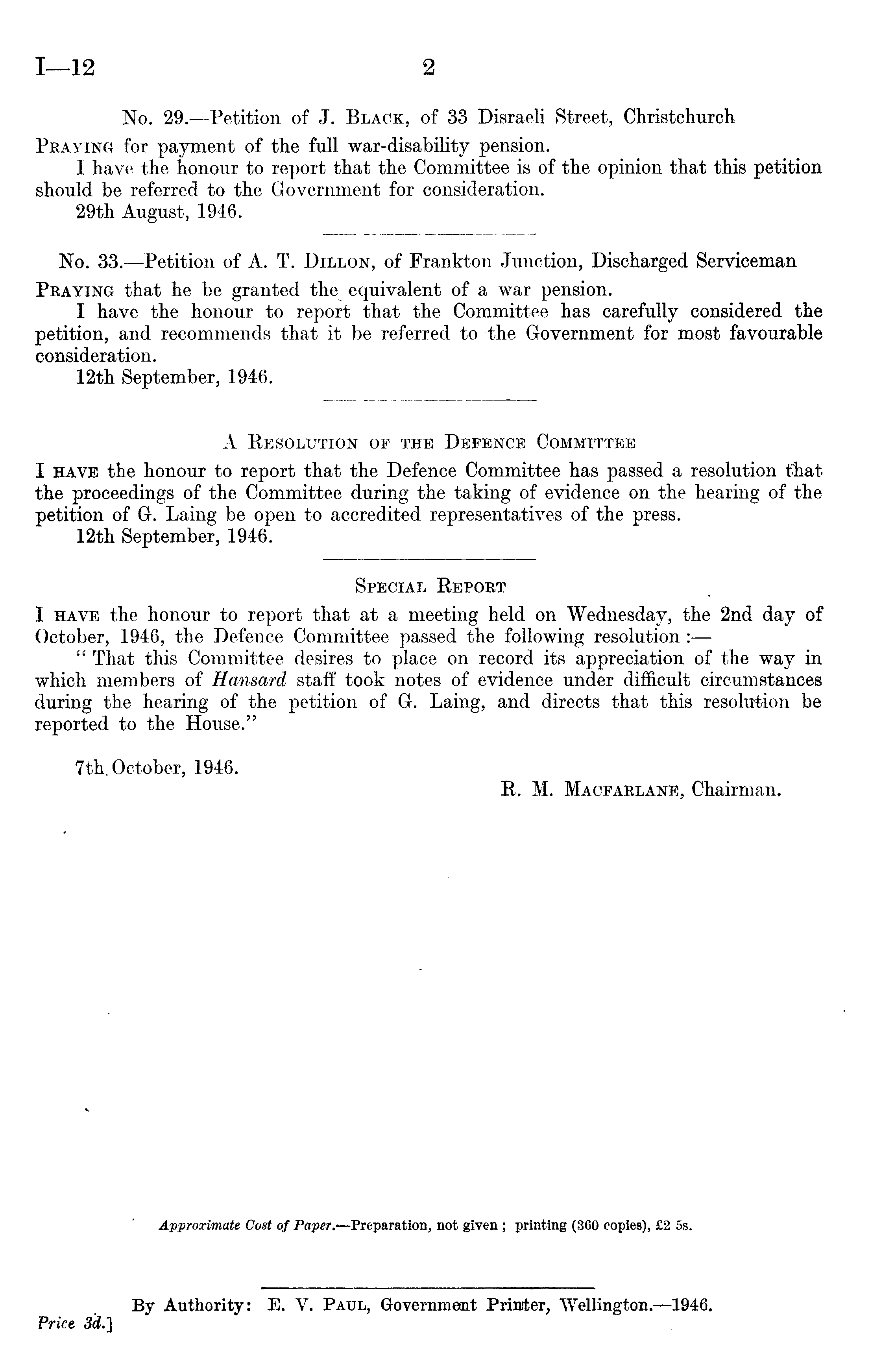 Special Report I have the honour to report that at a meeting held on Wednesday, the 2nd day of October, 1946, the Defence Committee passed the following resolution : " That this Committee desires to place on record its appreciation of the way in which members of Hansard staff took notes of evidence under difficult circumstances during the hearing of the petition of G. Laing, and directs that this resolution be reported to the House." 7th. October, 1946. R. M. Macfarlane, Chairman.