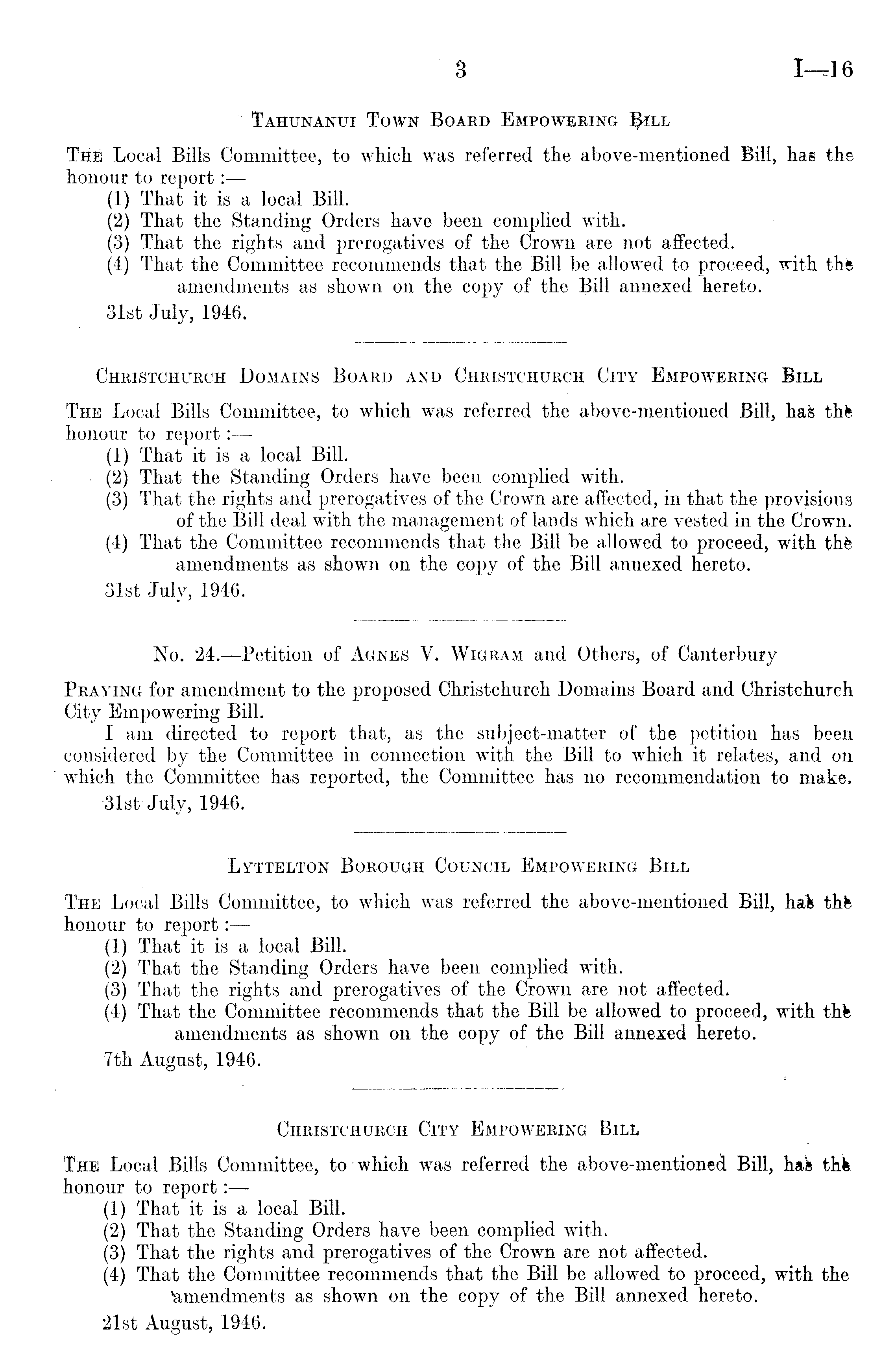 No. 24. —Petition of Agnes V. Wigram and Others, of Canterbury Praying for amendment to the proposed Christchurch Domains Board and Christchurch City Empowering Bill. I am directed to report that, as the subject-matter of the petition has been considered by the Committee in connection with the Bill to which it relates, and on which the Committee has reported, the Committee has no recommendation to make. 31st July, 1946.