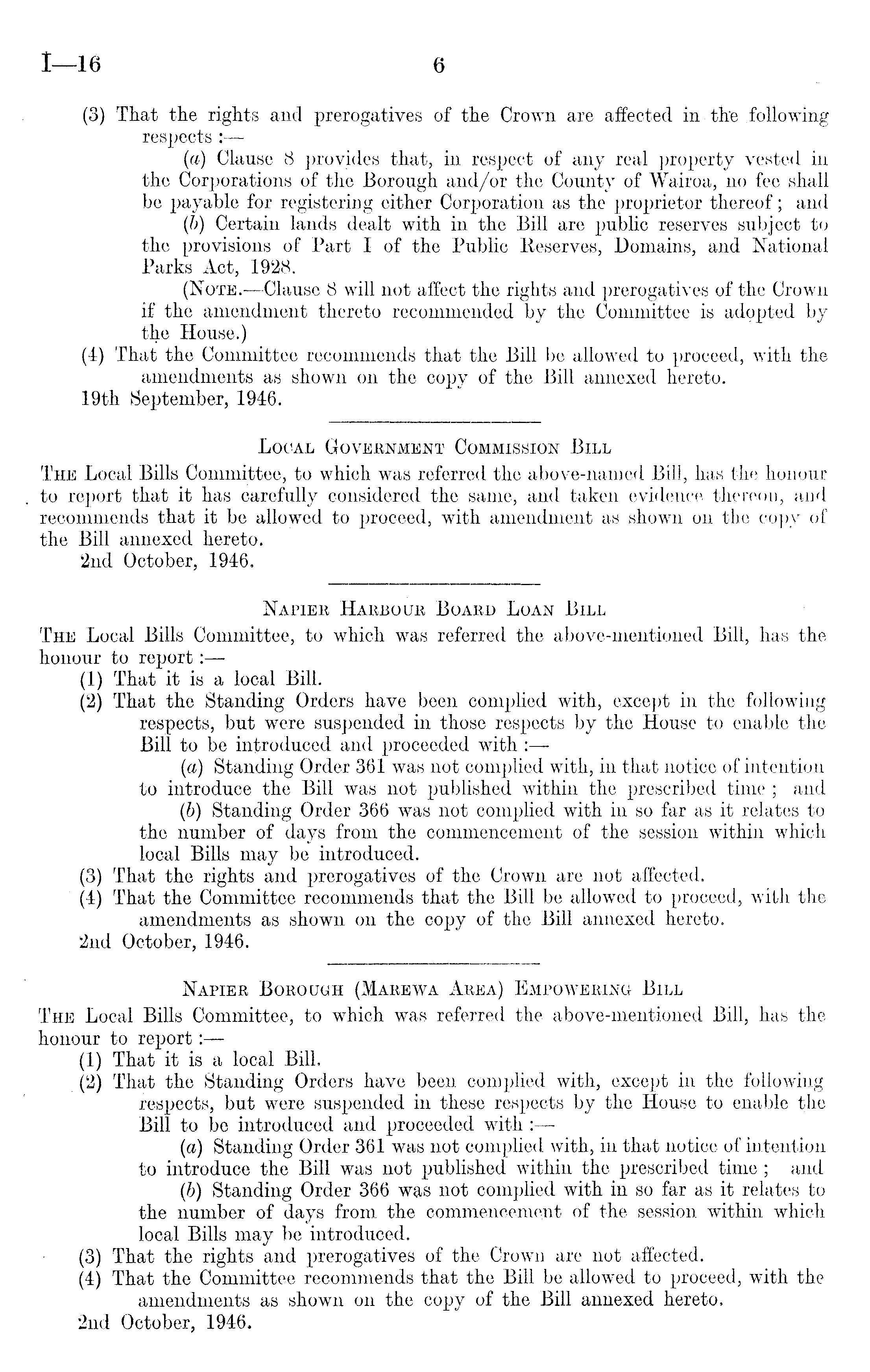 Napier Borough (Marewa Area) Empowering Bill The Local Bills Committee, to which was referred the above-mentioned Bill, has the honour to report: — (1) That it is a local Bill. (2) That the Standing Orders have been complied with, except in the following respects, but were suspended in these respects by the House to enable the Bill to be introduced and proceeded with : {a) Standing Order 361 was not complied with, in that notice of intention to introduce the Bill was not published within the prescribed time ; and (b) Standing Order 366 was not complied with in so far as it relates to the number of days from the commencement of the session within which local Bills may be introduced. (3) That the rights and prerogatives of the Crown are not affected. (4) That the Committee recommends that the Bill be allowed to proceed, with the amendments as shown on the copy of the Bill annexed hereto. 2nd October, 1946.