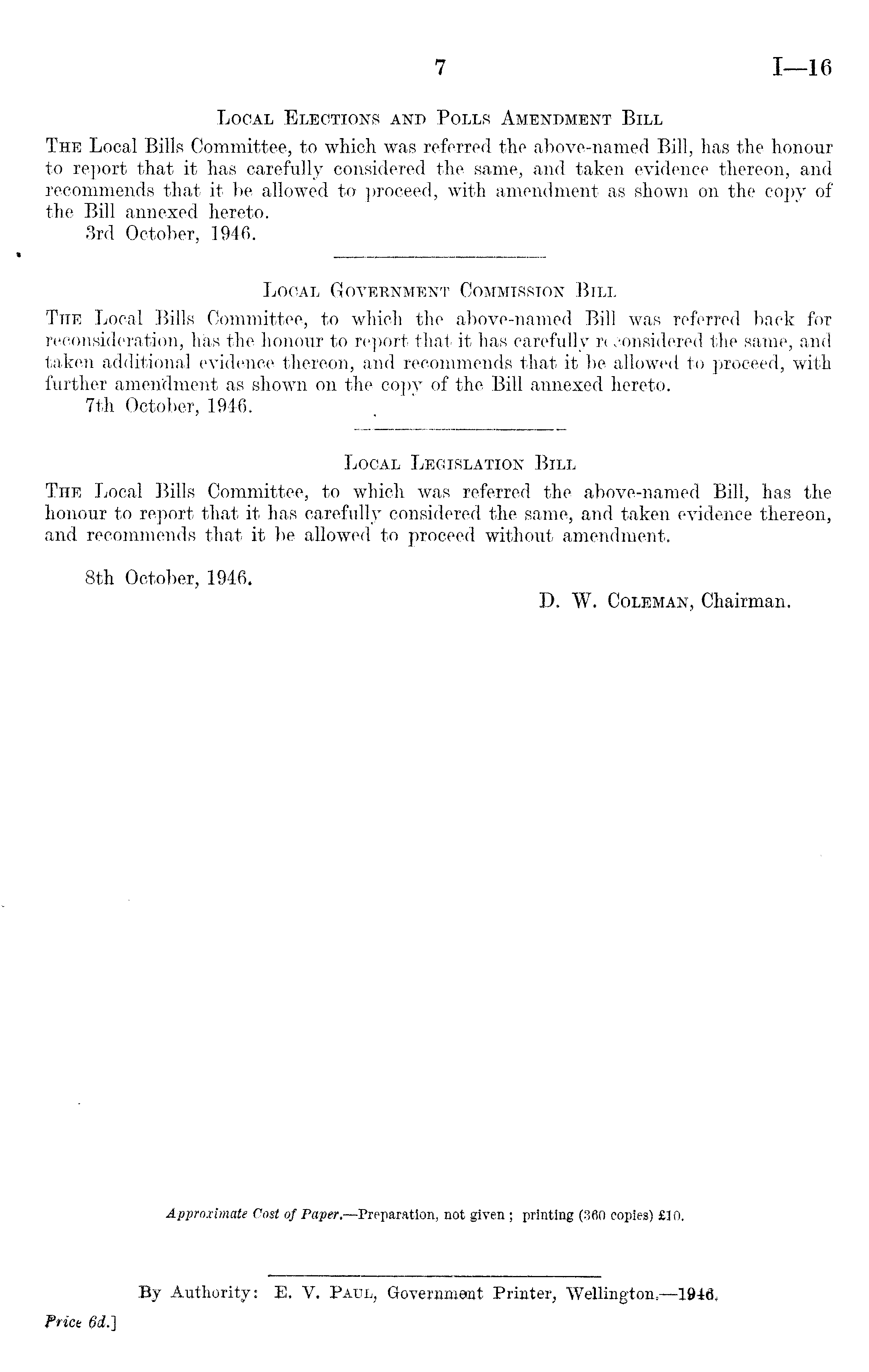 Local Elections and Polls Amendment Bill The Local Bills Committee, to which was referred the above-named Bill, has the honour to report that it has carefully considered the same, and taken evidence thereon, and recommends that it be allowed to proceed, with amendment as shown on the copy of the Bill annexed hereto. 3rd October, 1946.