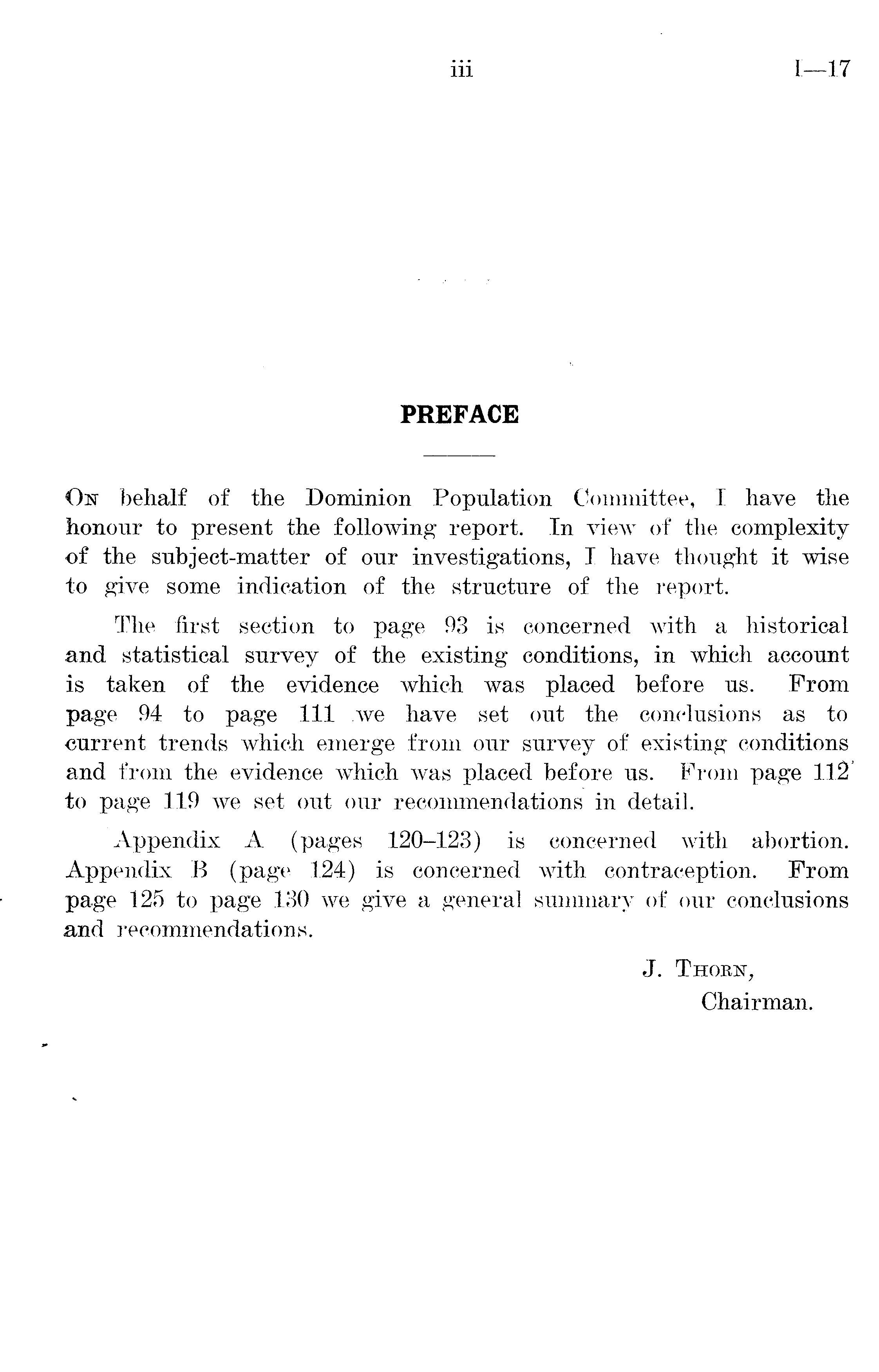 PREFACE On behalf of the Dominion Population Committee, I have the honour to present the following report. In view of the complexity of the subject-matter of our investigations, I have thought it wise to give some indication of the structure of the report. The first section to page 93 is concerned with a historical and statistical survey of the existing conditions, in which account is taken of the evidence which was placed before us. From page 94 to page 111 we have set out the conclusions as to current trends which emerge from our survey of existing conditions and from the evidence which was placed before us. From page 112 to page 119 we set out our recommendations in detail. Appendix A (pages 120-123) is concerned with abortion. Appendix B (page 124) is concerned with contraception. From page 125 to page 130 we give a general summary of our conclusions and recommendations. J. Thorn, Chairman.