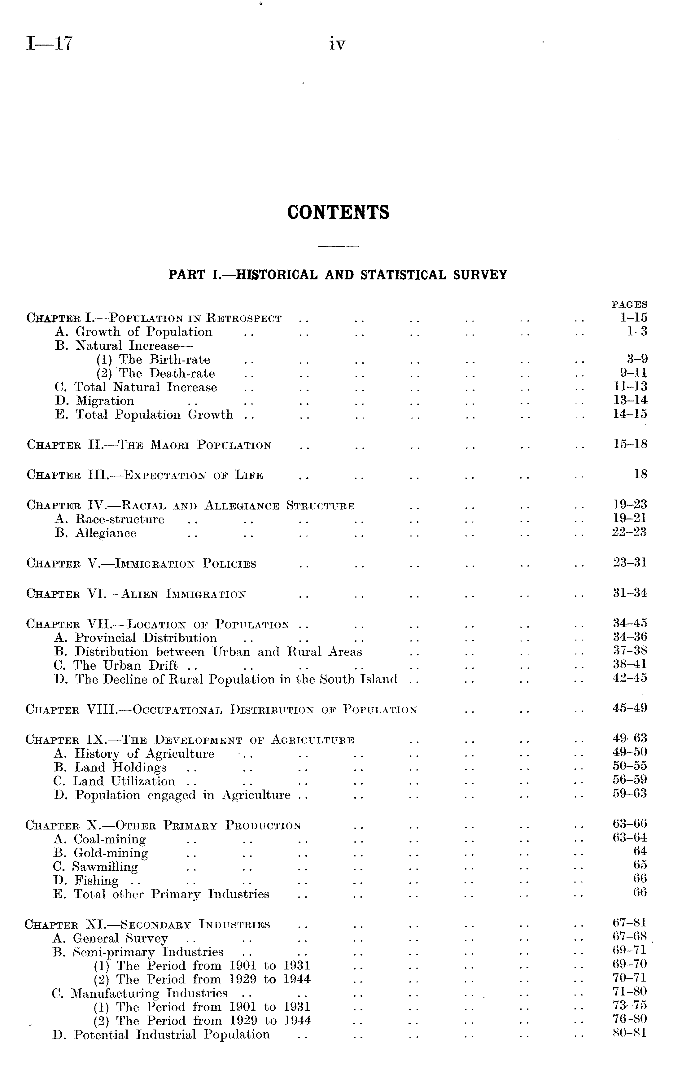 PART I.—HISTORICAL AND STATISTICAL SURVEY PAGES Chapter I. —Population in Retrospect .. .. .. .. .. .. 1-15 A. Growth of Population .. . . .. . . . . .. . . 1-3 B. Natural Increase — (1) The Birth-rate .. .. .. . . .. .. .. 3-9 (2) The Death-rate .. .. .. .. .. 9-11 C. Total Natural Increase . . .. .. . . . . .. . ■ 11-13 D. Migration .. .. .. .. . . . . .. . . 13-14 E. Total Population Growth .. .. .. .. .. .. , . 14-15 Chapter ll.—The Maori Population .. .. .. .. .. .. 15-18 Chapter lll.—Expectation of Life .. .. .. .. .. •. 18 Chapter IV. —Racial and Allegiance Structure .. .. . . . • 19-23 A. Race-structure .. .. .. .. .. .. ■ • • • 19-21 B. Allegiance .. .. . . .. .. . . - - . • 22-23 Chapter V. —Immigration Policies .. .. .. .. - - .. 23-31 Chapter Vl.—Alien Immigration .. .. .. .. .. . - 31-34 Chapter Vll.—Location of Population .. . . .. .. . . . ■ 34-45 A. Provincial Distribution .. .. .. .. . - .. - • 34-36 B. Distribution between Urban and Rural Areas .. . . . . ■ • 37-38 C. The Urban Drift . . .. .. .. . . .. .. - - 38-41 D. The Decline of Rural Population in the South Island .. .. .. . . 42-45 Chapter Vlll.—Occupational Distribution of Population .. .. .. 45-49 Chapter IX.—The Development of Agriculture .. . . .. . ■ 49-63 A. History of Agriculture . . .. .. . - - • • - - • 49-50 B. Land Holdings .. .. .. .. . . - - • • • • 50-55 C. Land Utilization . . .. .. .. . . .. -. • - 56-59 D. Population engaged in Agriculture .. .. . . . . . • • • 59-63 Chapter X.—Other Primary Production .. .. .. .. . - 63-66 A. Coal-mining . . .. ' .. .. .. . . • • • • 63-64 B. Gold-mining .. .. .. .. .. . . . ■ • - 64 0. Sawmilling . . .. .. .. . - . ■ • • - • 65 D. Fishing . . .. .. .. .. . . . . - • ■ • 66 E. Total other Primary Industries .. .. .. . . . - - • 66 Chapter Xl.—Secondary Industries .. .. .. .. . - - • 67-81 A. General Survey . . . . .. .. - ■ ■ • ■ • • • 67-68. B. Semi-primary Industries .. .. .. -. . • • • • • 69-71 (1) The Period from 1901 to 1931 .. .. . - .. .. 69-70 (2) The Period from 1929 to 1944 .. .. . ■ . ■ - • 70-71 C. Manufacturing Industries- .. .. .. .. ... .. - - 71-80 (1) The Period from 1901 to 1931 .. .. .. .. ■ • 73-75 (2) The Period from 1929 to 1944 .. .. . . .. . . 76-80 D. Potential Industrial Population .. .. . . . . .. • • 80-81