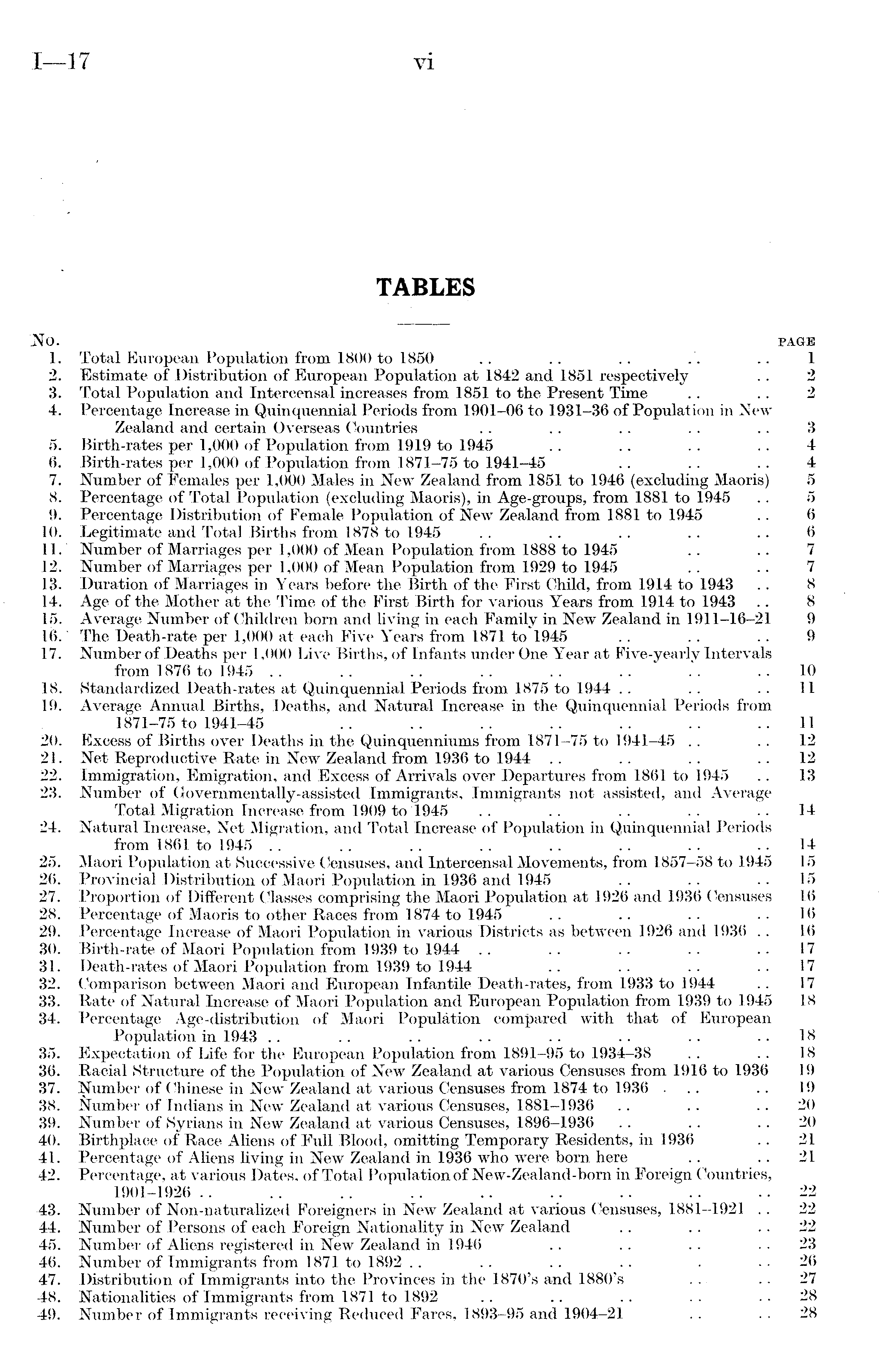 No. PAGE 1. Total European Population from 1800 to 1850 .. .. . . .. .. 1 2. Estimate of Distribution of European Population at 1842 and 1851 respectively .. 2 3. Total Population and Intercensal increases from 1851 to the Present Time .. .. 2 4. Percentage Increase in Quinquennial Periods from 1901-06 to 1931-36 of Population in New Zealand and certain Overseas Countries .. .. .. .. .. 3 5. Birth-rates per 1,000 of Population from 1919 to 1945 . . .. .. .. 4 6. Birth-rates per 1,000 of Population from 1871-75 to 1941-45 .. .. .. 4 7. Number of Females per 1,000 Males in New Zealand from 1851 to 1946 (excluding Maoris) 5 8. Percentage of Total Population (excluding Maoris), in Age-groups, from 1881 to 1945 .. 5 9. Percentage Distribution of Female Population of New Zealand from 1881 to 1945 .. 6 10. Legitimate and Total Births from 1878 to 1945 .. .. .. .. .. 6 11. Number of Marriages per 1,000 of Mean Population from 1888 to 1945 .. .. 7 12. Number of Marriages per 1,000 of Mean Population from 1929 to 1945 .. .. 7 13. Duration of Marriages in Years before the Birth of the First Child, from 1914 to 1943 . . 8 14. Age of the Mother at the Time of the First Birth for various Years from 1914 to 1943 .. 8 15. Average Number of Children born and living in each Family in New Zealand in 1911-16—21 9 16. The Death-rate per 1,000 at each Five Years from 1871 to 1945 .. .. .. 9 17. Number of Deaths per 1,000 Live Births, of Infants under One Year at Five-yearly Intervals from 1876 to 1945 . . .. .. . . .. . . . . 10 18. Standardized Death-rates at Quinquennial Periods from 1875 to 1944 .. .. .. 11 19. Average Annual Births, Deaths, and Natural Increase in the Quinquennial Periods from 1871-75 to 1941-45 .. ... .. .. .. .. ..11 20. Excess of Births over Deaths in the Quinquenniums from 1871-75 to 1941-45 . . .. 12 21. Net Reproductive Rate in New Zealand from 1936 to 1944 .. .. . . 12 .22. Immigration, Emigration, and Excess of Arrivals over Departures from 1861 to 1945 .. 13 23. Number of Governmentally-assisted Immigrants, Immigrants not assisted, and Average Total Migration Increase from 1909 to 1945 .. .. .. .. .. 14 24. Natural Increase, Net Migration, and Total Increase of Population in Quinquennial Periods from 1861 to 1945 . . .. .. .. .. .. .. 14 25. Maori Population at Successive Censuses, and Intercensal Movements, from 1857-58 to 1945 15 26. Provincial Distribution of Maori Population in 1936 and 1945 . . . . .. 15 27. Proportion of Different Classes comprising the Maori Population at 1926 and 1936 Censuses 16 28. Percentage of Maoris to other Races from 1874 to 1945 . . .. . . . . 16 29. Percentage Increase of Maori Population in various Districts as between 1926 and 1936 .. 16 30. Birth-rate of Maori Population from 1939 to 1944 . . . . .. . . .. 17 31. Death-rates of Maori Population from 1939 to 1944 .. . . . . . . 17 32. Comparison between Maori and European Infantile Death-rates, from 1933 to 1944 .. 17 33. Rate of Natural Increase of Maori Population and European Population from 1939 to 1945 18 34. Percentage Age-distribution of Maori Population compared with that of European Population in 1943 . . . . .. .. . . . . . . 18 35. Expectation of Life for the European Population from 1891-95 to 1934-38 .. .. 18 36. Racial Structure of the Population of New Zealand at various Censuses from 1916 to 1936 19 37. Number of Chinese in New Zealand at various Censuses from 1874 to 1936 ... .. 19 38. Number of Indians in New Zealand at various Censuses, 1881-1936 . . .. 20 39. Number of Syrians in New Zealand at various Censuses, 1896-1936 . . . . 20 40. Birthplace of Race Aliens of Full Blood, omitting Temporary Residents, in 1936 .. 21 41. Percentage of Aliens living in New Zealand in 1936 who were born here .. .. 21 42. Percentage, at various Dates, of Total Population of New-Zealand-born in Foreign Countries, 1901-1926 .. .. .. .. .. .. .. .. 22 43. Number of Non-naturalized Foreigners in New Zealand at various Censuses, 1881-1921 .. 22 44. Number of Persons of each Foreign Nationality in New Zealand .. .. 22 45. Number of Aliens registered in New Zealand in 1946 ~ .. . . 23 46. Number of Immigrants from 1871 to 1892 .. . . . . . . . 26 47. Distribution of Immigrants into the Provinces in the 1870's and 1880's . . .. 27 48. Nationalities of Immigrants from 1871 to 1892 .. .. .. 28 49. Number of Immigrants receiving Reduced Fares, 1893-95 and 1904-21 . . . . 28