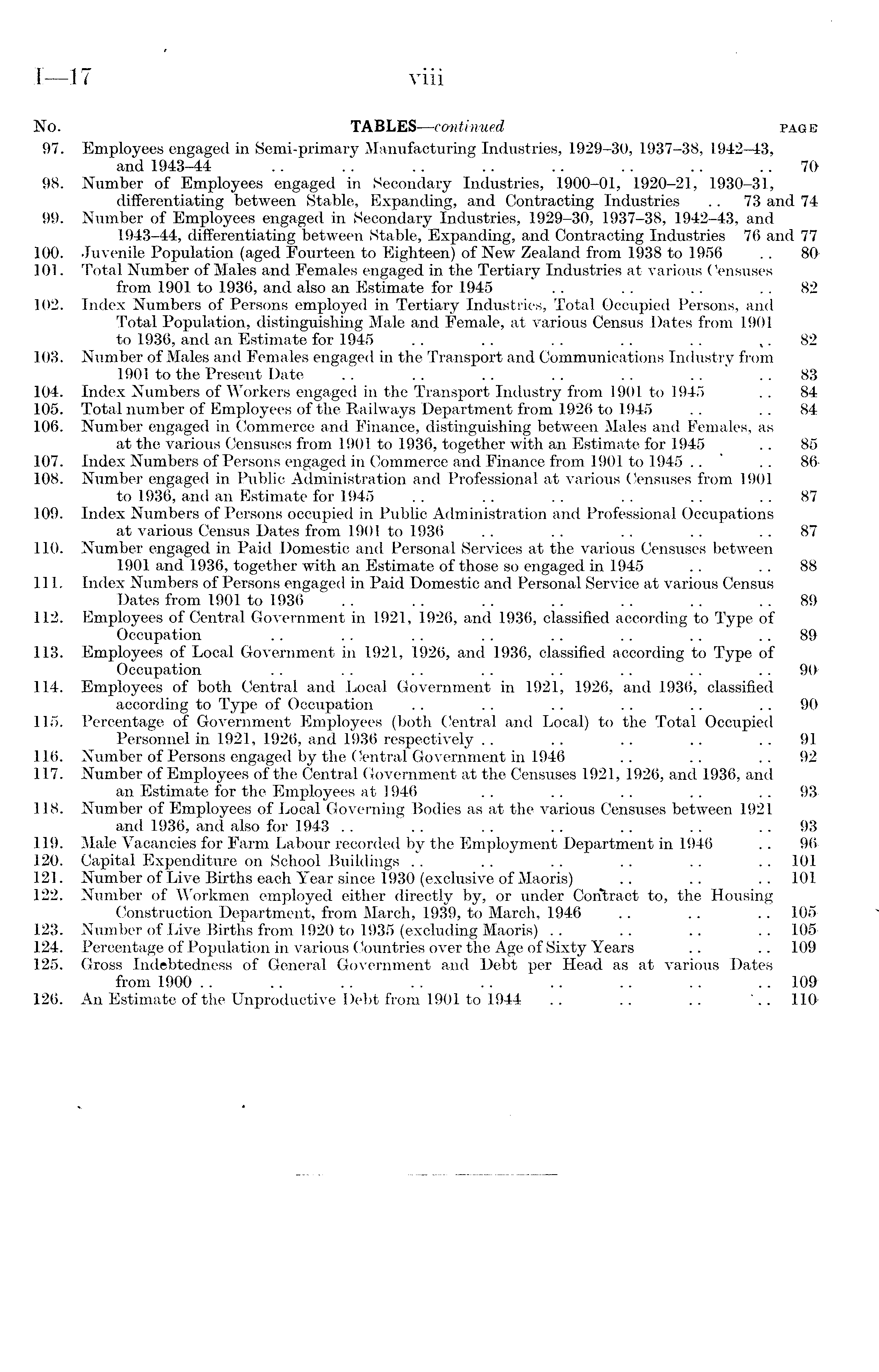 No. TABLES —continued page 97. Employees engaged in Semi-primary Manufacturing Industries, 1929-30, 1937-38, 1942-43, and 1943-44 .. .. .. .. .. .. .. 70 98. Number of Employees engaged in Secondary Industries, 1900-01, 1920-21, 1930-31, differentiating between Stable, Expanding, and Contracting Industries .. 73 and 74 99. Number of Employees engaged in Secondary Industries, 1929-30, 1937-38, 1942-43, and 1943-44, differentiating between Stable, Expanding, and Contracting Industries 76 and 77 100. Juvenile Population (aged Fourteen to Eighteen) of New Zealand from 1938 to 1956 .. 80 101. Total Number of Males and Females engaged in the Tertiary Industries at various Censuses from 1901 to 1936, and also an Estimate for 1945 . . . . .. 82 102. Index Numbers of Persons employed in Tertiary Industries, Total Occupied Persons, and Total Population, distinguishing Male and Female, at various Census Dates from 1901 to 1936, and an Estimate for 1945 . . .. . . .. .. 82 103. Number of Males and Females engaged in the Transport and Communications Industry from 1901 to the Present Date .. .. .. .. .. .. 83 104. Index Numbers of Workers engaged in the Transport Industry from 1901 to 1945 . . 84 105. Total number of Employees of the Railways Department from 1926 to 1945 .. .. 84 106. Number engaged in Commerce and Finance, distinguishing between Males and Females, as at the various Censuses from 1901 to 1936, together with an Estimate for 1945 .. 85 107. Index Numbers of Persons engaged in Commerce and Finance from 1901 to 1945 .. ' .. 86108. Number engaged in Public Administration and Professional at various Censuses from 1901 to 1936, and an Estimate for 1945 . . .. .. .. .. 87 109. Index Numbers of Persons occupied in Public Administration and Professional Occupations at various Census Dates from 1901 to 1936 .. .. .. .. 87 110. Number engaged in Paid Domestic and Personal Services at the various Censuses between 1901 and 1936, together with an Estimate of those so engaged in 1945 .. .. 88111. Index Numbers of Persons engaged in Paid Domestic and Personal Service at various Census Dates from 1901 to 1936 .. .. .. .. .. .. 8& 112. Employees of Central Government in 1921, 1926, and 1936, classified according to Type of Occupation .. .. .. .. .. .. .. 8& 113. Employees of Local Government in 1921, 1926, and 1936, classified according to Type of Occupation .. . . .. . . .. .. .. 90^ 114. Employees of both Central and Local Government in 1921, 1926, and 1936, classified according to Type of Occupation .. .. .. .. .. 90 115. Percentage of Government Employees (both Central and Local) to the Total Occupied Personnel in 1921, 1926, and 1936 respectively .. .. .. .. 91 116. Number of Persons engaged by the Central Government in 1946 .. .. ..92 117. Number of Employees of the Central Government at the Censuses 1921, 1926, and 1936, and an Estimate for the Employees at 1946 . . .. .. .. .. 93118. Number of Employees of Local Governing Bodies as at the various Censuses between 1921 and 1936, and also for 1943 .. . . .. .. .. .. 93 119. Male Vacancies for Farm Labour recorded by the Employment Department in 1946 .. 96 120. Capital Expenditure on School Buildings .. . . .. .. .. .. 101 121. Number of Live Births each Year since 1930 (exclusive of Maoris) .. .. .. 101 122. Number of Workmen employed either directly by, or under Contract to, the Housing Construction Department, from March, 1939, to March, 1946 .. .. .. 105 123. Number of Live Births from 1920 to 1935 (excluding Maoris) .. .. .. .. 105 124. Percentage of Population in various Countries over the Age of Sixty Years .. .. 109 125. Gross Indebtedness of General Government and Debt per Head as at various Dates from 1900 .. .. .. . . .. .. .. .. .. 10& 126. An Estimate of the Unproductive Debt from 1901 to 1944 .. .. .. 110
