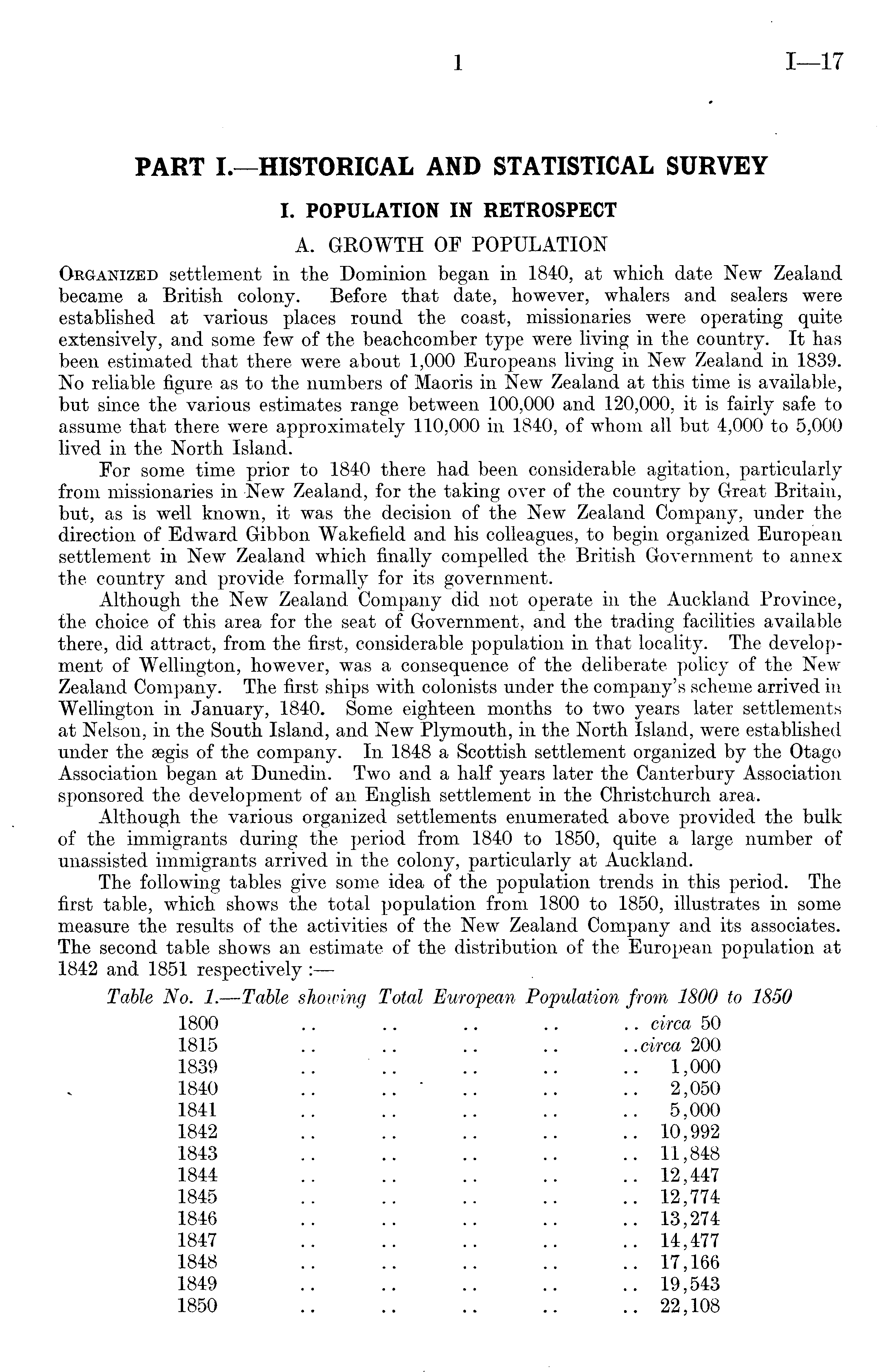 PART I.—HISTORICAL AND STATISTICAL SURVEY I. POPULATION IN RETROSPECT A. GROWTH OF POPULATION Organized settlement in the Dominion began in 1840, at which date New Zealand became a British colony. Before that date, however, whalers and sealers were established at various places round the coast, missionaries were operating quite extensively, and some few of the beachcomber type were living in the country. It has been estimated that there were about 1,000 Europeans living in New Zealand in 1839. No reliable figure as to the numbers of Maoris in New Zealand at this time is available, but since the various estimates range between 100,000 and 120,000, it is fairly safe to assume that there were approximately 110,000 in 1840, of whom all but 4,000 to 5,000 lived in the North Island. For some time prior to 1840 there had been considerable agitation, particularly from missionaries in New Zealand, for the taking over of the country by Great Britain, but, as is well known, it was the decision of the New Zealand Company, under the direction of Edward Gibbon Wakefield and his colleagues, to begin organized European settlement in New Zealand which finally compelled the British Government to annex the country and provide formally for its government. Although the New Zealand Company did not operate in the Auckland Province, the choice of this area for the seat of Government, and the trading facilities available there, did attract, from the first, considerable population in that locality. The development of Wellington, however, was a consequence of the deliberate policy of the New Zealand Company. The first ships with colonists under the company's scheme arrived in Wellington in January, 1840. Some eighteen months to two years later settlements at Nelson, in the South Island, and New Plymouth, in the North Island, were established under the segis of the company. In 1848 a Scottish settlement organized by the Otago Association began at Dunedin. Two and a half years later the Canterbury Association sponsored the development of an English settlement in the Christchurch area. Although the various organized settlements enumerated above provided the bulk of the immigrants during the period from 1840 to 1850, quite a large number of unassisted immigrants arrived in the colony, particularly at Auckland. The following tables give some idea of the population trends in this period. The first table, which shows the total population from 1800 to 1850, illustrates in some measure the results of the activities of the New Zealand Company and its associates. The second table shows an estimate of the distribution of the European population at 1842 and 1851 respectively : Table No. 1. —Table showing Total European Population from 1800 to 1850 1800 .. .. .. .. .. circa 50 1815 .. .. .. .. ..circa 200. 1839 .. .. .. .. .. 1,000 1840 .. .. • .. .. .. 2,050 1841 .. .. .. .. .. 5,000 1842 .. .. .. .. .. 10,992 1843 .. .. .. .. .. 11,848 1844 .. .. .. .. .. 12,447 1845 .. .. .. .. .. 12,774 1846 .. .. .. .. .. 13,274 1847 .. .. .. .. .. 14,477 1848 .. .. .. .. .. 17,166 1849 .. .. .. .. .. 19,543 1850 .. .. .. .. .. 22,108