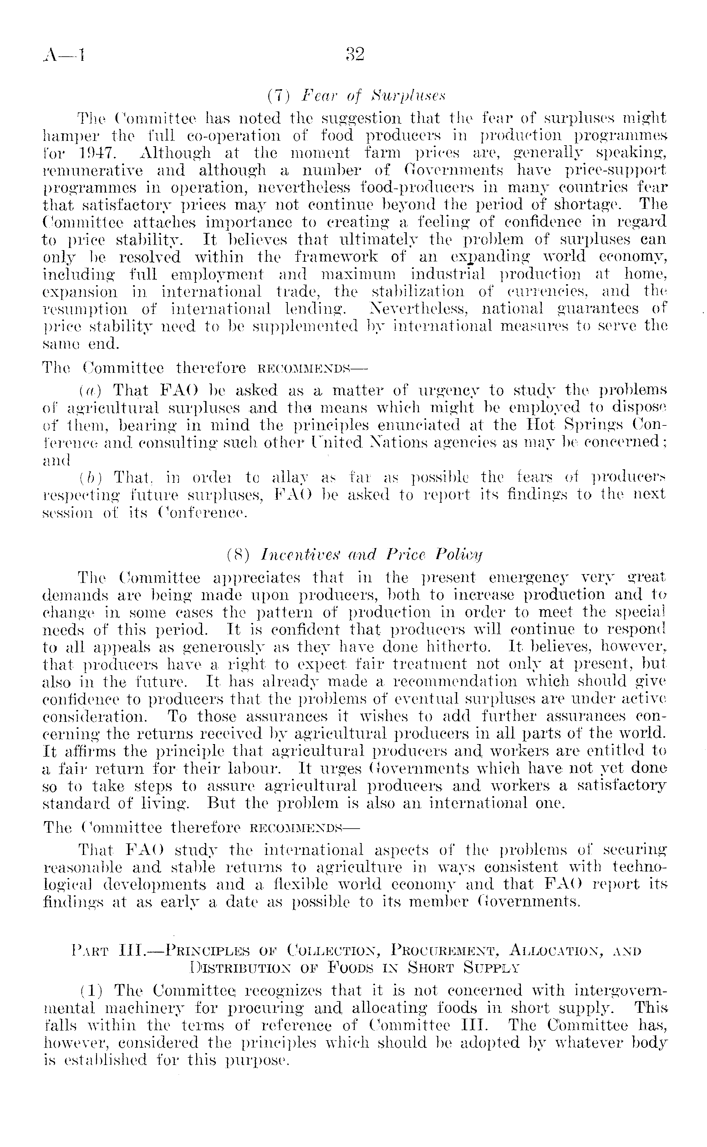 (7) Fear of Surpluses The Committee has noted the suggestion that the fear of surpluses might hamper the full co-operation of food producers in production programmes for 1947. Although at the moment farm - prices are, generally speaking, remunerative and although a number of Governments have price-support programmes in operation, nevertheless food-producers in many countries fear that satisfactory prices may not continue beyond the period of shortage. The Committee attaches importance to creating a feeling of confidence in regard to price stability. It believes that ultimately the problem of surpluses can only be resolved within the framework of an expanding world economy, including full employment and maximum industrial production at home, expansion in international trade, the stabilization of currencies, and the resumption of international lending. Nevertheless, national guarantees of price stability need to be supplemented by international measures to serve the same end. The Committee therefore recommends — {a) That FAO be asked as a matter of urgency to study the problems of agricultural surpluses and tha means which might be employed to dispose of them, bearing in mind the principles enunciated at the Hot Springs Conference and consulting such other United Nations agencies as may be concerned and (b) That, in order to allay as far as possible the fears of producers respecting future surpluses, FAO be asked to report its findings to the next session of its Conference. (8) Incentives' amd Price Policy" The Committee appreciates that in the present emergency very great demands are being made upon producers, both to increase production and tochange in some cases the pattern of production in order to meet the special needs of this period. It is confident that producers will continue to respond to all appeals as generously as they have done hitherto. It; believes, however,, that producers have a right to expect fair treatment not only at present, but also in the future. It has already made a recommendation which should give confidence to producers that the problems of eventual surpluses are under active consideration. To those assurances it wishes to add further assurances concerning the returns received by agricultural producers in all parts of the world. It affirms the principle that agricultural producers and, workers are entitled to a fair return for their labour. It urges Governments which have not yet done so to take steps to assure agricultural producers and workers a satisfactory standard of living. But the problem is also an international one. The Committee therefore recommends — That FAO study the international aspects of the problems of securing reasonable and stable returns to agriculture in ways consistent with technological developments and a flexible world economy and that FAO report itsfindings at as early a date as possible to its member Governments. Part lll.—Principles of Collection, Procurement, Allocation, and Distribution op Foods in Short Supply (1) The Committee recognizes that it is not concerned with intergovernmental machinery for procuring and allocating foods in short supply. This falls within the terms of reference of Committee 111. The Committee has, however, considered the principles which should be adopted by whatever body is established for this purpose.