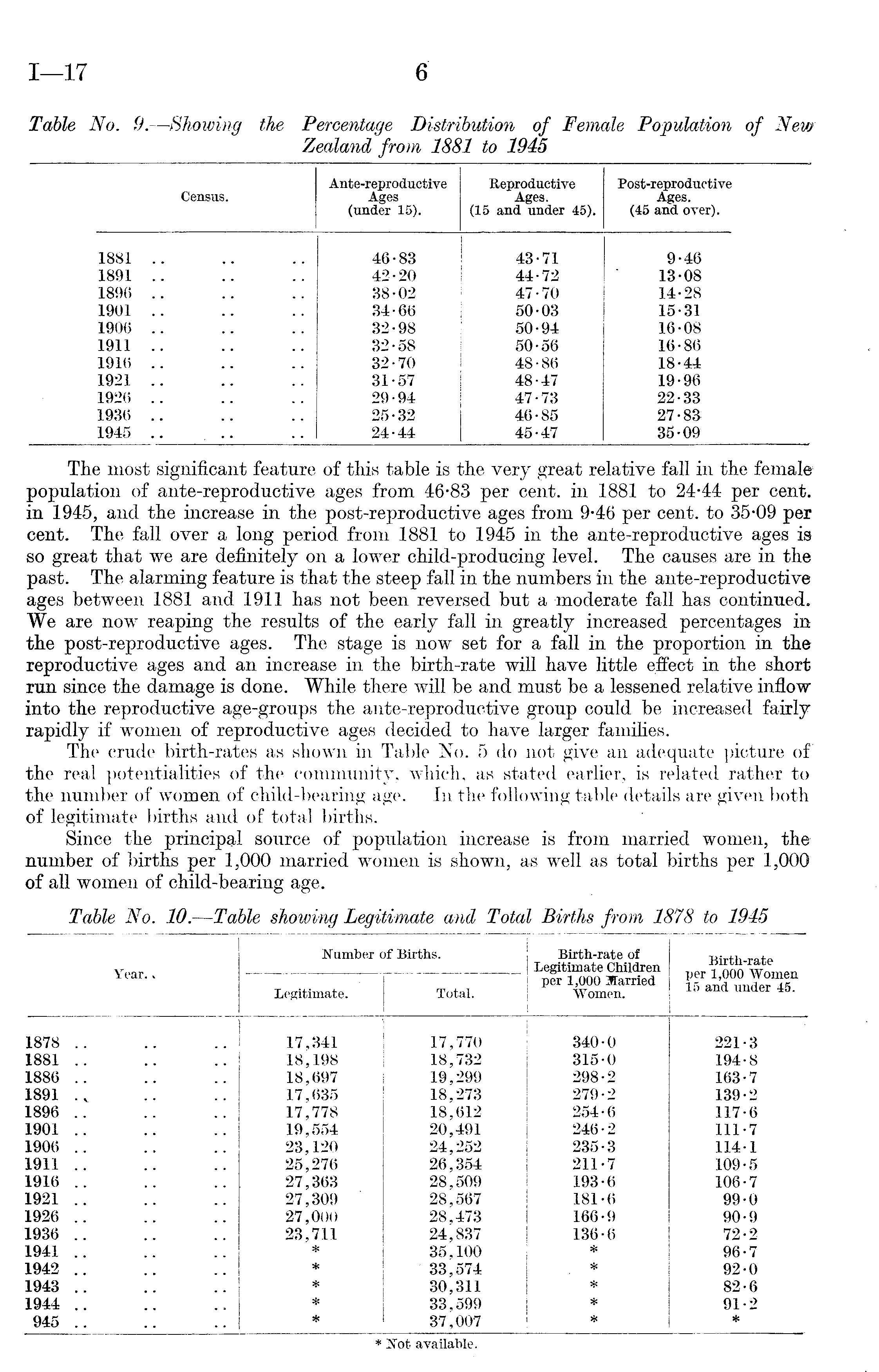 The most significant feature of this table is the very great relative fall in the female population of ante-reproductive ages from 46*83 per cent, in 1881 to 24-44 per cent, in 1945, and the increase in the post-reproductive ages from 9-46 per cent, to 35-09 per cent. The fall over a long period from 1881 to 1945 in the ante-reproductive ages is so great that we are definitely on a lower child-producing level. The causes are in the past. The alarming feature is that the steep fall in the numbers in the ante-reproductive ages between 1881 and 1911 has not been reversed but a moderate fall has continued. We are now reaping the results of the early fall in greatly increased percentages in the post-reproductive ages. The stage is now set for a fall in the proportion in the reproductive ages and an increase in the birth-rate will have little effect in the short run since the damage is done. While there will be and must be a lessened relative inflow into the reproductive age-groups the ante-reproductive group could be increased fairly rapidly if women of reproductive ages decided to have larger families. The crude birth-rates as shown in Table No. 5 do not give an adequate picture of the real potentialities of the community, which, as stated earlier, is related rather to the number of women of child-bearing age. In the following table details are given both of legitimate births and of total births. Since the principal source of population increase is from married women, the number of births per 1,000 married women is shown, as well as total births per 1,000 : of all women of child-bearing age.