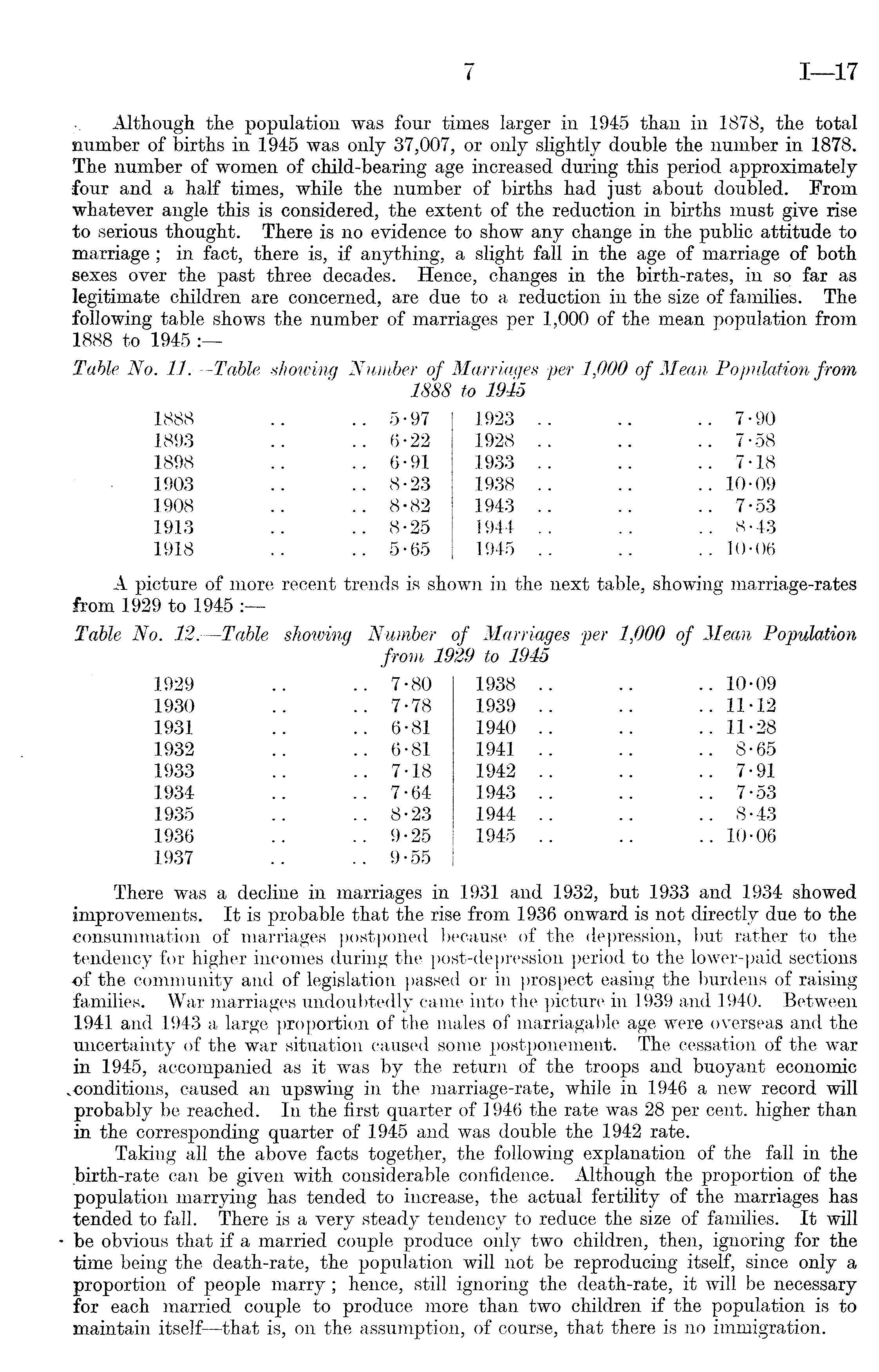 Although the population was four times larger in 1945 than in 1878, the total number of births in 1945 was only 37,007, or only slightly double the number in 1878. The number of women of child-bearing age increased during this period approximately -four and a half times, while the number of births had just about doubled. From whatever angle this is considered, the extent of the reduction in births must give rise to serious thought. There is no evidence to show any change in the public attitude to marriage ; in fact, there is, if anything, a slight fall in the age of marriage of both sexes over the past three decades. Hence, changes in the birth-rates, in so far as legitimate children are concerned, are due to a reduction in the size of families. The following table shows the number of marriages per 1,000 of the mean population from 1888 to 1945 : Table No. 11. —Table -showing Number of Marriages per 1,000 of Mean Population from 1888 to 1945 1888 .. .. 5-97 1923 .. .. .. 7-90 1893 .. .. 6-22 1928 .. .. .. 7-58 1898 .. .. 6-91 1933 .. .. .. 7-18 1903 .. .. 8-23 1938 .. .. .. 10-09 1908 .. .. 8-82 1943 .. .. .. 7-53 1913 .. .. 8-25 1944 .. .. .. 8-43 1918 .. .. 5-65 1945 .. .. .. 10-06 A picture of more recent trends is shown in the next table, showing marriage-rates from 1929 to 1945 Table No. 12. —Table showinq Number of Marriages per 1,000 of Mean Population from 1929 to 1945 1929 .. .. 7-80 1938 .. .. .. 10-09 1930 .. .. 7-78 1939 .. .. ..11-12 1931 .. .. 6-81 1940 .. .. ..11-28 1932 .. .. 6-81 1941 .. .. .. 8-65 1933 .. .. 7-18 1942 .. .. .. 7-91 1934 .. .. 7-64 1943 .. .. .. 7-53 1935 .. .. 8-23 1944 .. .. .. 8-43 1936 .. .. 9-25 1945 .. .. .. 10-06 1937 .. .. 9-55 There was a decline in marriages in 1931 and 1932, but 1933 and 1934 showed improvements. It is probable that the rise from 1936 onward is not directly due to the consummation of marriages postponed because of the depression, but rather to the tendency for higher incomes during the post-depression period to the lower-paid sections of the community and of legislation passed or in prospect easing the burdens of raising families. War marriages undoubtedly came into the picture in 1939 and 1940. Between 1941 and 1943 a large proportion of the males of marriagable age were overseas and the uncertainty of the war situation caused some postponement. The cessation of the war in 1945, accompanied as it was by the return of the troops and buoyant economic conditions, caused an upswing in the marriage-rate, while in 1946 a new record will probably be reached. In the first quarter of 1946 the rate was 28 per cent, higher than in the corresponding quarter of 1945 and was double the 1942 rate. Taking all the above facts together, the following explanation of the fall in the birth-rate can be given with considerable confidence. Although the proportion of the population marrying has tended to increase, the actual fertility of the marriages has tended to fall. There is a very steady tendency to reduce the size of families. It will be obvious that if a married couple produce only two children, then, ignoring for the time being the death-rate, the population will not be reproducing itself, since only a proportion of people marry ; hence, still ignoring the death-rate, it will be necessary for each married couple to produce more than two children if the population is to maintain itself —that is, on the assumption, of course, that there is no immigration.