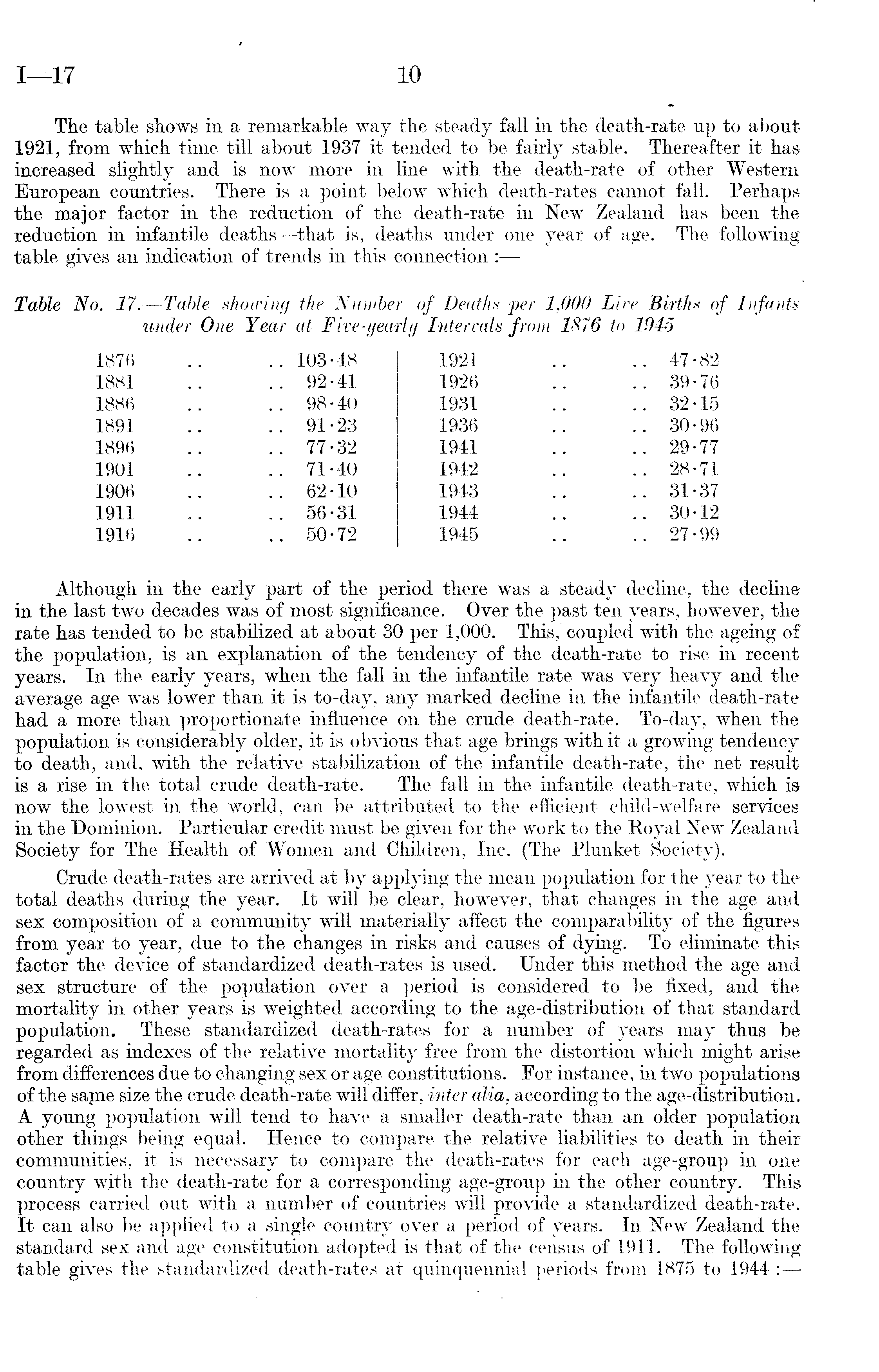 The table shows in a remarkable way the steady fall in the death-rate up to about 1921, from which time till about 1937 it tended to be fairly stable. Thereafter it has increased slightly and is now more in line with the death-rate of other Western European countries. There is a point below which death-rates cannot fall. Perhaps the major factor in the reduction of the death-rate in New Zealand has been the reduction in infantile deaths —that is, deaths under one year of age. The following table gives an indication of trends in this connection : Table No. 17. —Table showing the Number of Deaths per 1,000 Live Births of Infants under One Year at Five-yearly Intervals from 1576 to 1945 1876 .. .. 103-48 1921 .. .. 47-82 1881 .. .. 92-41 1926 .. .. 39-76 1886 .. .. 98-40 1931 .. .. 32-15 1891 .. ..91-23 1936 .. .. 30-96 1896 .. .. 77-32 1941 .. .. 29-77 1901 .. ..71-40 1942 .. .. 28-71 1906 .. .. 62-10 1943 .. .. 31-37 1911 .. .. 56-31 1944 .. .. 30-12 1916 .. .. 50-72 1945 .. .. 27-99 Although in the early part of the period there was a steady decline, the decline in the last two decades was of most significance. Over the past ten years, however, the rate has tended to be stabilized at about 30 per 1,000. This, coupled with the ageing of the population, is an explanation of the tendency of the death-rate to rise in recent years. In the early years, when the fall in the infantile rate was very heavy and the average age was lower than it is to-day, any marked decline in the infantile death-rate had a more than proportionate influence on the crude death-rate. To-day, when the population is considerably older, it is obvious that age brings with it a growing tendency to death, and, with the relative stabilization of the infantile death-rate, the net result is a rise in the total crude death-rate. The fall in the infantile death-rate, which is now the lowest in the world, can be attributed to the efficient child-welfare services in the Dominion. Particular credit must be given for the work to the Royal New Zealand Society for The Health of Women and Children, Inc. (The Plunket Society). Crude death-rates are arrived at by applying the mean population for the year to the total deaths during the year. It will be clear, however, that changes in the age and sex composition of a community will materially affect the comparability of the figures from year to year, due to the changes in risks and causes of dying. To eliminate this factor the device of standardized death-rates is used. Under this method the age and sex structure of the population over a period is considered to be fixed, and the mortality in other years is weighted according to the age-distribution of that standard population. These standardized death-rates for a number of years may thus be regarded as indexes of the relative mortality free from the distortion which might arise from differences due to changing sex or age constitutions. For instance, in two populations of the sapae size the crude death-rate will differ, inter alia, according to the age-distribution. A young population will tend to have a smaller death-rate than an older population Other things being equal. Hence to compare the relative liabilities to death in their communities, it is necessary to compare the death-rates for each age-group in one country with the death-rate for a corresponding age-group in the other country. This process carried out with a number of countries will provide a standardized death-rate. It can also be applied to a single country over a period of years. In New Zealand the standard sex and age constitution adopted is that of the census of 1911. The following table gives the standardized death-rates at quinquennial periods from 1875 to 1944 :