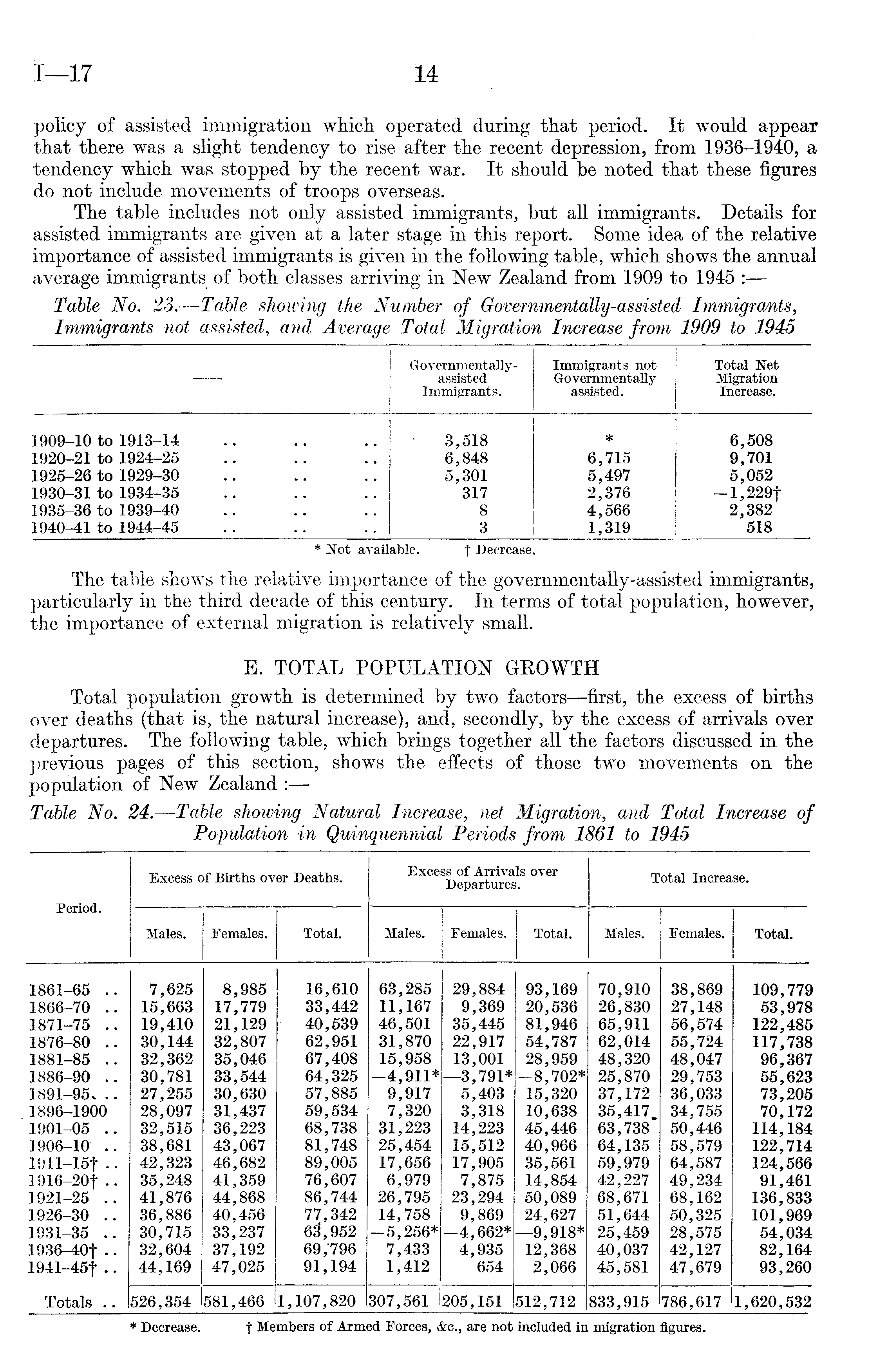 The table shows the relative importance of the governmentally-assisted immigrants, particularly in the third decade of this century. In terms of total population, however, the importance of external migration is relatively small. E. TOTAL POPULATION GROWTH Total population growth is determined by two factors—first, the excess of births over deaths (that is, the natural increase), and, secondly, by the excess of arrivals over departures. The following table, which brings together all the factors discussed in the previous pages of this section, shows the ■ effects of those two movements on the population of New Zealand :