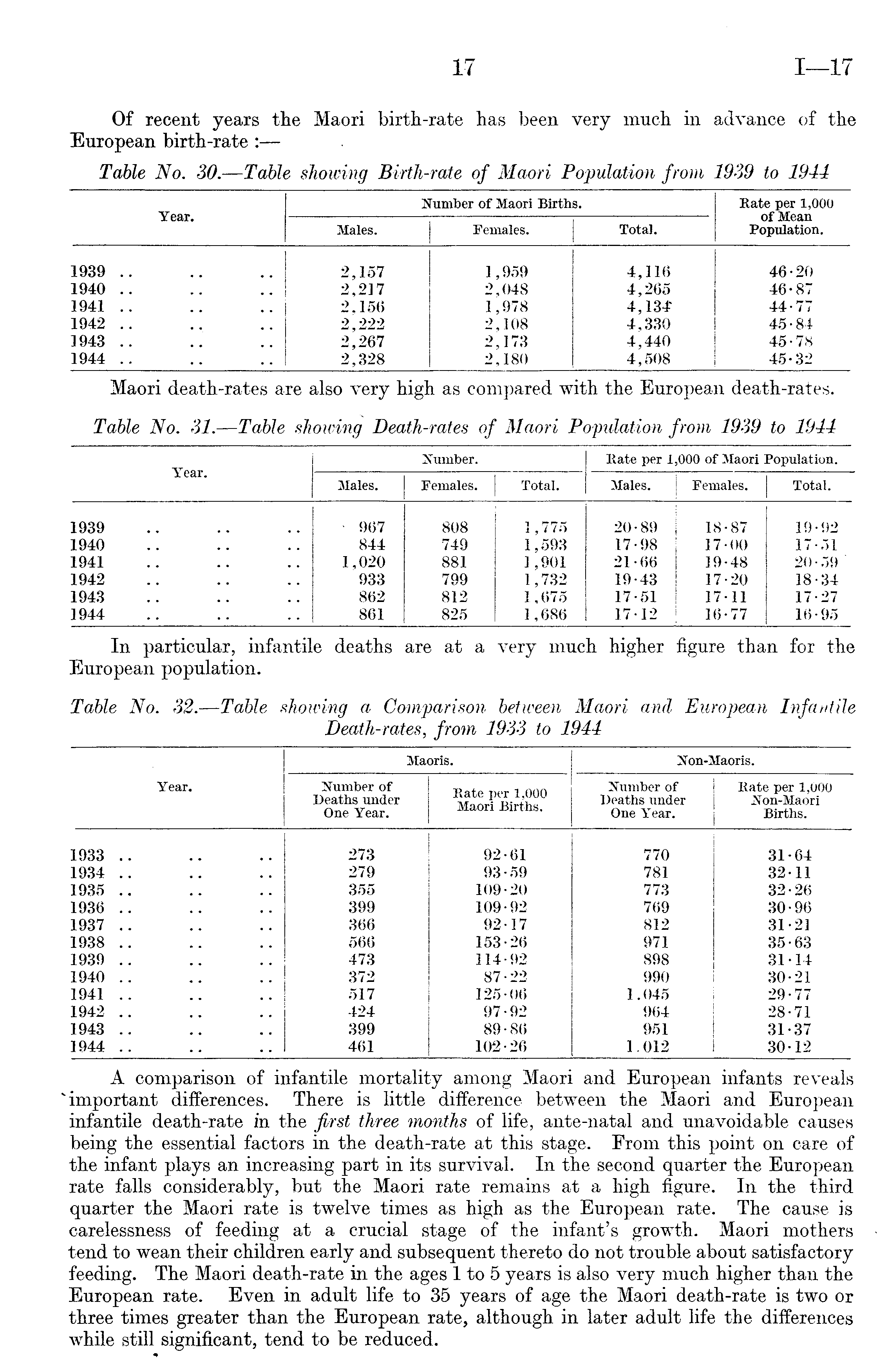 Year. Maoris. Non-Maoris. Number of Deaths under One Year. Rate per 1,000 Maori Births. Number of Deaths under One Year. 1 Rate per 1,000 Non-Maori Births. 1933 .. 273 92-61 770 31-64 1934 .. 279 93-59 781 32-11 1935 .. 355 109-20 773 32-26 1936 .. 399 109-92 769 30-96 1937 .. 366 92-17 812 31-21 1938 .. 566 153-26 971 35-63 1939 .. 473 114-92 898 31-14 1940 .. 372 87-22 990 30-21 1941 .. 517 125-06 1.045 29-77 1942 .. 424 97-92 964 28-71 1943 .. 399 89-86 951 31-37 1944 .. 461 102-26 1.012 30-12