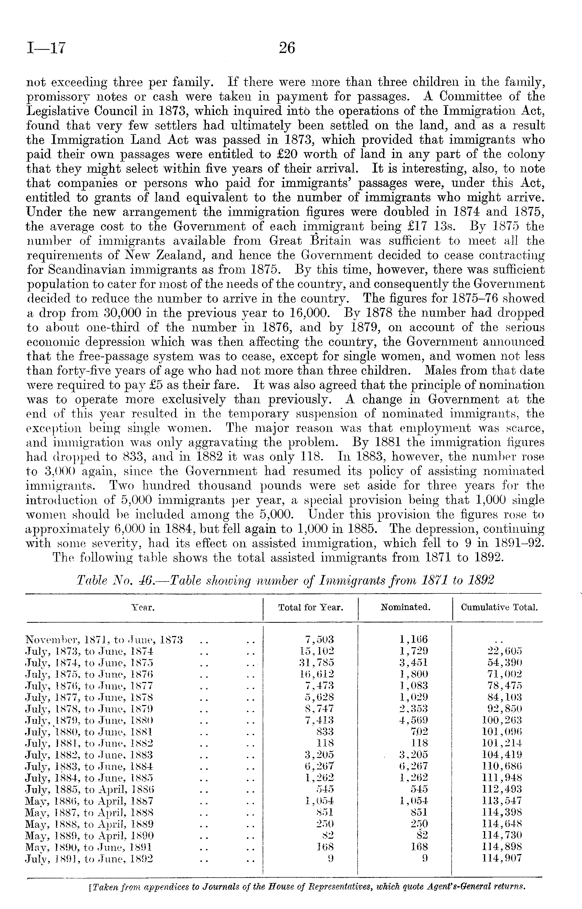 not exceeding three per family. If there were more than three children in the family, promissory notes or cash were taken in payment for passages. A Committee of the Legislative Council in 1873, which inquired into the operations of the Immigration Act, found that very few settlers had ultimately been settled on the land, and as a result the Immigration Land Act was passed in 1873, which provided that immigrants who paid their own passages were entitled to £2O worth of land in any part of the colony that they might select within five years of their arrival. It is interesting, also, to note that companies or persons who paid for immigrants' passages were, under this Act, entitled to grants of land equivalent to the number of immigrants who might arrive. Under the new arrangement the immigration figures were doubled in 1874 and 1875, the average cost to the Government of each immigrant being £l7 13s. By 1875 the number of immigrants available from Great Britain was sufficient to meet all the requirements of New Zealand, and hence the Government decided to cease contracting for Scandinavian immigrants as from 1875. By this time, however, there was sufficient population to cater for most of the needs of the country, and consequently the Government decided to reduce the number to arrive in the country. The figures for 1875-76 showed a drop from 30,000 in the previous year to 16,000. By 1878 the number had dropped to about one-third of the number in 1876, and by 1879, on account of the serious economic depression which was then affecting the country, the Government announced that the free-passage system was to cease, except for single women, and women not less than forty-five years of age who had not more than three children. Males from that date were required to pay £5 as their fare. It was also agreed that the principle of nomination was to operate more exclusively than previously. A change in Government at the end of this year resulted in the temporary suspension of nominated immigrants, the exception being single women. The major reason was that employment was scarce, and immigration was only aggravating the problem. By 1881 the immigration figures had dropped to 833, and in 1882 it was only 118. In 1883, however, the number rose to 3,000 again, since the Government had- resumed its policy of assisting nominated immigrants. Two hundred thousand pounds were set aside for three years for the introduction of 5,000 immigrants per year, a special provision being that 1,000 single women should be included among the 5,000. Under this provision the figures rose to approximately 6,000 in 1884, but fell again to 1,000 in 1885. The depression, continuing with some severity, had its effect on assisted immigration, which fell to 9 in 1891-92. The following table shows the total assisted immigrants from 1871 to 1892.