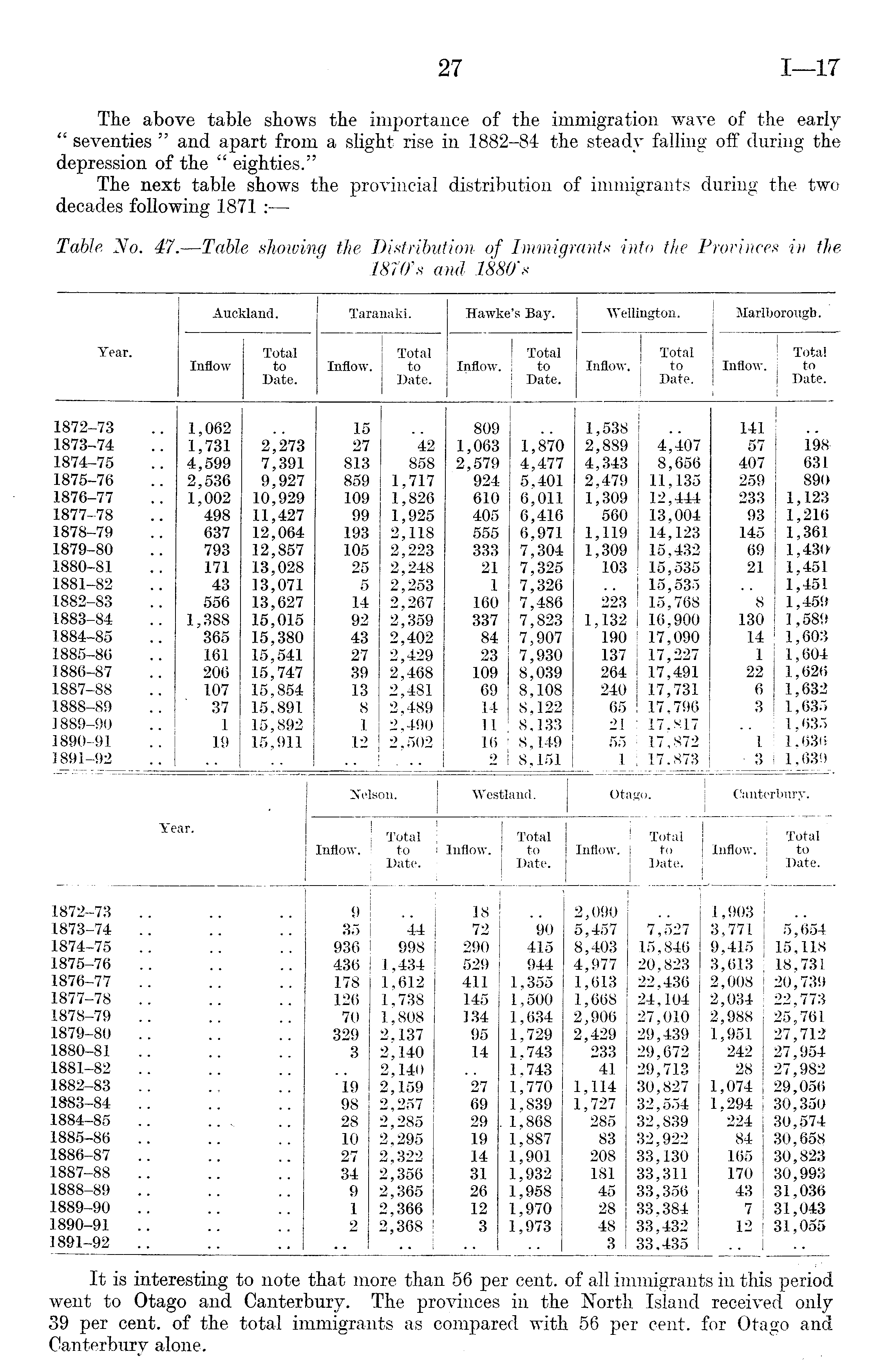 Auckland. Taranaki. Hawke's Bay. Wellington. Marlborough. Year. Total Total Total Total Total Inflow to Inflow. to Inflow. to Inflow. to Inflow to Date. Date. Date. Date. | Date. 1872-73 1,062 15 809 1,538 • 141 1 1873-74 1,731 2,273 27 42 1,063 1,870 2,889 4^407 57 i98 1874-75 4,599 7,391 813 858 2,579 4,477 4,343 8,656 407 631 1875-76 2,536 9,927 859 1,717 924 5,401 2,479 11,135 259 890 1876-77 1,002 10,929 109 1,826 610 6,011 1,309 12,444 233 1,123 1877-78 498 11,427 99 1,925 405 6,416 560 13,004 93 1,216 1878-79 637 12,064 193 2,118 555 6,971 1,119 14,123 145 1,361 1879-80 793 12,857 105 2,223 333 7,304 1,309 15,432 69 1,430' 1880-81 171 13,028 25 2,248 21 7,325 103 15,535 21 1.451 1881-82 43 13,071 5 2,253 1 7,326 15,535 1,451 1882-83 556 13,627 14 2,267 160 7,486 223 15,768 8 1,459 1883-84 1,388 15,015 92 2,359 337 7,823 1,132 16,900 130 1,589 1884-85 365 15,380 43 2,402 84 7,907 190 17,090 14 1,603 1885-86 161 15,541 27 2,429 23 7,930 137 17,227 1 1,604 1886-87 206 15,747 39 2,468 109 8,039 264 17,491 22 1,626 1887-88 107 15,854 13 2,481 69 8,108 240 17,731 6 1,632 1888-89 37 15,891 8 2,489 14 8,122 65 17,796 3 1,635 1889-90 1 15,892 1 2,490 11 8,133 21 17.817 1,635 1890-91 19 15,911 12 2,502 16 8,149 55 17,872 1 1,636 1891-92 I 1 2 1 8,151 1 1 17.873 3 I 1,639 Nelson. Westland. Otago. Canterbury. Year. Total Total Total I Total Inflow. to Inflow. to Inflow. to Inflow. to I Date. Date. Date. Date. 1872-73 .. 9 18 2,090 1,903 1873-74 .. 35 44 72 90 5,457 7,527 3,771 5,654 1874-75 936 998 290 415 8,403 15,846 9,415 15,118 1875-76 436 1,434 529 944 4,977 20,823 3,613 18,731 1876-77 178 1,612 411 1,355 1,613 22,436 2,008 20,739 1877-78 .. 126 1,738 145 1,500 1,668 24,104 2,034 22,773 1878-79 .. 70 1,808 134 1,634 2,906 27,010 2,988 25,761 1879-80 .. 329 2.137 95 1,729 2,429 29,439 1,951 27,712 1880-81 .. 3 2,140 14 1.743 233 29,672 242 27,954 1881-82 2,140 1,743 41 29,713 28 27,982 1882-83 .. 19 2,159 27 1,770 1,114 30,827 1,074 29,056 1883-84 .. 98 2,257 69 1,839 1,727 32,554 1.294 30,350 1884-85 .. .. 28 2,285 29 1,868 285 32,839 224 30,574 1885-86 .. 10 2,295 19 1,887 83 32,922 84 30,658 1886-87 .. 27 2,322 14 1,901 208 33,130 165 30,823 1887-88 .. 34 2,356 31 1,932 181 33,311 170 30,993 1888-89 .. 9 2,365 26 1,958 45 33,356 43 31,036 1889-90 .. 1 2,366 12 1,970 28 33,384 7 31,043 1890-91 .. 2 2,368 3 1,973 48 33,432 12 31,055 1891-92 .. 3 33,435