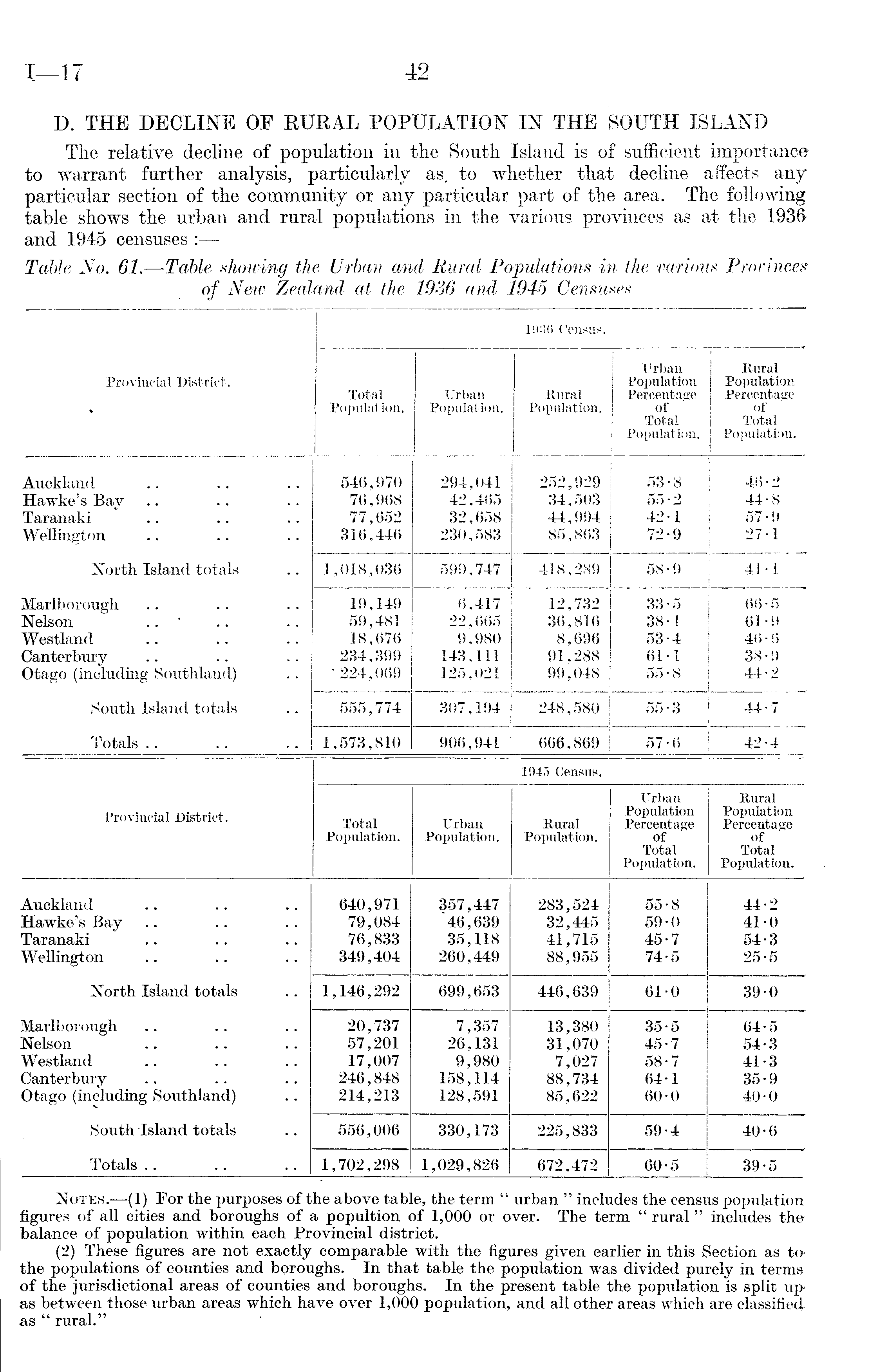 Table No. 61. —Table showing the Urban and Rural Populations in the various Provinces of New Zealand at the 1936 and 1945 Censuses