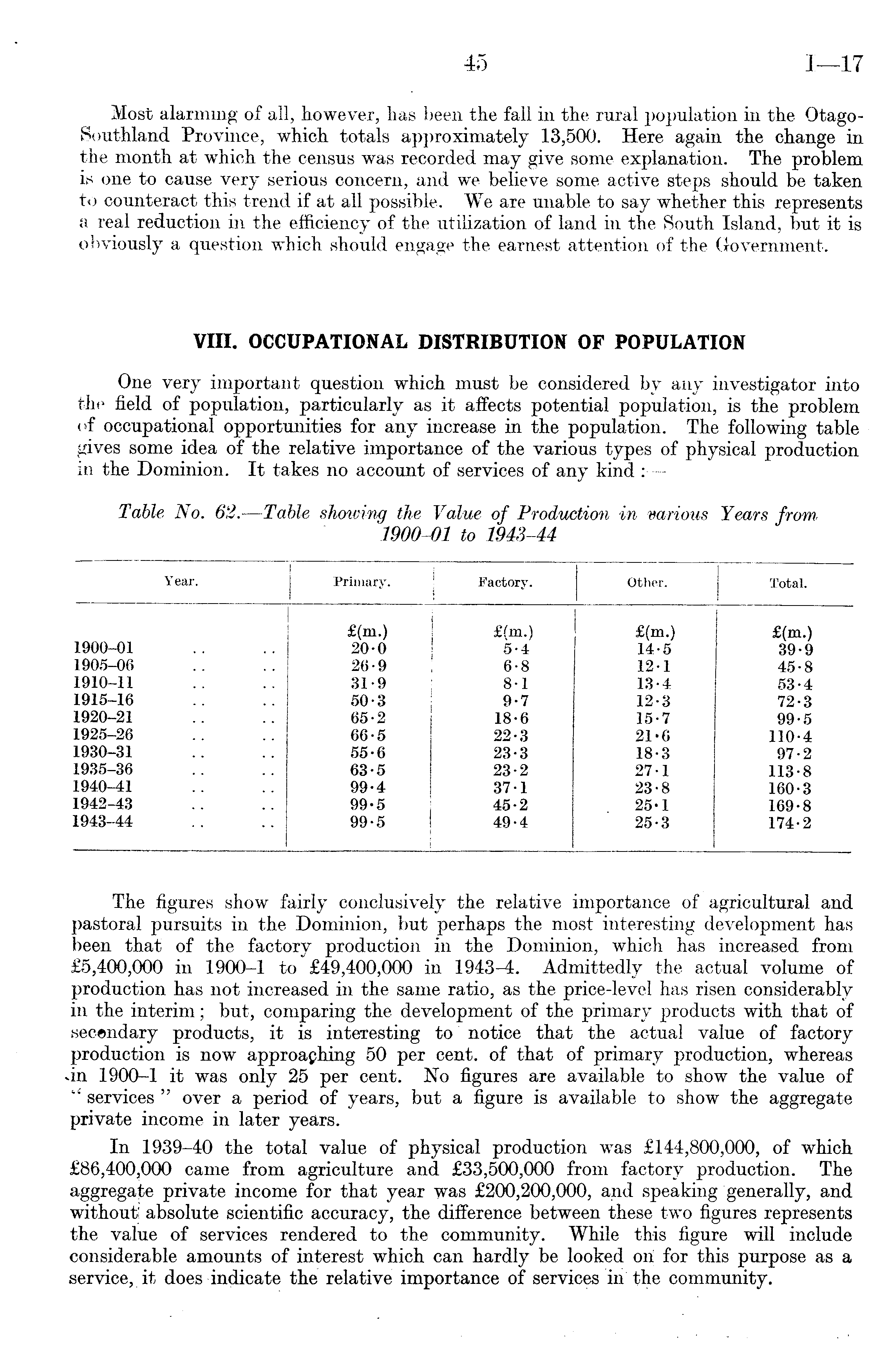 Most alarming of all, however, has been the fall in the rural population in the OtagoSouthland Province, which totals approximately 13,500. Here again the change in the month at which the census was recorded may give some explanation. The problem is one to cause very serious concern, and we believe some active steps should be taken to counteract this trend if at all possible. We are unable to say whether this represents a real reduction in the efficiency of the utilization of land in the South Island, but it is obviously a question which should engage the earnest attention of the Government. VIII. OCCUPATIONAL DISTRIBUTION OF POPULATION One very important question which must be considered by any investigator into the field of population, particularly as it affects potential population, is the problem of occupational opportunities for any increase in the population. The following table gives some idea of the relative importance of the various types of physical production in the Dominion. It takes no account of services of any kind :