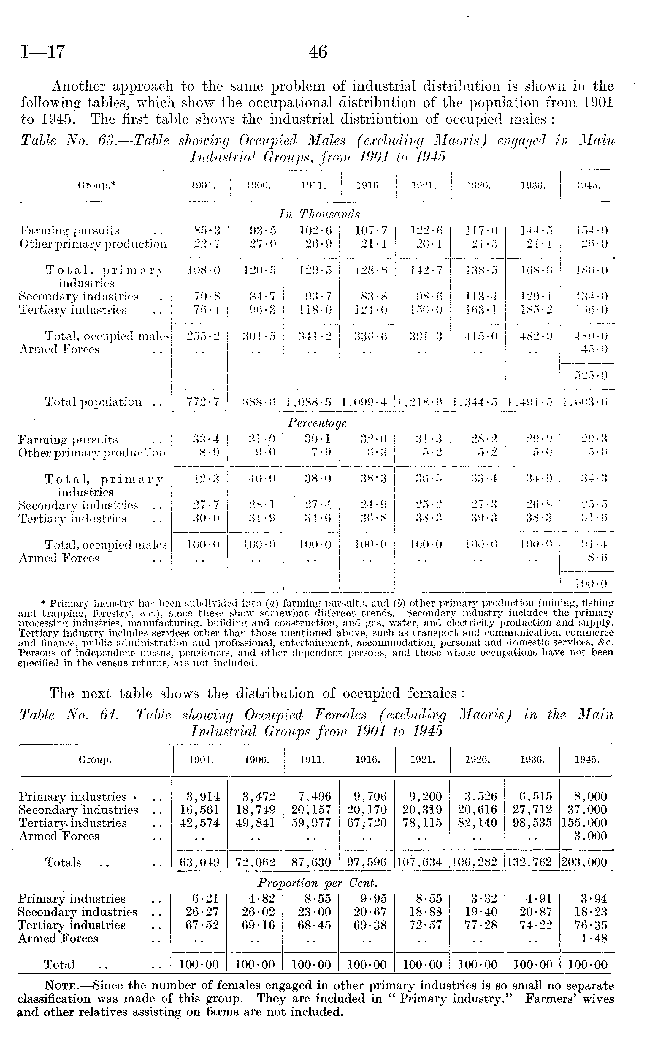 Group. 1901. 1906. 1911. 1916. 1921. 1926. 1936. 1945. Primary industries ♦ Secondary industries .. Tertiary, industries Armed Forces Totals ... Primary industries Secondary industries .. Tertiary industries Armed Forces Total 3,914 16,561 42,574 3,472 18,749 49,841 7,496 20,157 59,977 9,706 20,170 67,720 9,200 20,319 78,115 3,526 20,616 82,140 6,515 27,712 98,535 8,000 37,000 155,000 3,000 63,049 72,062 87,630 97,596 107,634 106,282 132,762 203.000 6-21 26-27 67-52 Pro% 4-82 26-02 69-16 portion pa 8-55 23-00 68-45 r Cent. 9-95 20-67 69-38 8-55 18-88 72-57 3-32 19-40 77-28 4-91 20-87 74-22 3-94 18-23 76-35 1-48 100-00 100-00 100-00 100-00 100-00 100-00 100-00 100-00