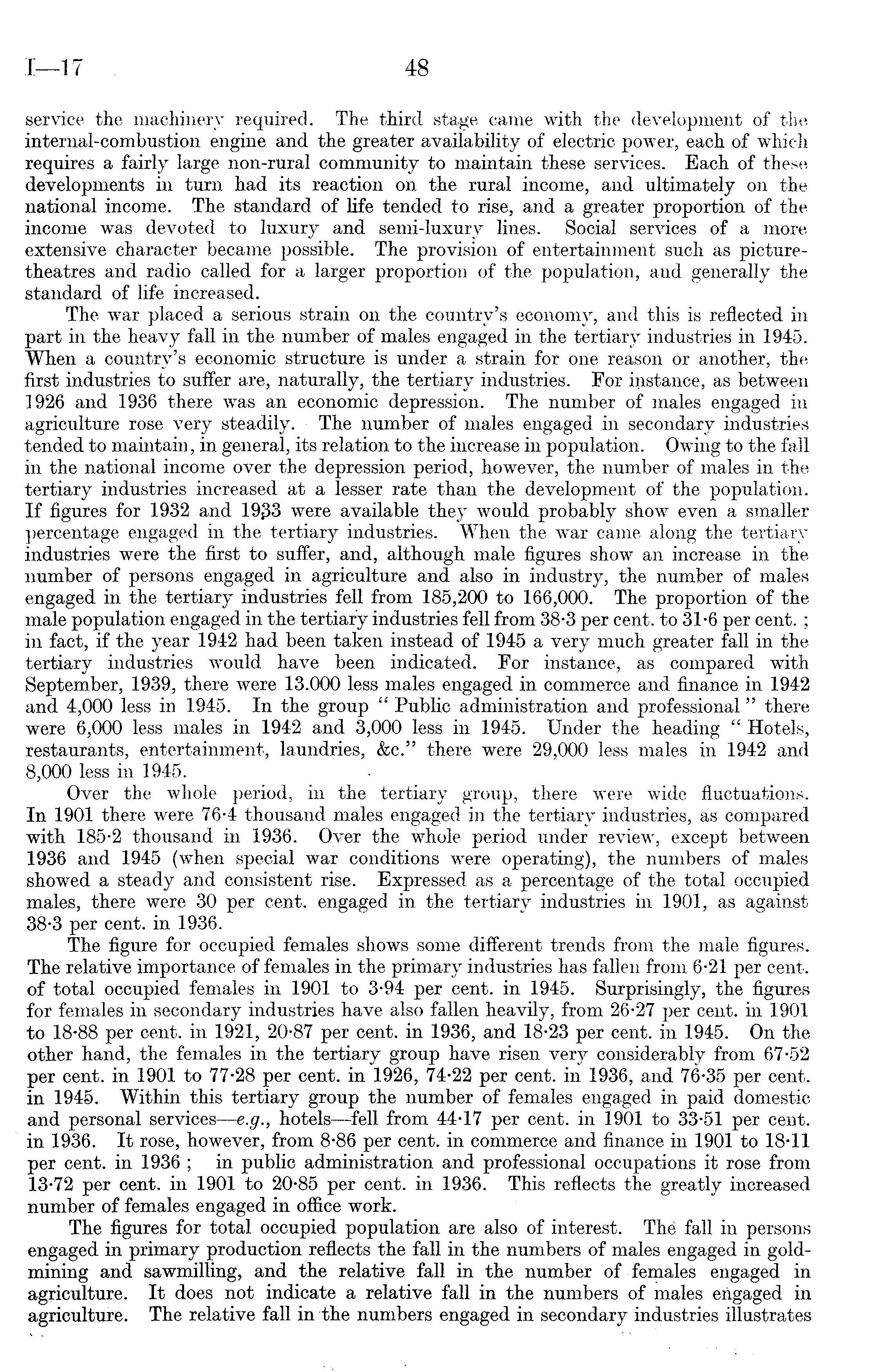 service the machinery required. The third stage came with the development of the internal-combustion engine and the greater availability of electric power, each of which requires a fairly large non-rural community to maintain these services. Each of these developments in turn had its reaction on the rural income, and ultimately on the national income. The standard of life tended to rise, and a greater proportion of the income was devoted to luxury and semi-luxury lines. Social services of a more extensive character became possible. The provision of entertainment such as picturetheatres and radio called for a larger proportion of the population, and generally the standard of life increased. The war placed a serious strain on the country's economy, and this is reflected in part in the heavy fall in the number of males engaged in the tertiary industries in 1945. When a country's economic structure is under a strain for one reason or another, the first industries to suffer are, naturally, the tertiary industries. For instance, as between 1926 and 1936 there was an economic depression. The number of males engaged in agriculture rose very steadily. The number of males engaged in secondary industries tended to maintain, in general, its relation to the increase in population. Owing to the fall in the national income over the depression period, however, the number of males in the tertiary industries increased at a lesser rate than the development of the population. If figures for 1932 and were available they would probably show even a smaller percentage engaged in the tertiary industries. When the war came along the tertiary industries were the first to suffer, and, although male figures show an increase in the number of persons engaged in agriculture and also in industry, the number of males engaged in the tertiary industries fell from 185,200 to 166,000. The proportion of the male population engaged in the tertiary industries fell from 38-3 per cent, to 31-6 per cent. ; in fact, if the year 1942 had been taken instead of 1945 a very much greater fall in the tertiary industries would have been indicated. For instance, as compared with September, 1939, there were 13.000 less males engaged in commerce and finance in 1942 and 4,000 less in 1945. In the group " Public administration and professional" there were 6,000 less males in 1942 and 3,000 less in 1945. Under the heading " Hotels, restaurants, entertainment, laundries, &c." there were 29,000 less males in 1942 and 8,000 less in 1945. Over the whole period, in the tertiary group, there were wide fluctuations. In 1901 there were 76-4 thousand males engaged in the tertiary industries, as compared with 185-2 thousand in 1936. Over the whole period under review, except between 1936 and 1945 (when special war conditions were operating), the numbers of males showed a steady and consistent rise. Expressed as a percentage of the total occupied males, there were 30 per cent, engaged in the tertiary industries in 1901, as against 38-3 per cent, in 1936. The figure for occupied females shows some different trends from the male figures. The relative importance of females in the primary industries has fallen from 6-21 per cent, of total occupied females in 1901 to 3-94 per cent, in 1945. Surprisingly, the figures for females in secondary industries have also fallen heavily, from 26-27 per cent, in 1901 to 18-88 per cent, in 1921, 20-87 per cent, in 1936, and 18-23 per cent, in 1945. On the other hand, the females in the tertiary group have risen very considerably from 67-52 per cent, in 1901 to 77-28 per cent, in 1926, 74-22 per cent, in 1936, and 76-35 per cent, in 1945. Within this tertiary group the number of females engaged in paid domestic and personal services—e.g., hotels—fell from 44-17 per cent, in 1901 to 33-51 per cent, in 1936. It rose, however, from 8-86 per cent, in commerce and finance in 1901 to 18-11 per cent, in 1936 ; in public administration and professional occupations it rose from 13-72 per cent, in 1901 to 20-85 per cent, in 1936. This reflects the greatly increased number of females engaged in office work. The figures for total occupied population are also of interest. The fall in persons engaged in primary production reflects the fall in the numbers of males engaged in goldmining and sawmilling, and the relative fall in the number of females engaged in agriculture. It does not indicate a relative fall in the numbers of males engaged in agriculture. The relative fall in the numbers engaged in secondary industries illustrates