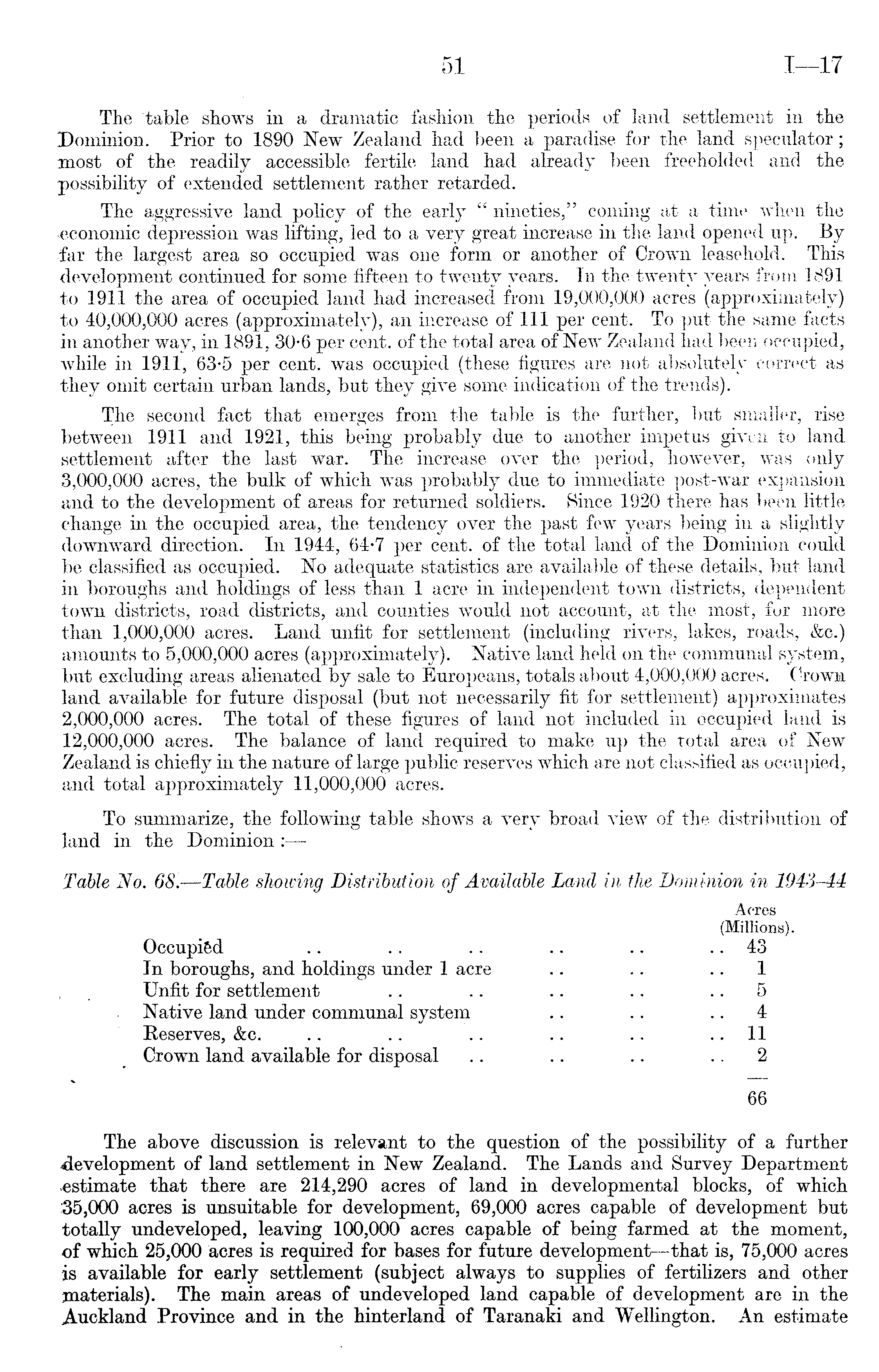 The table shows in a dramatic fashion the periods of land settlement in the Dominion. Prior to 1890 New Zealand had been a paradise for the land speculator; most of the readily accessible fertile land had already been freeholded and the possibility of extended settlement rather retarded. The aggressive land policy of the early " nineties," coming at a time when the .economic depression was lifting, led to a very great increase in the land opened up. By ■far the largest area so occupied was one form or another of Crown leasehold. This development continued for some fifteen to twenty years. In the twenty years from 1891 to 1911 the area of occupied land had increased from 19,000,000 acres (approximately) to 40,000,000 acres (approximately), an increase of 111 per cent. To put the same facts in another way, in 1891, 30-6 per cent, of the total area of New Zealand had been occupied, while in 1911, 63-5 per cent, was occupied (these figures are not absolutely correct as they omit certain urban lands, but they give some indication of the trends). The second fact that emerges from the table is the further, but. smaller, rise between 1911 and 1921, this being probably due to another impetus given to land settlement after the last war. The increase over the period, however, was only 3,000,000 acres, the bulk of which was probably due to immediate post-war expansion and to the development of areas for returned soldiers. Since 1920 there has been little change in the occupied area, the tendency over the past few years being in a slightly downward direction. In 1944, 64-7 per cent, of the total land of the Dominion could be classified as occupied. No adequate statistics are available of these details, but land in boroughs and holdings of less than 1 acre in independent town districts, dependent town districts, road districts, and counties would not account, at the most, for more than 1,000,000 acres. Land unfit for settlement (including rivers, lakes, roads, &c.) amounts to 5,000,000 acres (approximately). Native land held on the communal system, but excluding areas alienated by sale to Europeans, totals about 4,000,000 acres. Crown land available for future disposal (but not necessarily fit for settlement) approximates 2,000,000 acres. The total of these figures of land not included in occupied land is 12,000,000 acres. The balance of land required to make up the total area of New Zealand is chiefly in the nature of large public reserves which are not classified as occupied, and total approximately 11,000,000 acres. To summarize, the following table shows a very broad view of the distribution of land in the Dominion : Table No. 68.—Table showing Distribution of Available Land in the Dominion in 1943-44 Acres (Millions). Occupied .. .. .. .. .. .. 43 In boroughs, and holdings under 1 acre .. .. .. 1 Unfit for settlement .. .. .. .. ..5 Native land under communal system .. .. 4 Reserves, &c. .. .. .. .. .. .. 11 Crown land available for disposal .. .. .. 2 66 The above discussion is relevant to the question of the possibility of a further -development of land settlement in New Zealand. The Lands and Survey Department -estimate that there are 214,290 acres of land in developmental blocks, of which 35,000 acres is unsuitable for development, 69,000 acres capable of development but totally undeveloped, leaving 100,000 acres capable of being farmed at the moment, of which 25,000 acres is required for bases for future development—that is, 75,000 acres is available for early settlement (subject always to supplies of fertilizers and other materials). The main areas of undeveloped land capable of development are in the Auckland Province and in the hinterland of Taranaki and Wellington. An estimate