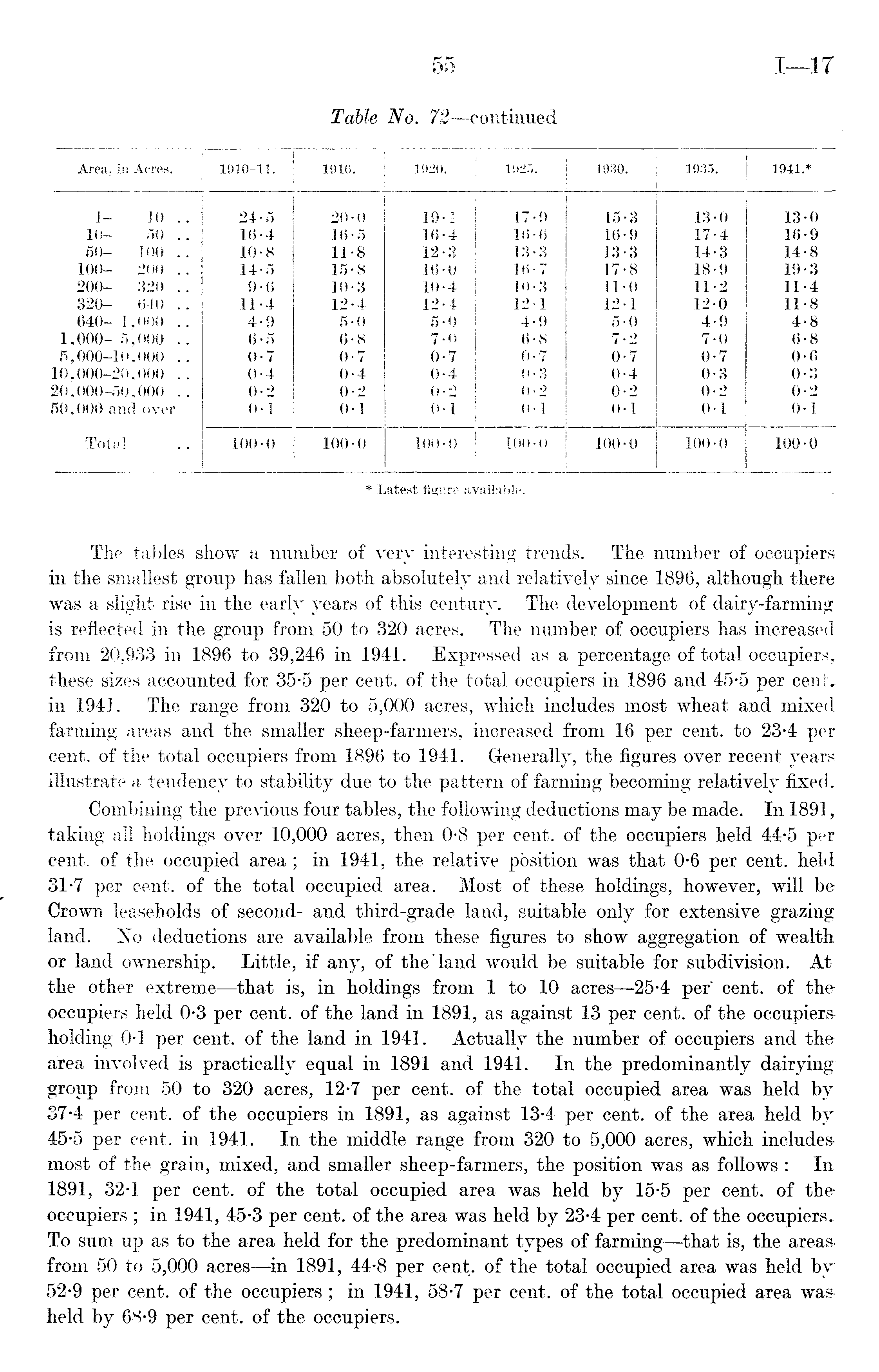 Area, in Ac-res. 1910-11. 1916. 1920. 1 1925. 1930. 1935. 1941.* 1- 10 .. 24-5 20-0 19-1 17-9 15-3 13-0 13-0 10- 50 . . 16-4 16 • 5 16-4 16-6 16-9 17-4 16-9 50- 100 .. 10-8 11-8 12-3 13-3 13-3 14-3 14-8 100- 200 .. 14-5 15-8 16-0 16-7 17-8 18-9 19-3 200- 320 .. 9-6 10-3 10-4 10-3 11-0 11-2 11-4 320- 640 .. 11-4 12-4 12-4 12-1 12-1 120 11-8 640- 1,000 .. 4-9 5-0 5-0 4-9 5-0 4-9 4-8 1,000- 5,000 .. 6-5 6-8 7-0 6-8 7-2 7-0 6-8 5,000-10,000 .. 0-7 0-7 0-7 0-7 0-7 0-7 0-6 10,000-20,000 .. 0-4 0-4 0-4 0-3 0-4 0-3 0-3 20,000-50,000 .. 0-2 0-2 0-2 0-2 0-2 0-2 0-2 50,000 and over 01 0-1 01 0-1 0-1 0-1 0-1 Total 100-0 100-0 100-0 100-0 100-0 100-0 100-0 * Latest figure available.