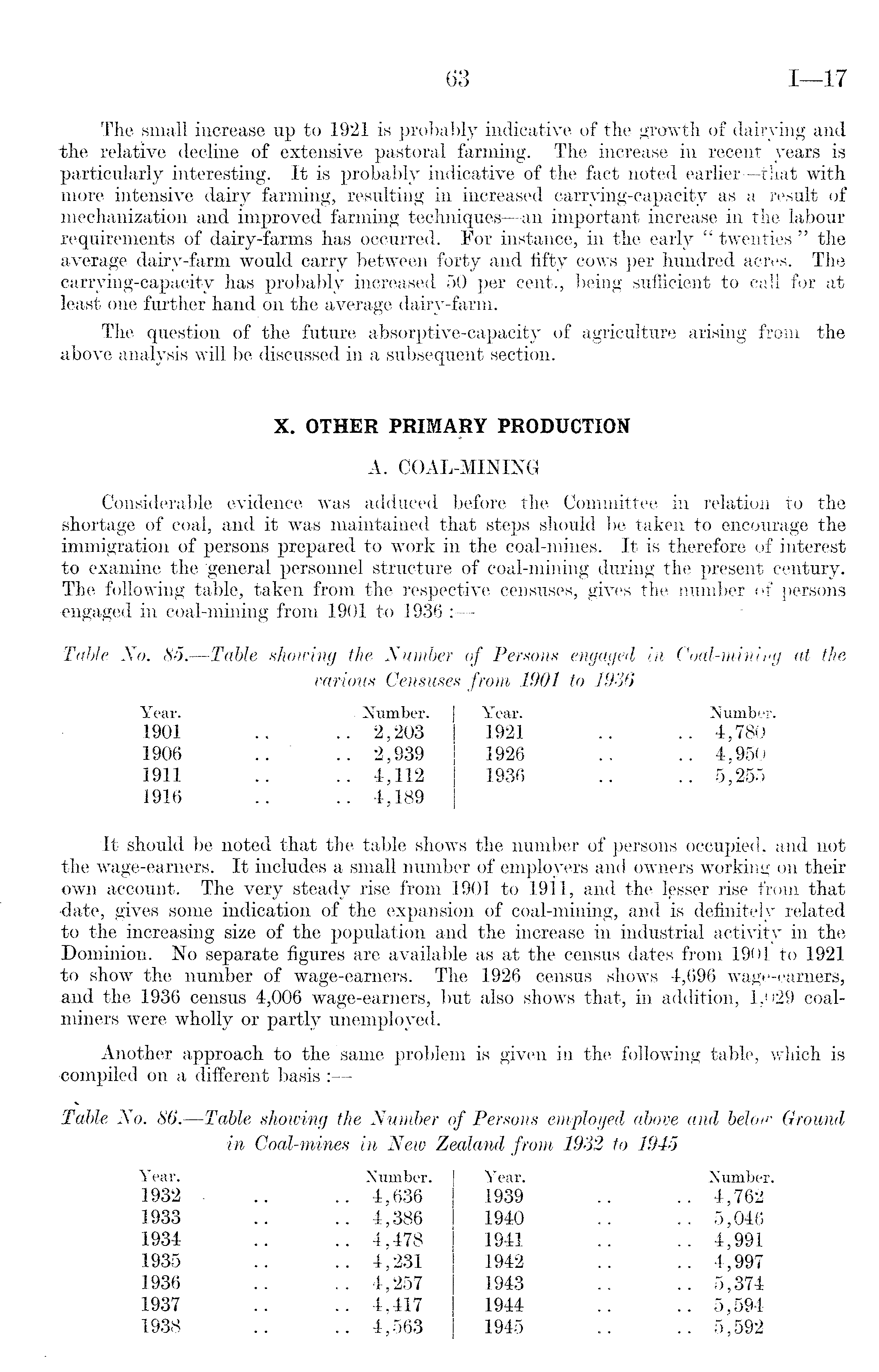 The small increase up to 1921 is probably indicative of the growth of dairying and the relative decline of extensive pastoral farming. The increase in recent years is particularly interesting. It is probably indicative of the fact noted earlier —that with more intensive dairy farming, resulting in increased carrying-capacity as a result of mechanization and improved farming techniques—an important increase in the labour requirements of dairy-farms has occurred. For instance, in the early " twenties " the average dairy-farm would carry between forty and fifty cows per hundred acres. The carrying-capacity has probably increased 50 per cent., being sufficient to call for at least one further hand 011 the average dairy-farm. The question of the future absorptive-capacity of agriculture arising from the above analysis will be discussed in a subsequent section. X. OTHER PRIMARY PRODUCTION A. COAL-MINING Considerable evidence was adduced before the Committee in' relation to the shortage of coal, and it was maintained that steps should be taken to encourage the immigration of persons prepared to work in the coal-mines. It is therefore of interest to examine the general personnel structure of coal-mining during the present century. The following table, taken from the respective censuses, gives the number of persons engaged in coal-mining from 1901 to 1936 : Table No. 85.—Table showing the Number of Persons engaged in Coal-mining at the various Censuses from 1901 to 1936 Year. Number. Year. Number. 1901 .. .. 2,203 1921 .. .. 4', 780 1906 .. ' .. 2,939 1926 .. .. 4,950 1911 .. .. 4,112 1936 .. .. 5,255 1916 .. ..4,189 It should be noted that the table shows the number of persons occupied, and not the wage-earners. It includes a small number of employers and owners working on their own account. The very steady rise from 1901 to 1911, and the lesser rise from that date, gives some indication of the expansion of coal-mining, and is definitely related to the increasing size of the population and the increase in industrial activity in the Dominion. No separate figures are available as at the census dates from 1901 to 1921 to show the number of wage-earners. The 1926 census shows 4,696 wage-earners, and the 1936 census 4,006 wage-earners, but also shows that, in addition, 1,029 coalminers were wholly or partly unemployed. Another approach to the same problem is given in the following table, which is •compiled on a different basis : Table No. 86.—Table showing the Number of Persons employed above and below Ground in Coal-mines in New Zealand from 1932 to 1945 Year. Number. Year. Number. 1932 .. ..4,636 1939 .. .. 4,762 1933 .. .. 4,386 1940 .. .. 5,046 1934 .. .. 4,478 1941 .. .. 4,991 1935 .. ..4,231 1942 .. .. 4,997 1936 .. .. 4,257 1943 .. .. 5,374 1937 .. .. 4,417 1944 .. .. 5,594 1938 .. .. 4,563 1945 .. .. 5,592