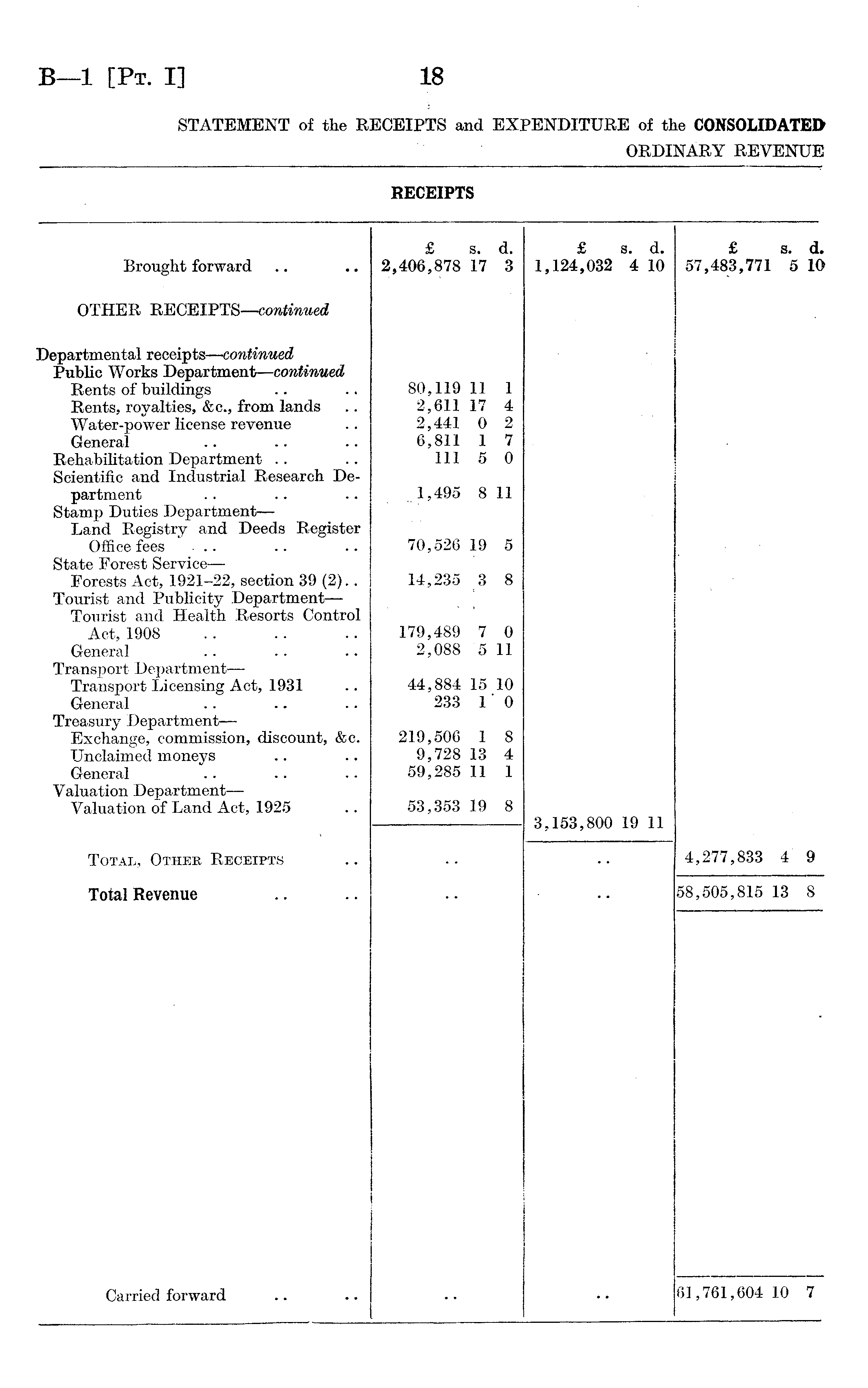 RECEIPTS £ s. d. £ a. d. £ s. d. Brought forward 2,406,878 17 3 1,124,032 4 10 57,483,771 5 10 OTHER RECEIPTS—continued Departmental receipts—continued Public Works Department—continued Rents of buildings 80,119 11 1 Rents, royalties, &c., from lands 2,611 17 4 Water-power license revenue 2,441 0 2 General 6,811 1 7 Rehabilitation Department 111 5 0 ■ >■ Scientific and Industrial Research Department 1,495 8 11 Stamp Duties Department— Land Registry and Deeds Register Office fees ... 70,526 19 5 State Forest Service — Forests Act, 1921-22, section 39 (2).. 14,235 3 8 Tourist and Publicity Department— Tourist and Health Resorts Control Act, 1908 179,489 7 0 General 2,088 '5 11 Transport Department— Transport Licensing Act, 1931 44,884 15 10 General 233 1 0 Treasury Department— Exchange, commission, discount, &c. 219,506 1 8 Unclaimed moneys 9,728 13 4 General 59,285 11 1 Valuation Department— 53,353 19 8 Valuation of Land Act, 1925 3 153 800 19 11 Total, Other Receipts 4,277,833 4 9 Total Revenue 58,505,815 13 8 Carried forward 61,761,604 10 7