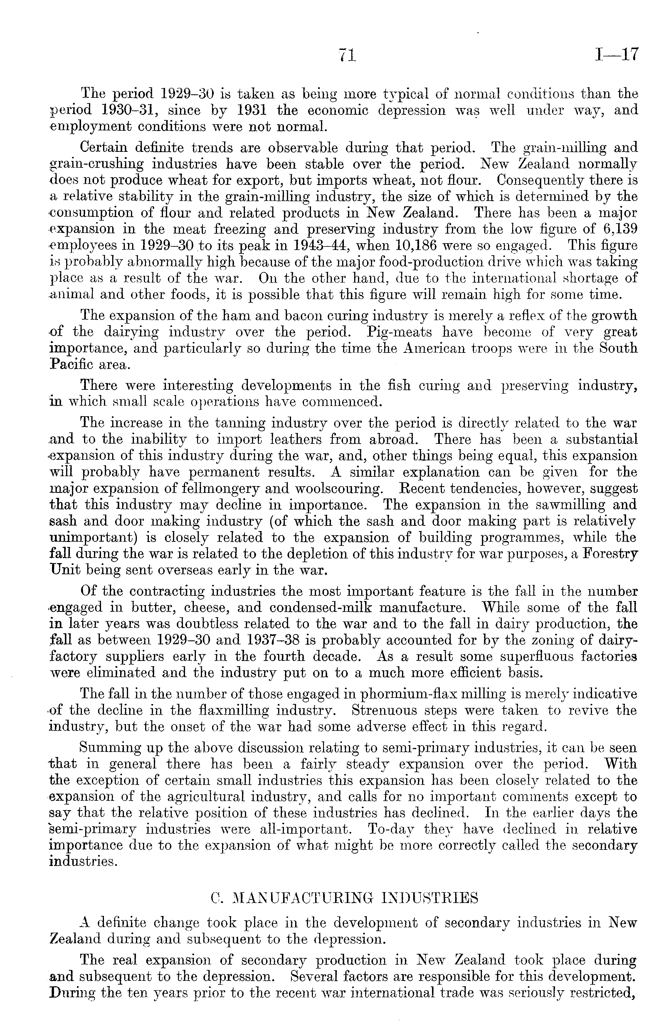 The period 1929-30 is taken as being more typical of normal conditions than the period 1930-31, since by 1931 the economic depression was well under way, and employment conditions were not normal. Certain definite trends are observable during that period. The grain-milling and grain-crushing industries have been stable over the period. New Zealand normally does not produce wheat for export, but imports wheat, not flour. Consequently there is a relative stability in the grain-milling industry, the size of which is determined by the consumption of flour and related products in New Zealand. There has been a major •expansion in the meat freezing and preserving industry from the low figure of 6,139 ■employees in 1929-30 to its peak in 1943-M, when 10,186 were so engaged. This figure is probably abnormally high because of the major food-production drive which was taking place as a result of the war. On the other hand, due to the international shortage of •animal and other foods, it is possible that this figure will remain high for some time. The expansion of the ham and bacon curing industry is merely a reflex of the growth of the dairying industry over the period. Pig-meats have become of very great importance, and particularly so during the time the American troops were in the South Pacific area. There were interesting developments in the fish curing and preserving industry, in which small scale operations have commenced. The increase in the tanning industry over the period is directly related to the war and to the inability to import leathers from abroad. There has been a substantial •expansion of this industry during the war, and, other things being equal, this expansion will probably have permanent results. A similar explanation can be given for the major expansion of fellmongery and woolscouring. Recent tendencies, however, suggest that this industry may decline in importance. The expansion in the sawmilling and sash and door making industry (of which the sash and door making part is relatively unimportant) is closely related to the expansion of building programmes, while the fall during the war is related to the depletion of this industry for war purposes, a Forestry Unit being sent overseas early in the war. Of the contracting industries the most important feature is the fall in the number •engaged in butter, cheese, and condensed-milk manufacture. While some of the fall in later years was doubtless related to the war and to the fall in dairy production, the fall as between 1929-30 and 1937-38 is probably accounted for by the zoning of dairyfactory suppliers early in the fourth decade. As a result some superfluous factories were eliminated and the industry put on to a much more efficient basis. The fall in the number of those engaged in phormium-flax milling is merely indicative •of the decline in the flaxmilling industry. Strenuous steps were taken to revive the industry, but the onset of the war had some adverse effect in this regard. Summing up the above discussion relating to semi-primary industries, it can be seen that in general there has been a fairly steady expansion over the period. With the exception of certain small industries this expansion has been closely related to the expansion of the agricultural industry, and calls for no important comments except to say that the relative position of these industries has declined. In the earlier days the semi-primary industries were all-important. To-day they have declined in relative importance due to the expansion of what might be more correctly called the secondary industries. C. MANUFACTURING INDUSTRIES A definite change took place in the development of secondary industries in New Zealand during and subsequent to the depression. The real expansion of secondary production in New Zealand took place during and subsequent to the depression. Several factors are responsible for this development. During the ten years prior to the recent war international trade was seriously restricted,