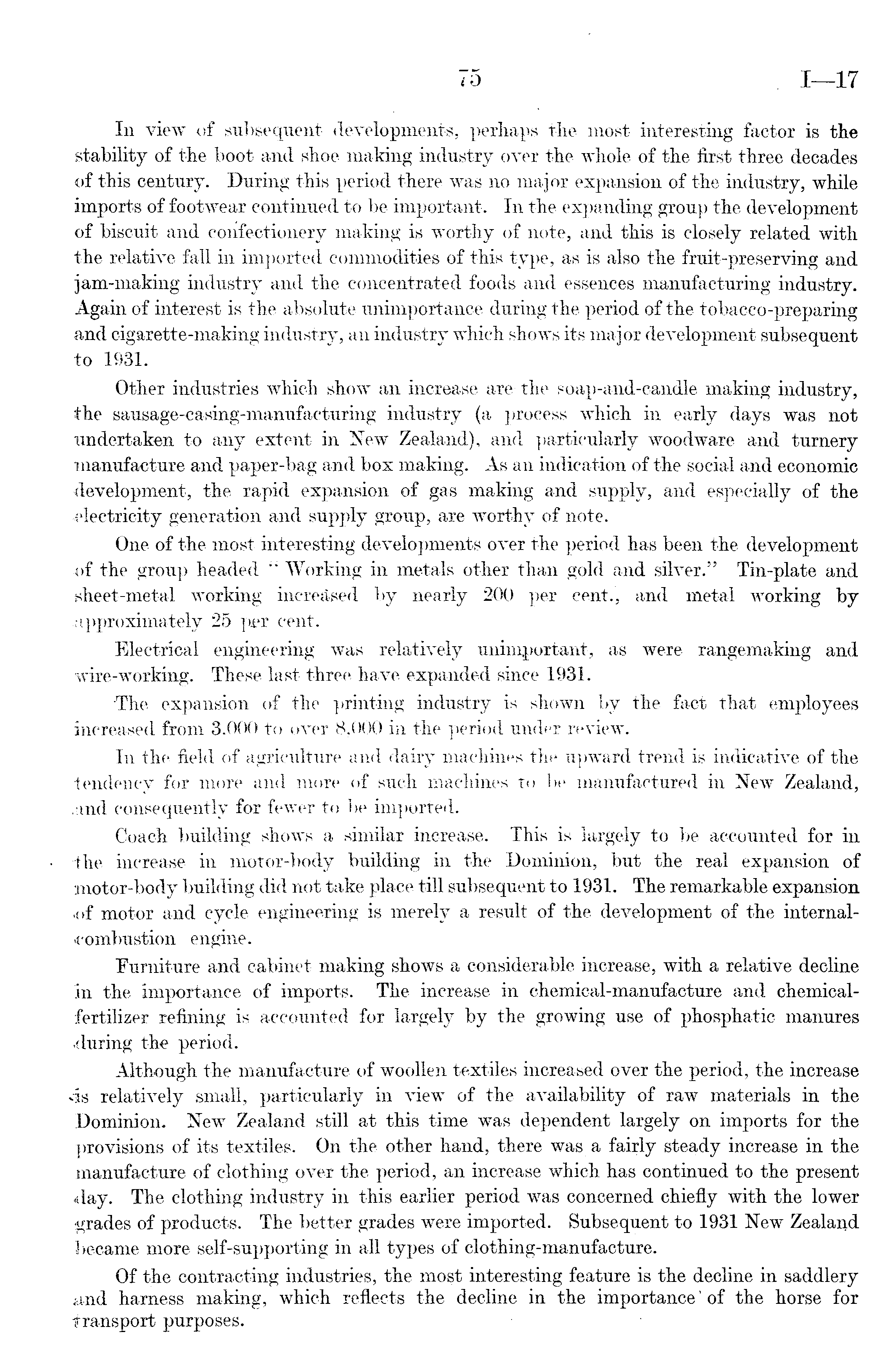 In view of subsequent developments, perhaps the most interesting factor is the stability of the boot and shoe making industry over the whole of the first three decades of this century. During this period there was no major expansion of the industry, while imports of footwear continued to be important. In the expanding group the development of biscuit and confectionery making is worthy of note, and this is closely related with the relative fall in imported commodities of this type, as is also the fruit-preserving and jam-making industry and the concentrated foods and essences manufacturing industry. Again of interest is the absolute unimportance during the period of the-tobacco-preparing and cigarette-making industry, an industry which shows its major development subsequent to 1931. Other industries which show an increase are' the soap-and-candle making industry, "the sausage-casing-manufacturing industry (a process which in early days was not undertaken to any extent in New Zealand), and particularly woodware and turnery manufacture and paper-bag and box making. As an indication of the social and economic development, the rapid expansion of gas making and supply, and especially of the ■electricity generation and supply group, are worthy of note. One of the most interesting developments over the period has been the development <of the group headed " Working in metals other than gold and silver." Tin-plate and sheet-metal working increased by nearly 200 per cent., and metal working by .approximately 25 per cent. Electrical engineering was relatively unimportant, as were rangemaking and wire-working. These last three have expanded since 1931. The expansion of the printing industry is shown by the fact that employees increased from 3,000 to over 8,000 in the period under review. In the field of agriculture and dairy machines the upward trend is indicative of the tendency for more and more of such machines to be manufactured in New Zealand, .and consequently for fewer to be imported. Coach building shows a similar increase. This is largely to be accounted for in -the increase in motor-body building in the Dominion, but the real expansion of motor-body building did not take place till subsequent to 1931. The remarkable expansion of motor and cycle engineering is merely a result of the development of the internalcombustion engine. Furniture and cabinet making shows a considerable increase, with a relative decline in the importance of imports. The increase in chemical-manufacture and chemicalfertilizer refining is accounted for largely by the growing use of phosphatic manures during the period. Although the manufacture of woollen textiles increased over the period, the increase 4s relatively small, particularly in view of the availability of raw materials in the Dominion. New Zealand still at this time was dependent largely on imports for the provisions of its textiles. On the other hand, there was a fairly steady increase in the manufacture of clothing over the period, an increase which has continued to the present •day. The clothing industry in this earlier period was concerned chiefly with the lower grades of products. The better grades were imported. Subsequent to 1931 New Zealand became more self-supporting in all types of clothing-manufacture. Of the contracting industries, the most interesting feature is the decline in saddlery and harness making, which reflects the decline in the importance' of the horse for transport purposes.