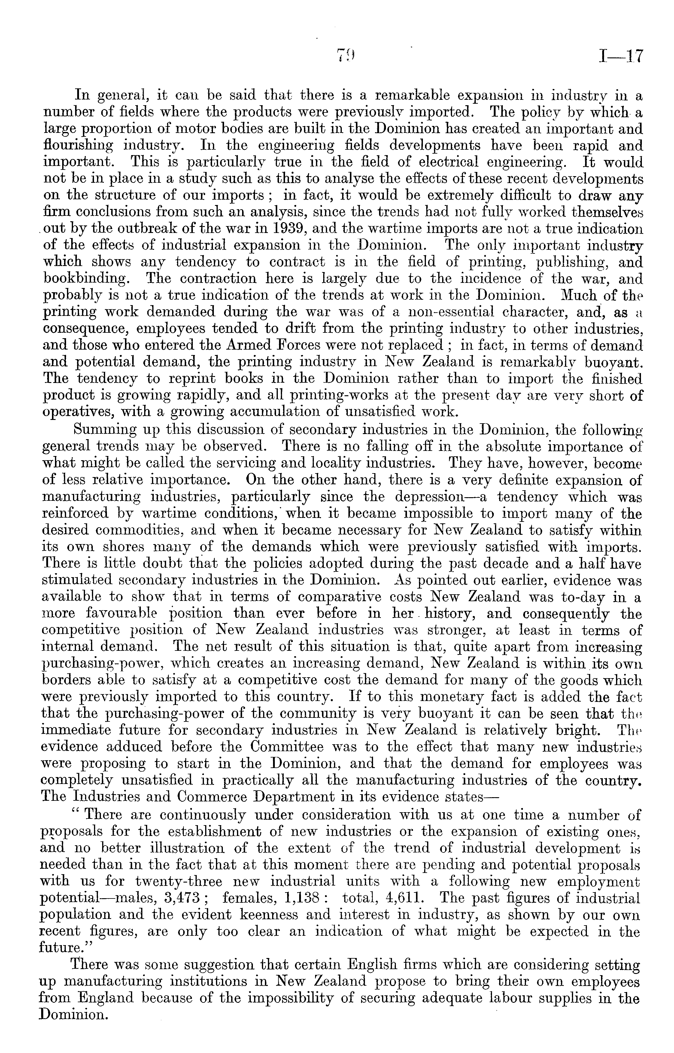 In general, it can be said that there is a remarkable expansion in industry in a number of fields where the products were previously imported. The policy by which a large proportion of motor bodies are built in the Dominion has created an important and flourishing industry. In the engineering fields developments have been rapid and important. This is particularly true in the field of electrical engineering. It would not be in place in a study such as this to analyse the effects of these recent developments on the structure of our imports ; in fact, it would be extremely difficult to draw any firm conclusions from such an analysis, since the trends had not fully worked themselves . out by the outbreak of the war in 1939, and the wartime imports are not a true indication of the effects of industrial expansion in the Dominion. The only important industry which shows any tendency to contract is in the field of printing, publishing, and bookbinding. The contraction here is largely due to the incidence of the war, and probably is not a true indication of the trends at work in the Dominion. Much of the printing work demanded during the war was of a non-essential character, and, as a consequence, employees tended to drift from the printing industry to other industries, and those who entered the Armed Forces were not replaced ; in fact, in terms of demand and potential demand, the printing industry in New Zealand is remarkably buoyant. The tendency to reprint books in the Dominion rather than to import the finished product is growing rapidly, and all printing-works at the present day are very short of operatives, with a growing accumulation of unsatisfied work. Summing up this discussion of secondary industries in the Dominion, the following general trends may be observed. There is no falling off in the absolute importance of what might be called the servicing and locality industries. They have, however, become of less relative importance. On the other hand, there is a very definite expansion of manufacturing industries, particularly since the depression—a tendency which was reinforced by wartime conditions,' when it became impossible to import many of the desired commodities, and when it became necessary for New Zealand to satisfy within its own shores many of the demands which were previously satisfied with imports. There is little doubt that the policies adopted during the past decade and a half have stimulated secondary industries in the Dominion. As pointed out earlier, evidence was available to show that in terms of comparative costs New Zealand was to-day in a more favourable position than ever before in her. history, and consequently the competitive position of New Zealand industries was stronger, at least in terms of internal demand. The net result of this situation is that, quite apart from increasing purchasing-power, which creates an increasing demand, New Zealand is within its own borders able to satisfy at a competitive cost the demand for many of the goods which were previously imported to this country. If to this monetary fact is added the fact that the purchasing-power of the community is very buoyant it can be seen that the immediate future for secondary industries in New Zealand is relatively bright. The evidence adduced before the Committee was to the effect that many new industries were proposing to start in the Dominion, and that the demand for employees was completely unsatisfied in practically all the manufacturing industries of the country. The Industries and Commerce Department in its evidence states — " There are continuously under consideration with us at one time a number of proposals for the establishment of new industries or the expansion of existing ones, and no better illustration of the extent of the trend of industrial development is needed than in the fact that at this moment there are pending and potential proposals with us for twenty-three new industrial units with a following new employment potential—males, 3,473 ; females, 1,138 : total, 4,611. The past figures of industrial population and the evident keenness and interest in industry, as shown by our own recent figures, are only too clear an indication of what might be expected in the future." There was some suggestion that certain English firms which are considering setting up manufacturing institutions in New Zealand propose to bring their own employees from England because of the impossibility of securing adequate labour supplies in the Dominion.