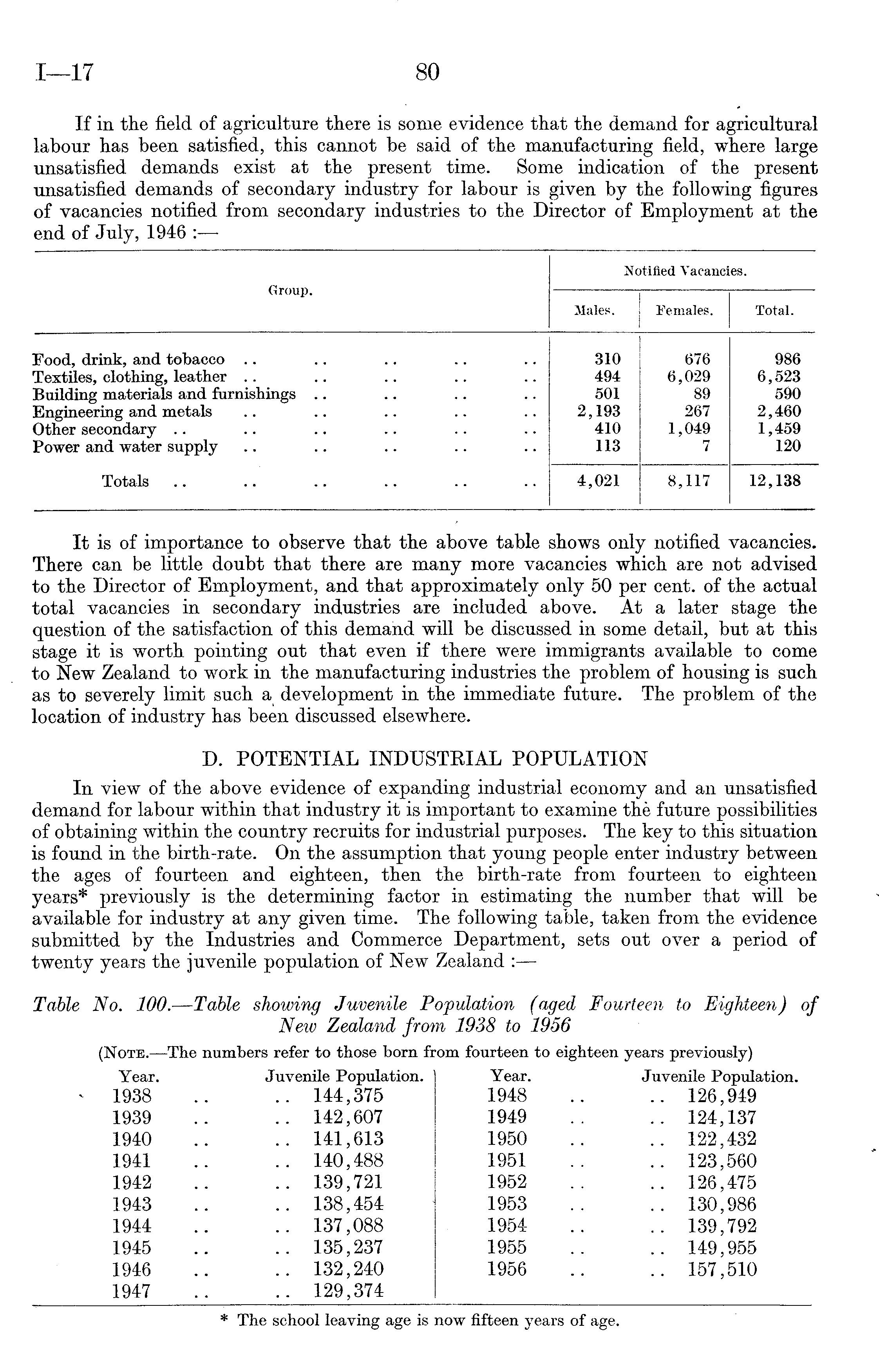It is of importance to observe that the above table shows only notified vacancies. There can be little doubt that there are many more vacancies which are not advised to the Director of Employment, and that approximately only 50 per cent, of the actual total vacancies in secondary industries are included above. At a later stage the question of the satisfaction of this demand will be discussed in some detail, but at this stage it is worth pointing out that even if there were immigrants available to come to New Zealand to work in the manufacturing industries the problem of housing is such as to severely limit such a development in the immediate future. The problem of the location of industry has been discussed elsewhere. D. POTENTIAL INDUSTRIAL POPULATION In view of the above evidence of expanding industrial economy and an unsatisfied demand for labour within that industry it is important to examine the future possibilities of obtaining within the country recruits for industrial purposes. The key to this situation is found in the birth-rate. On the assumption that young people enter industry between the ages of fourteen and eighteen, then the birth-rate from fourteen to eighteen years* previously is the determining factor in estimating the number that will be available for industry at any given time. The following table, taken from the evidence submitted by the Industries and Commerce Department, sets out over a period of twenty years the juvenile population of New Zealand : Table No. 100.—Table showing Juvenile Population (aged Fourteen to Eighteen) of New Zealand from 1938 to 1956 (Note.—The numbers refer to those born from fourteen to eighteen years previously) Year. Juvenile Population. Year. Juvenile Population. - 1938 .. .. 144,375 1948 .. .. 126,949 1939 .. .. 142,607 1949 .. .. 124,137 1940 .. .. 141,613 1950 .. .. 122,432 1941 .. .. 140,488 1951 .. .. 123,560 1942 .. .. 139,721 1952 .. .. 126,475 1943 .. .. 138,454 1953 .. .. 130,986 1944 .. .. 137,088 1954 .. .. 139,792 1945 .. .. 135,237 1955 .. .. 149,955 1946 .. .. 132,240 1956 .. .. 157,510 1947 .. 129,374