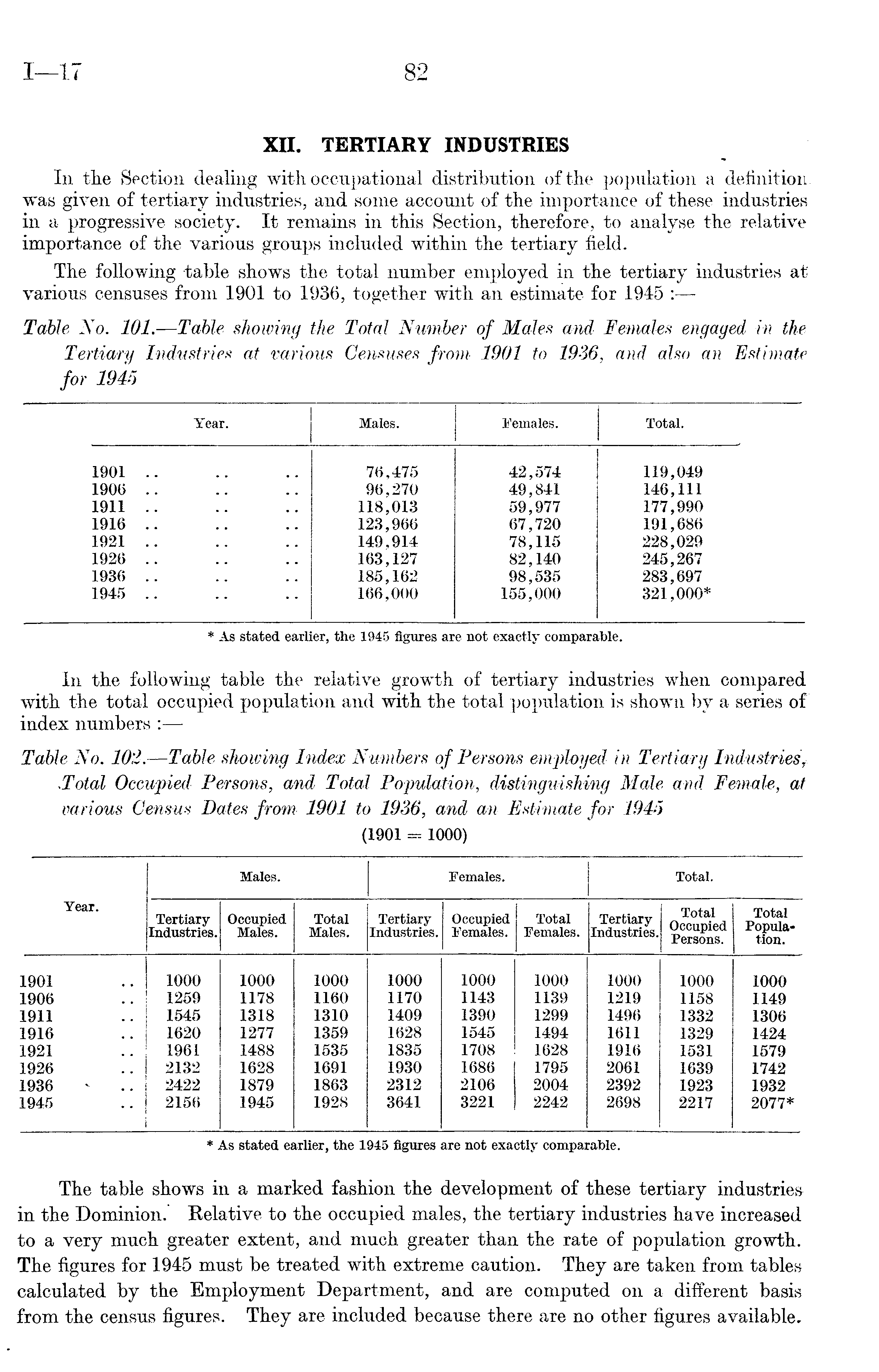 (1901 = 1000) Males. Females. Total. Year. TertiaryOccupied Total Tertiary Occupied Total Tertiary Total Total Industries. Males. Males. Industries. Females. Females. Industries. Occupied Persons. Population. 1901 1000 1000 1000 1000 1000 1000 1000 1000 1000 1906 1259 1178 1160 1170 1143 1139 1219 1158 1149 1911 1545 1318 1310 1409 1390 1299 1496 1332 1306 1916 1620 1277 1359 1628 4545 1494 1611 1329 1424 1921 1961 1488 1535 1835 1708 1628 1916 1531 1579 1926 2132 1628 1691 1930 1686 1795 2061 1639 1742 1936 2422 1879 1863 2312 2106 2004 2392 1923 1932 1945 2156 1945 1928 3641 3221 2242 2698 2217 2077* * As stated earlier, the 1945 figures are not exactly comparable.