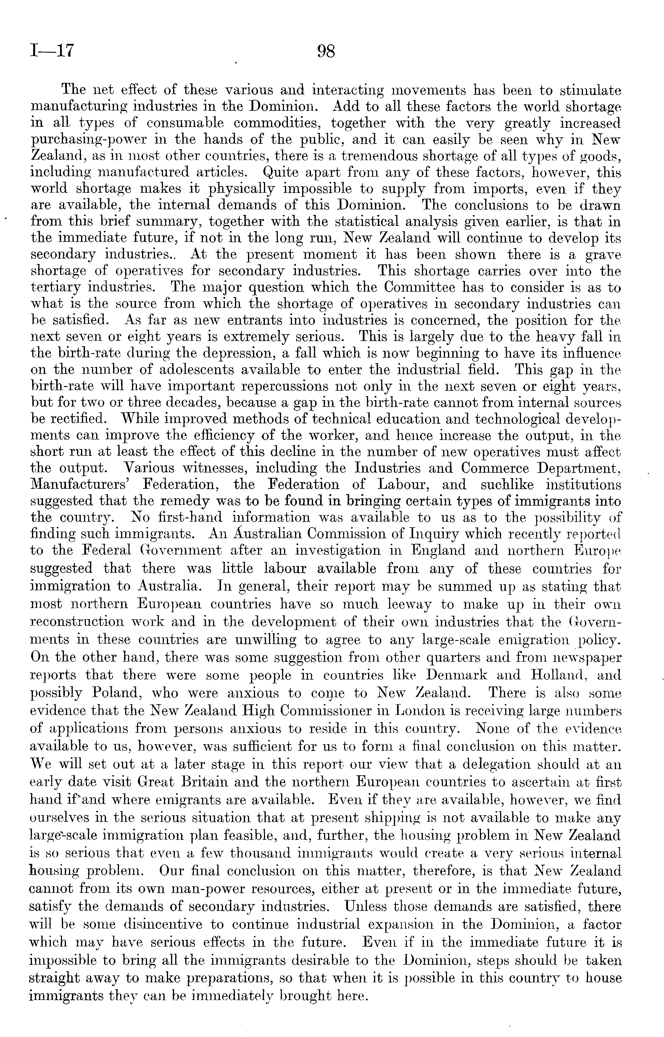 The net effect of these various and interacting movements has been to stimulate manufacturing industries in the Dominion. Add to all these factors the world shortage in all types of consumable commodities, together with the very greatly increased purchasing-power in the hands of the public, and it can easily be seen why in New Zealand, as in most other countries, there is a tremendous shortage of all types of goods, including manufactured articles. Quite apart from any of these factors, however, this world shortage makes it physically impossible to supply from imports, even if they are available, the internal demands of this Dominion. The conclusions to be drawn from this brief summary, together with the statistical analysis given earlier, is that in the immediate future, if not in the long run, New Zealand will continue to develop its secondary industries.. At the present moment it has been shown there is a grave shortage of operatives for secondary industries. This shortage carries over into the tertiary industries. The major question which the Committee has to consider is as to what is the source from which the shortage of operatives in secondary industries can be satisfied. As far as new entrants into industries is concerned, the position for the next seven or eight years is extremely serious. This is largely due to the heavy fall in the birth-rate during the depression, a fall which is now beginning to have its influence on the number of adolescents available to enter the industrial field. This gap in the birth-rate will have important repercussions not only in the next seven or eight years, but for two or three decades, because a gap in the birth-rate cannot from internal sources be rectified. While improved methods of technical education and technological developments can improve the efficiency of the worker, and hence increase the output, in the short run at least the effect of this decline in the number of new operatives must affect the output. Various witnesses, including the Industries and Commerce Department, Manufacturers' Federation, the Federation of Labour, and suchlike institutions suggested that the remedy was to be found in bringing certain types of immigrants into the country. No first-hand information was available to us as to the possibility of finding such immigrants. An Australian Commission of Inquiry which recently reported to the Federal Government after an investigation in England and northern Europe suggested that there was little labour available from any of these countries for immigration to Australia. In general, their report may be summed up as stating that most northern European countries have so much leeway to make up in their own reconstruction work and in the development of their own industries that the Governments in these countries are unwilling to agree to any large-scale emigration policy. On the other hand, there was some suggestion from other quarters and from newspaper reports that there were some people in countries like Denmark and Holland, and possibly Poland, who were anxious to come to New Zealand. There is also some .evidence that the New Zealand High Commissioner in London is receiving large numbers of applications from persons anxious to reside in this country. None of the evidence available to us, however, was sufficient for us to form a final conclusion on this matter. We will set out at a later stage in this report our view that a delegation should at an early date visit Great Britain and the northern European countries to ascertain at first hand if'and where emigrants are available. Even if they are available, however, we find ourselves in the serious situation that at present shipping is not available to make any large-scale immigration plan feasible, and, further, the housing problem in New Zealand is so serious that even a few thousand immigrants would create a very serious internal housing problem. Our final conclusion on this matter, therefore, is that New Zealand cannot from its own man-power resources, either at present or in the immediate future, satisfy the demands of secondary industries. Unless those demands are satisfied, there will be some disincentive to continue industrial expansion in the Dominion, a factor which may have serious effects in the future. Even if in the immediate future it is impossible to bring all the immigrants desirable to the Dominion, steps should be taken straight away to make preparations, so that when it is possible in this country to house immigrants they can be immediately brought here.