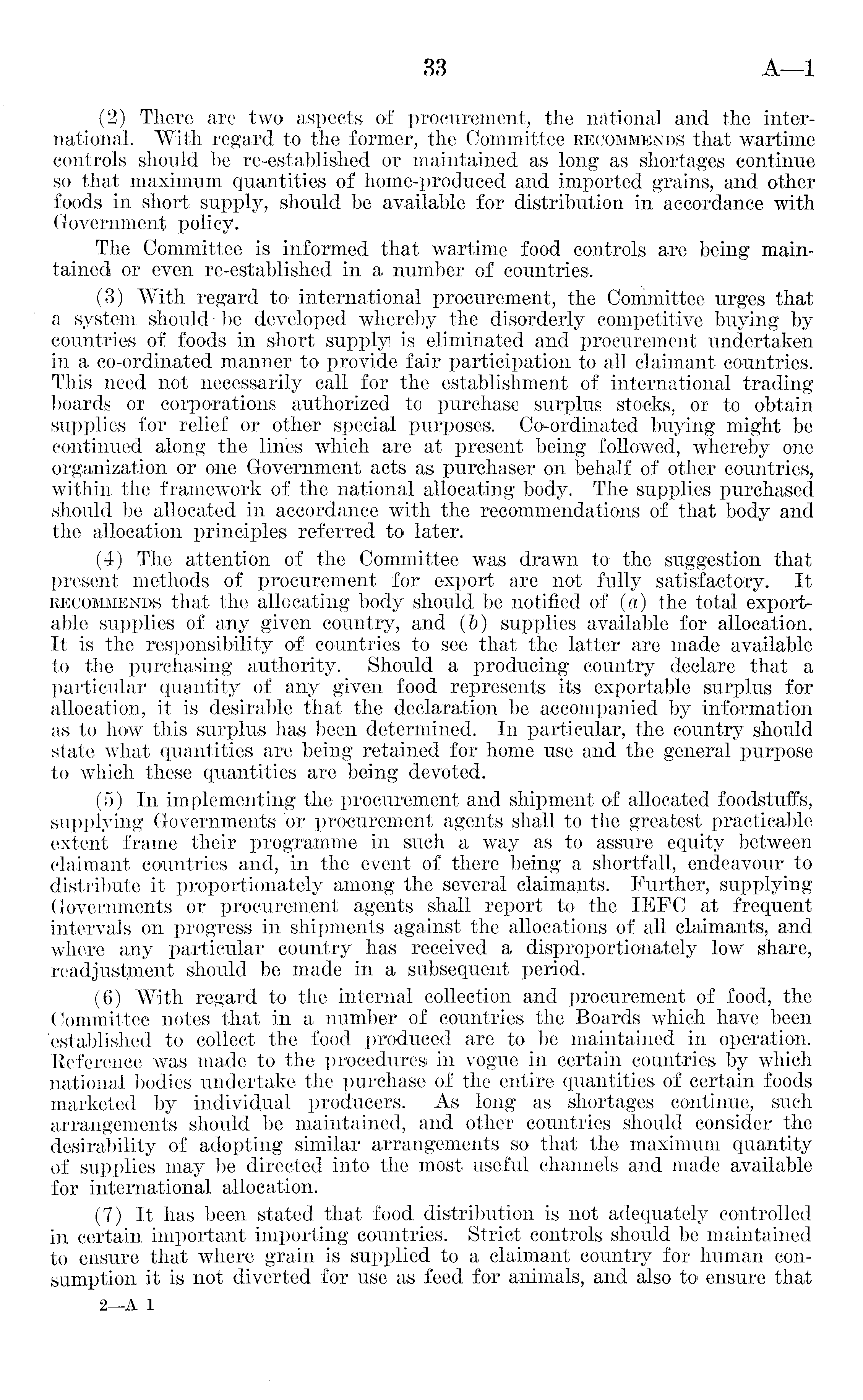 (2) There are two aspects of procurement, the national and the international. With regard to the former, the Committee recommends that wartime controls should be re-established or maintained as long as shortages continue so that maximum quantities of home-produced and imported grains, and other foods in short supply, should be available for distribution in accordance with Government policy. The Committee is informed that wartime food controls are being maintained! or even re-established in a number of countries. (3) With regard to international procurement, the Committee urges that a system should be developed whereby the disorderly competitive buying by countries of foods in short supply is eliminated and procurement undertaken in a co-ordinated manner to provide fair participation to all claimant countries. This need not necessarily call for the establishment of international trading boards or corporations authorized to purchase surplus stocks, or to obtain supplies for relief or other special purposes. Co-ordinated buying might be continued along the lines which are at present being followed, whereby one organization or one Government acts as purchaser on behalf of other countries, within the framework of the national allocating body. The supplies purchased should be allbcated in accordance with the recommendations of that body and the allocation principles referred to later. (4) The attention of the Committee was drawn to the suggestion that present methods of procurement for export are not fully satisfactory. It recommends that the allocating body should be notified of (a) the total exportable supplies of any given country, and (5) supplies available for allocation. It is the responsibility of countries to see that the latter are made available to the purchasing authority. Should a producing country declare that a particular quantity of any given food represents its exportable surplus for allocation, it is desirable that the declaration be accompanied by information as to how this surplus has been determined. In particular, the country should state what quantities are being retained for home use and the general purpose to which these quantities are being devoted. (5) In implementing the procurement and shipment of allocated foodstuffs, supplying Governments or procurement agents shall to the greatest practicable extent frame their programme in such a way as to assure equity between claimant countries and, in the event of there being a shortfall, endeavour to distribute it proportionately among the several claimants. Further, supplying Governments or procurement agents shall report to the lEFC at frequent intervals on progress in shipments against the allocations of all claimants, and where any particular country has received a disproportionately low share, readjustment should be made in a subsequent period. (6) With regard to the internal collection and procurement of food, the Committee notes that in a number of countries the Boards which have been established to collect the food produced are to be maintained in operation. Reference was made to the procedures in vogue in certain countries by which national bodies undertake the purchase of the entire quantities of certain foods marketed by individual producers. As long as shortages continue, such arrangements should be maintained, and other countries should consider the desirability of adopting similar arrangements so that the maximum quantity of supplies may be directed into the most useful channels and made available for international allocation. (7) It has been stated that food distribution is not adequately controlled in certain important importing countries. Strict controls should be maintained to ensure that where grain is supplied to a claimant country for human consumption it is not diverted for use as feed for animals, and also to ensure that