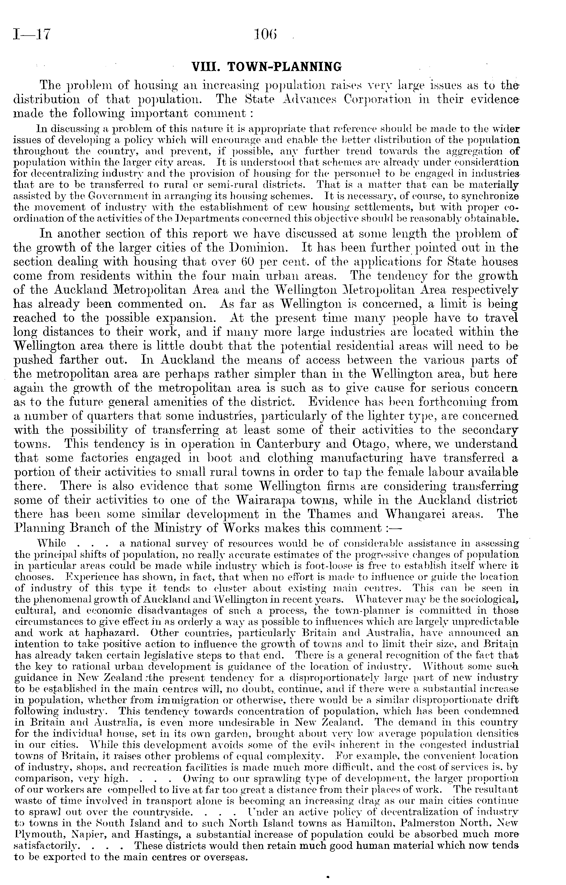 VIII. TOWN-PLANNING The problem of housing ail increasing population raises very large issues as to the distribution of that population. The State Advances Corporation in their evidence made the following important comment: In discussing a problem of this nature it is appropriate that reference should be made to the wider issues of developing a policy which will encourage and enable the better distribution of the population throughout the country, and prevent, if possible, any further trend towards the aggregation of population within the larger city areas. It is understood that schemes are already under consideration for decentralizing industry and the provision of housing for the personnel to be engaged in industries that are to be transferred to rural or semi-rural districts. That is a matter that can be materially assisted by the Government in arranging its housing schemes. It is necessary, of course, to synchronize the movement of industry with the establishment of new housing settlements, but with proper coordination of the activities of the Departments concerned this objective should be reasonably obtainable. In another section of this report we have discussed at some length the problem of the growth of the larger cities of the Dominion. It has been further pointed out in the section dealing with housing that over 60 per cent, of the applications for State houses come from residents within the four main urban areas. The tendency for the growth of the Auckland Metropolitan Area and the Wellington Metropolitan Area respectively has already been commented on. As far as Wellington is concerned, a limit is being reached to the possible expansion. At the present time many people have to travel long distances to their work, and if many more large industries are located within the Wellington area there is little doubt that the potential residential areas will need to be pushed farther out. In Auckland the means of access between the various parts of the metropolitan area are perhaps rather simpler than in the Wellington area, but here again the growth of the metropolitan area is such as to give cause for serious concern as to the future general amenities of the district. Evidence has been forthcoming from a number of quarters that some industries, particularly of the lighter type, are concerned with the possibility of transferring at least some of their activities to the secondary towns. This tendency is in operation in Canterbury and Otago, where, we understand that some factories engaged in boot and clothing manufacturing have transferred a portion of their activities to small rural towns in order to tap the female labour available there. There is also evidence that some Wellington firms are considering transferring some of their activities to one of the Wairarapa towns, while in the Auckland district there has been some similar development in the Thames and Whangarei areas. The Planning Branch of the Ministry of Works makes this comment: — While ... a national survey of resources would be of considerable assistance in assessing the principal shifts of population, no really accurate estimates of the progressive, changes of population in particular areas could be made while industry which is foot-loose is free to establish itself where it chooses. Experience has shown, in fact, that when no effort is made to influence or guide the location of industry of this , type it tends to cluster about existing main centres. This can be seen in the phenomenal growth of Auckland and "Wellington in recent years. Whatever may be the cultural, and economic disadvantages of such a process, the town-planner is committed in those circumstances to give effect in as orderly a way as possible to influences which are largely unpredictable and work at haphazard. Other countries, particularly Britain and Australia, have announced an intention to take positive action to influence the growth of towns and to limit their size, and Britain has already taken certain legislative steps to that end. There is a general recognition of the fact that the key to rational urban development is guidance of the location of industry. Without some such guidance in New Zealand ;the present tendency for a disproportionately large part of new industry to be established in the main centres will, no doubt,, continue, and if there were a substantial increase in population, whether from immigration or otherwise, there would be a similar disproportionate drift following industry. This tendency towards concentration of population, which has been condemned in Britain and Australia, is even more undesirable in New Zealand. The demand in this country for the individual house, set in its own garden, brought about very low average population densitiesin our cities. While this development avoids some of the evils inherent in the congested industrial towns of Britain, it raises other problems of equal complexity. For example, the convenient location of industry, shops, and recreation facilities is made much more difficult, and the cost of services is, by comparison, very high. . . . Owing to our sprawling tj'pe of development, the larger proportion of our workers are compelled to live at far too great a distance from their places of work. The resultant waste of time involved in transport alone is becoming an increasing drag as our main cities continue to sprawl out over the countryside. . . ■ Under an active policy of decentralization of industry to towns in the South Island and to such North Island towns as Hamilton, Palmerston North, New Plymouth, Napier, and Hastings, a substantial increase of population could be absorbed much more satisfactorily. . . . These districts would then retain much good human material which now tends to be exported to the main centres or overseas.